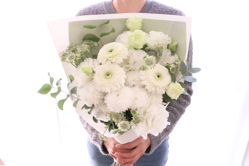 白色を基調とし、黄緑色のお花や葉物を入れて仕上げた優しい雰囲気の花束です。