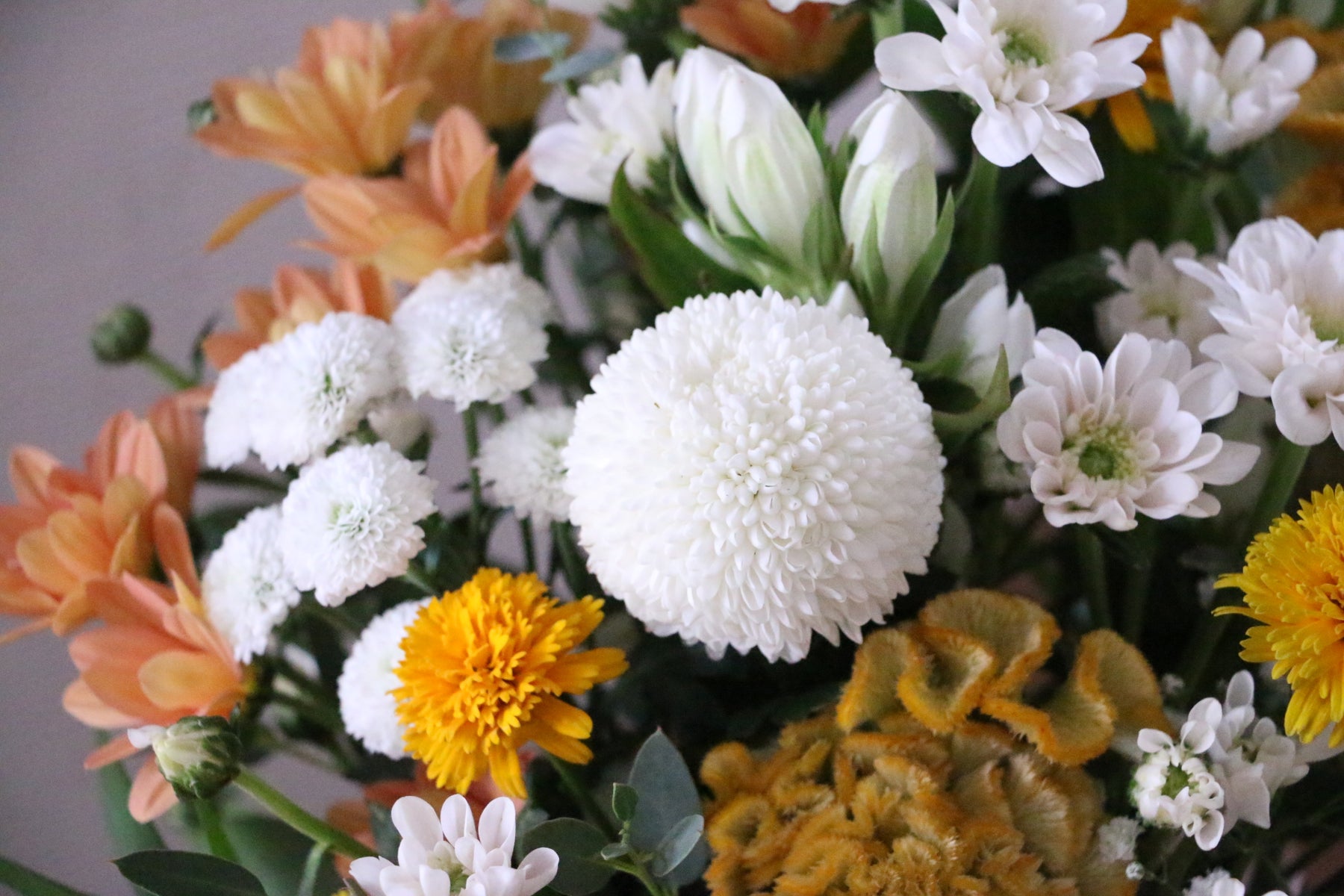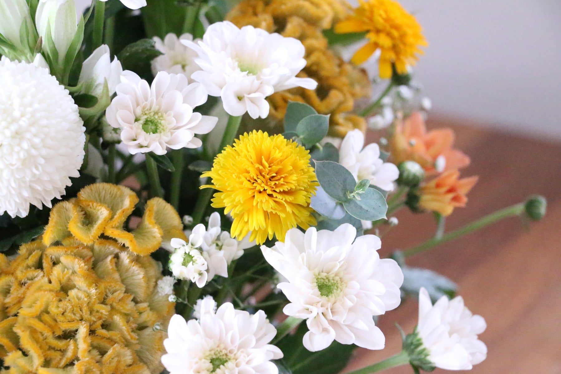 白色を基調とし、黄色や淡いオレンジ色のお花を入れて仕上げた優しい雰囲気のアレンジメントです。