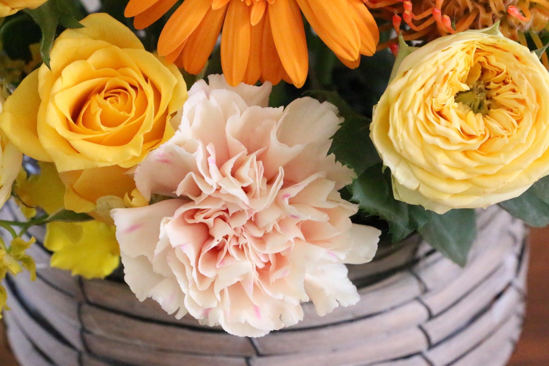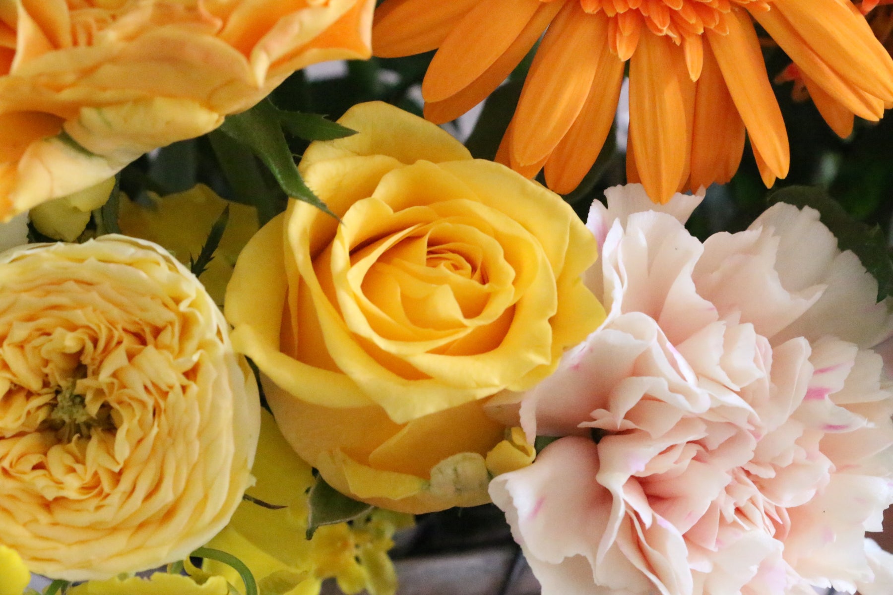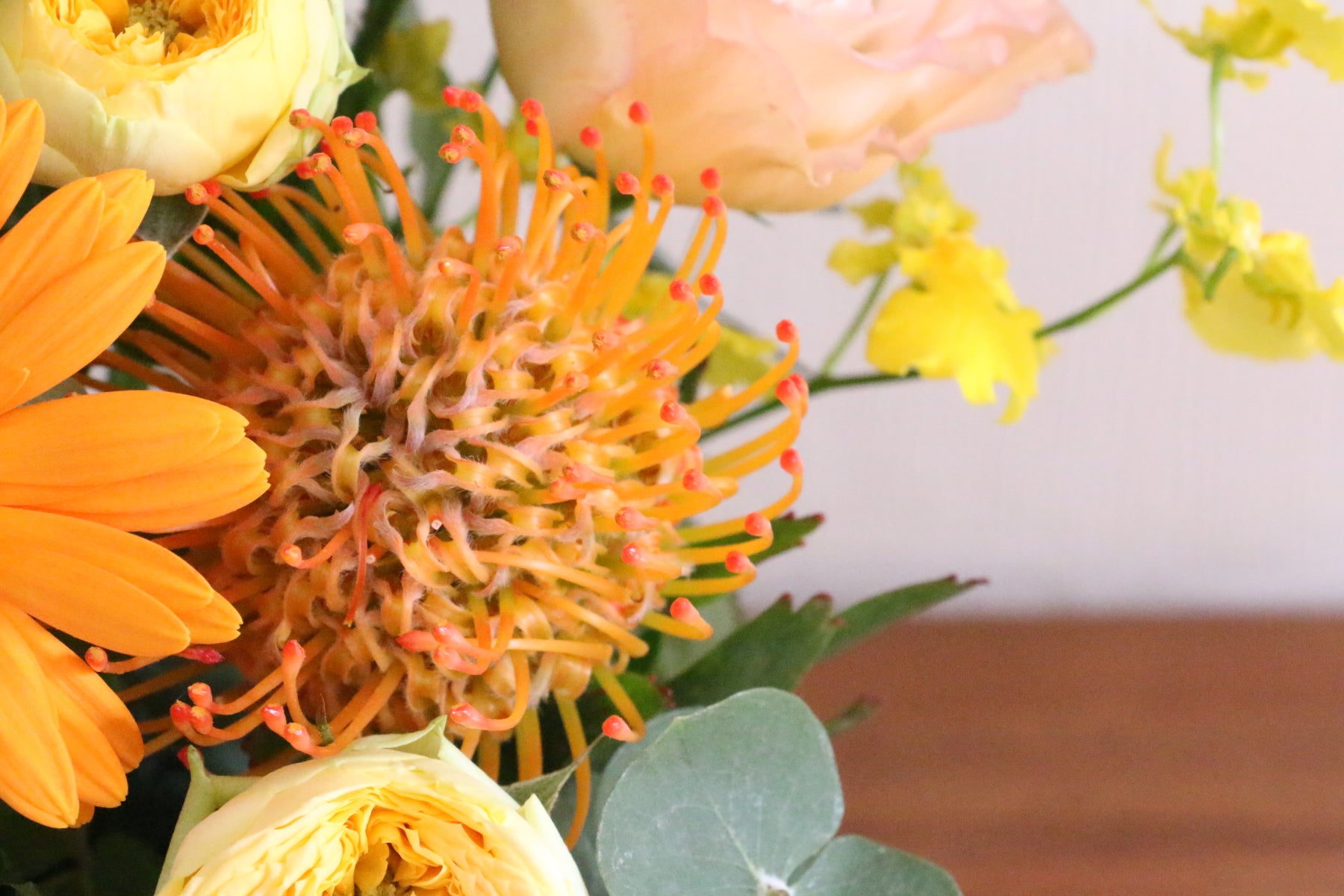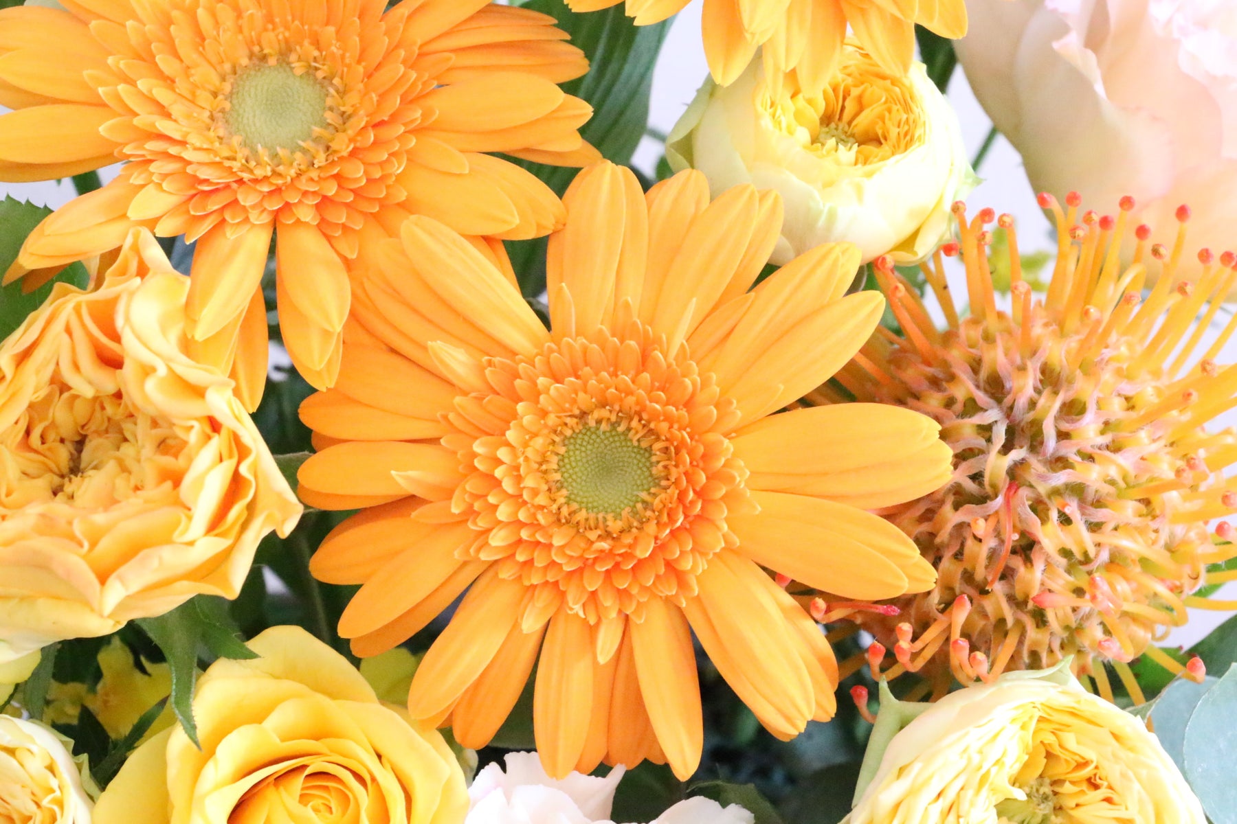 差し色に黄色・オレンジ色以外の色味(例:緑や白など)のお花を入れながら、黄色・オレンジ色で仕上げます。