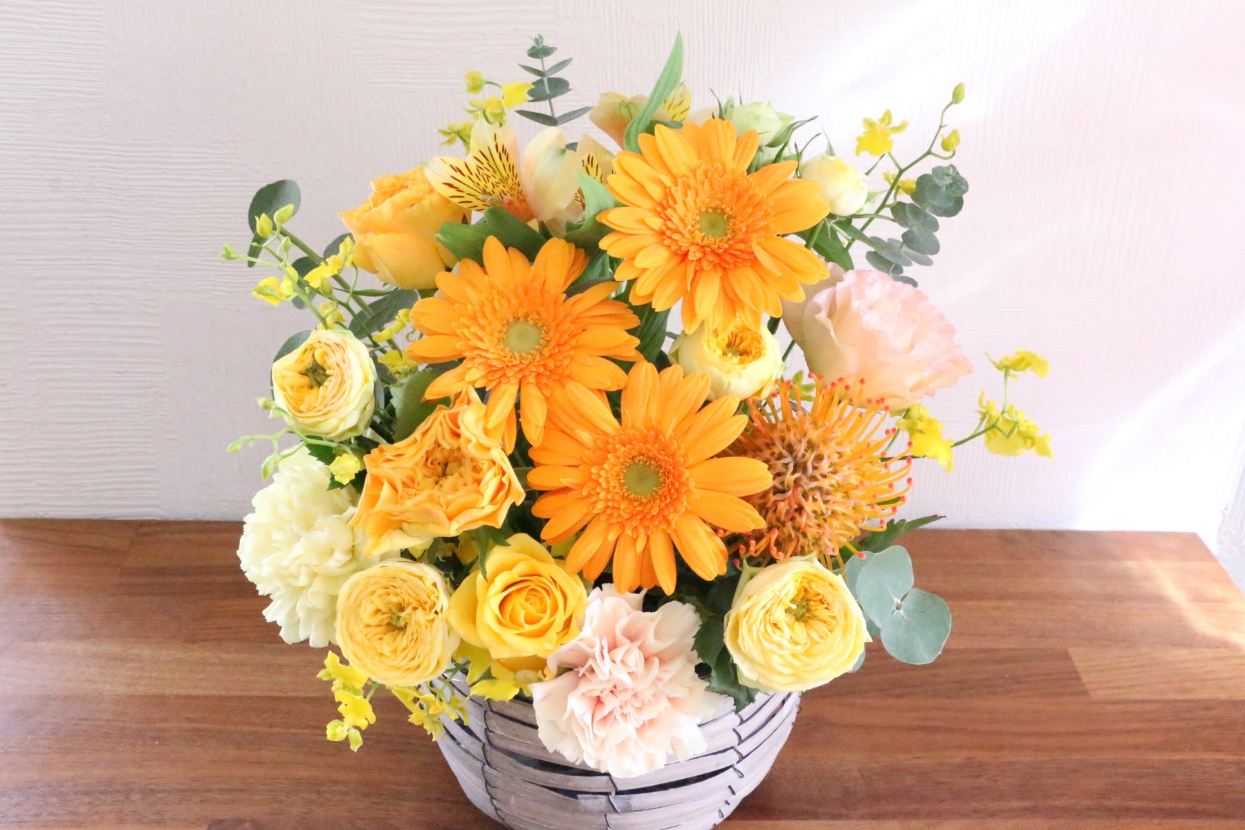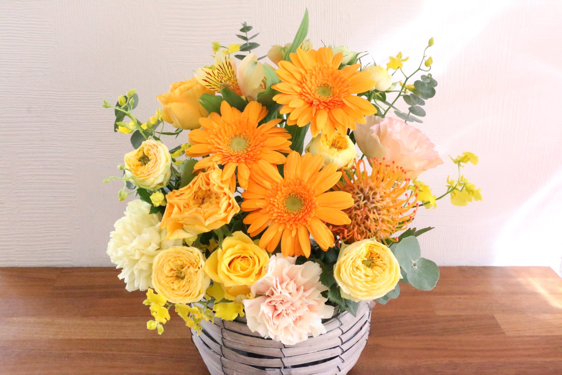黄色・オレンジ色のお花をベースに明るく元気な雰囲気で仕上げたアレンジメントです。