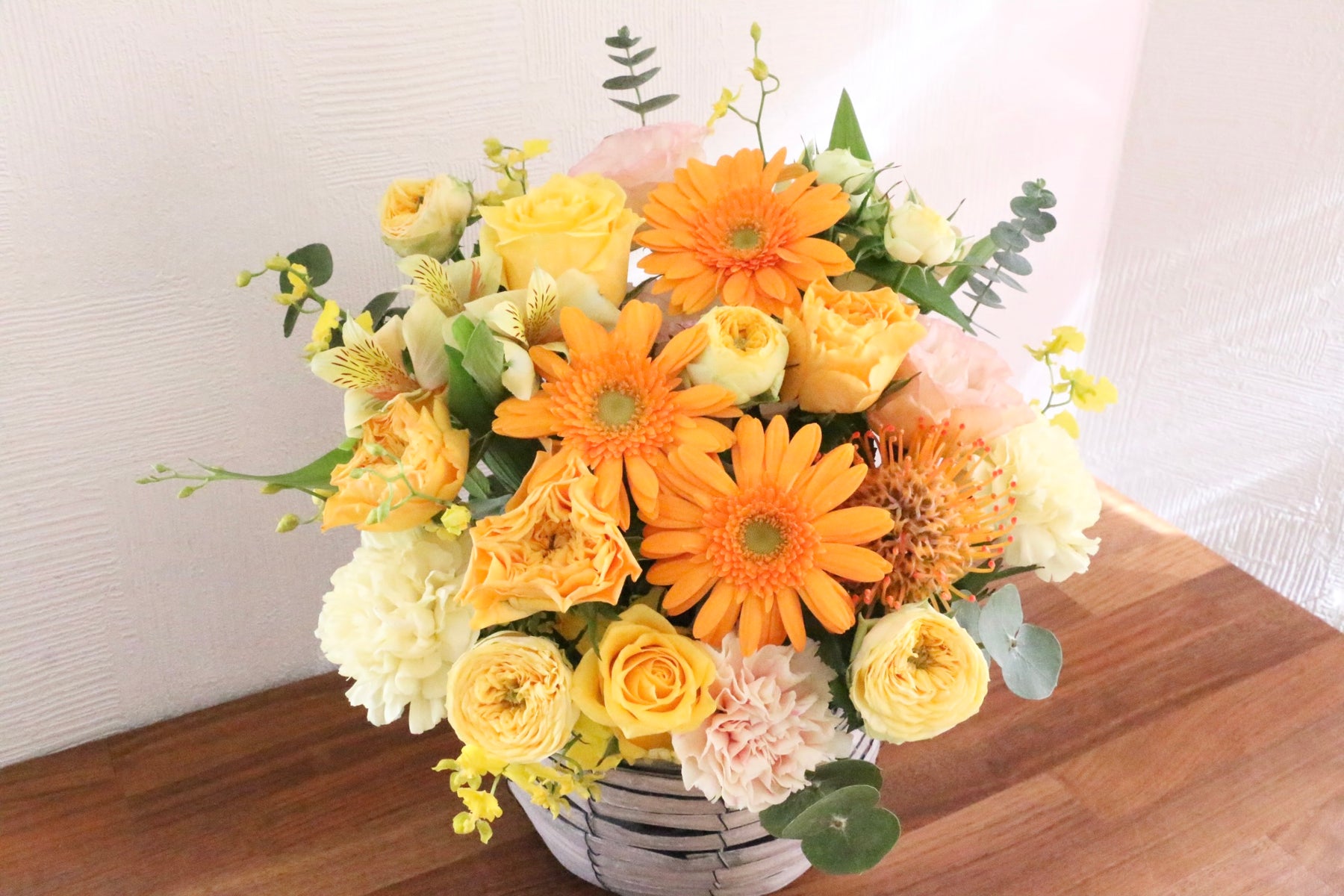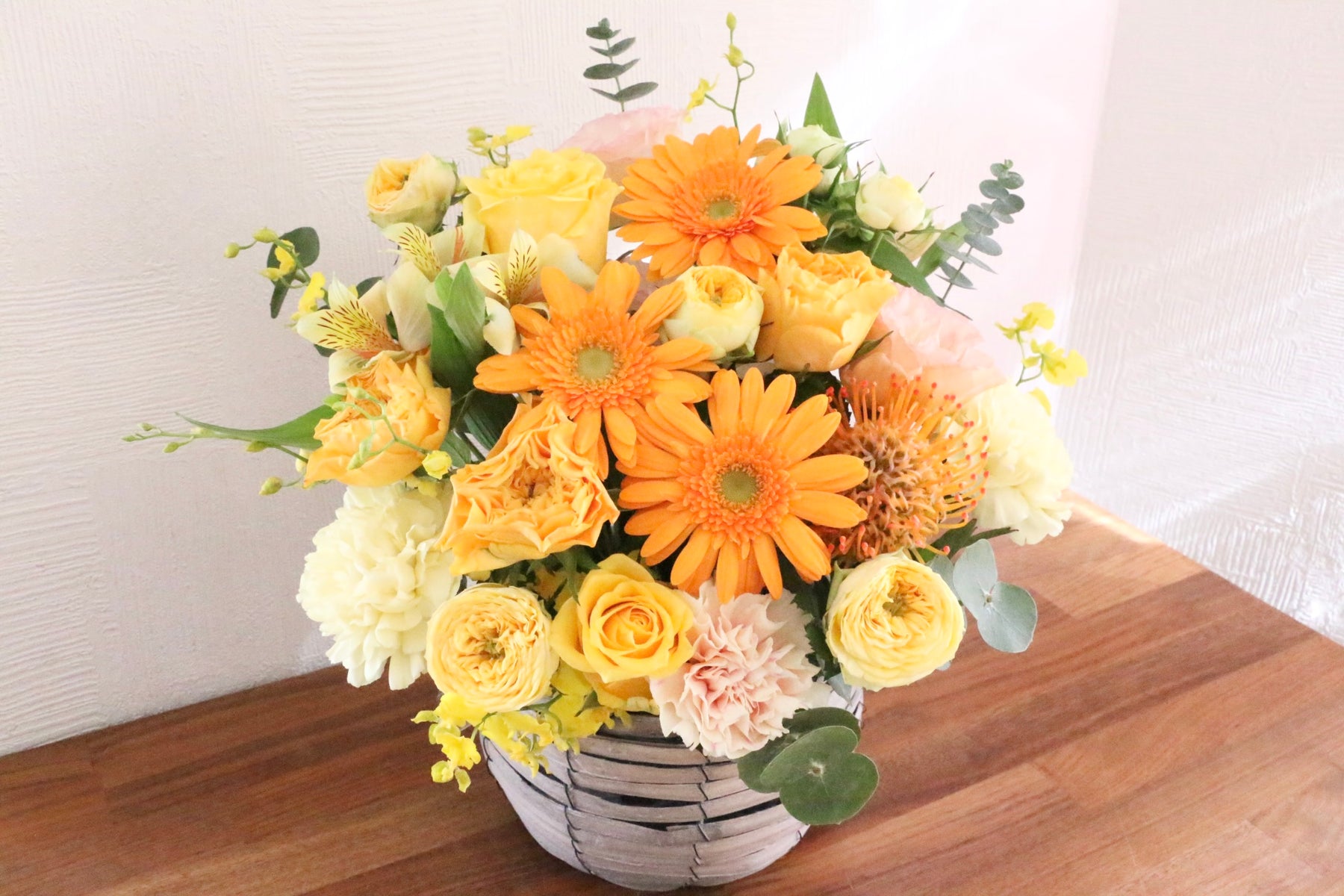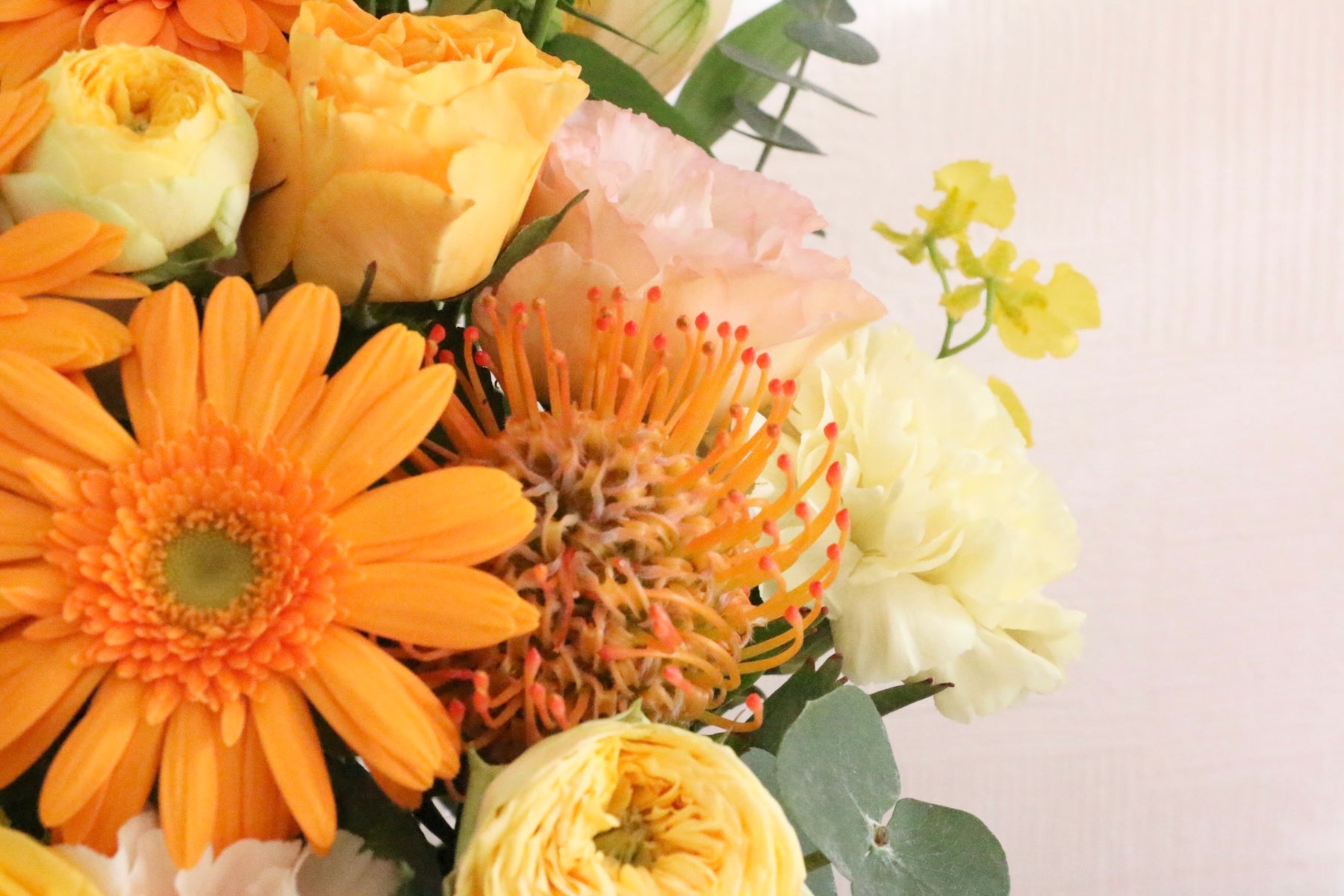 差し色に黄色・オレンジ色以外の色味(例:緑や白など)のお花を入れながら、黄色・オレンジ色で仕上げます。
