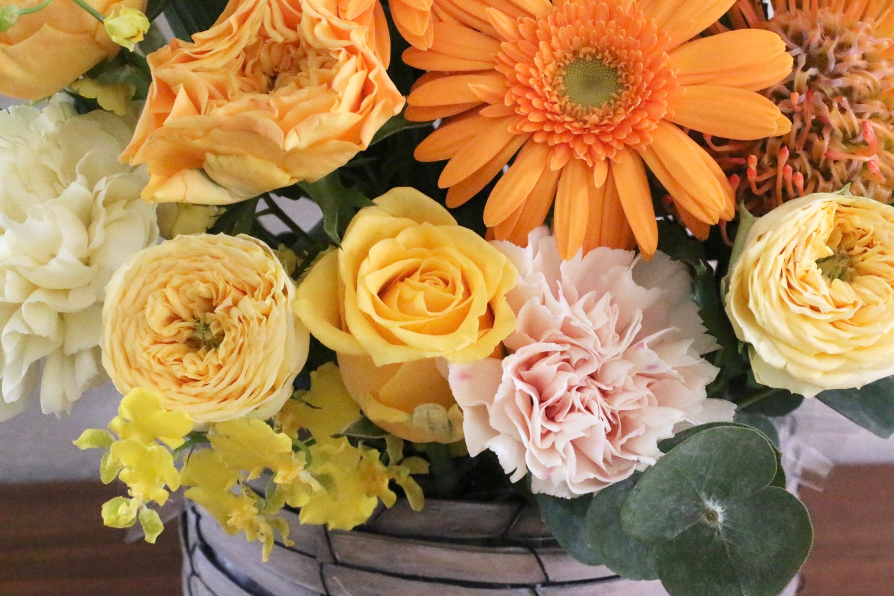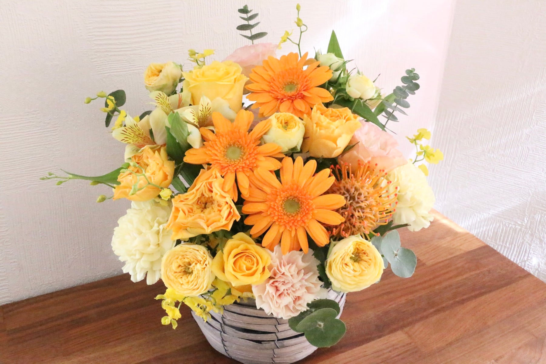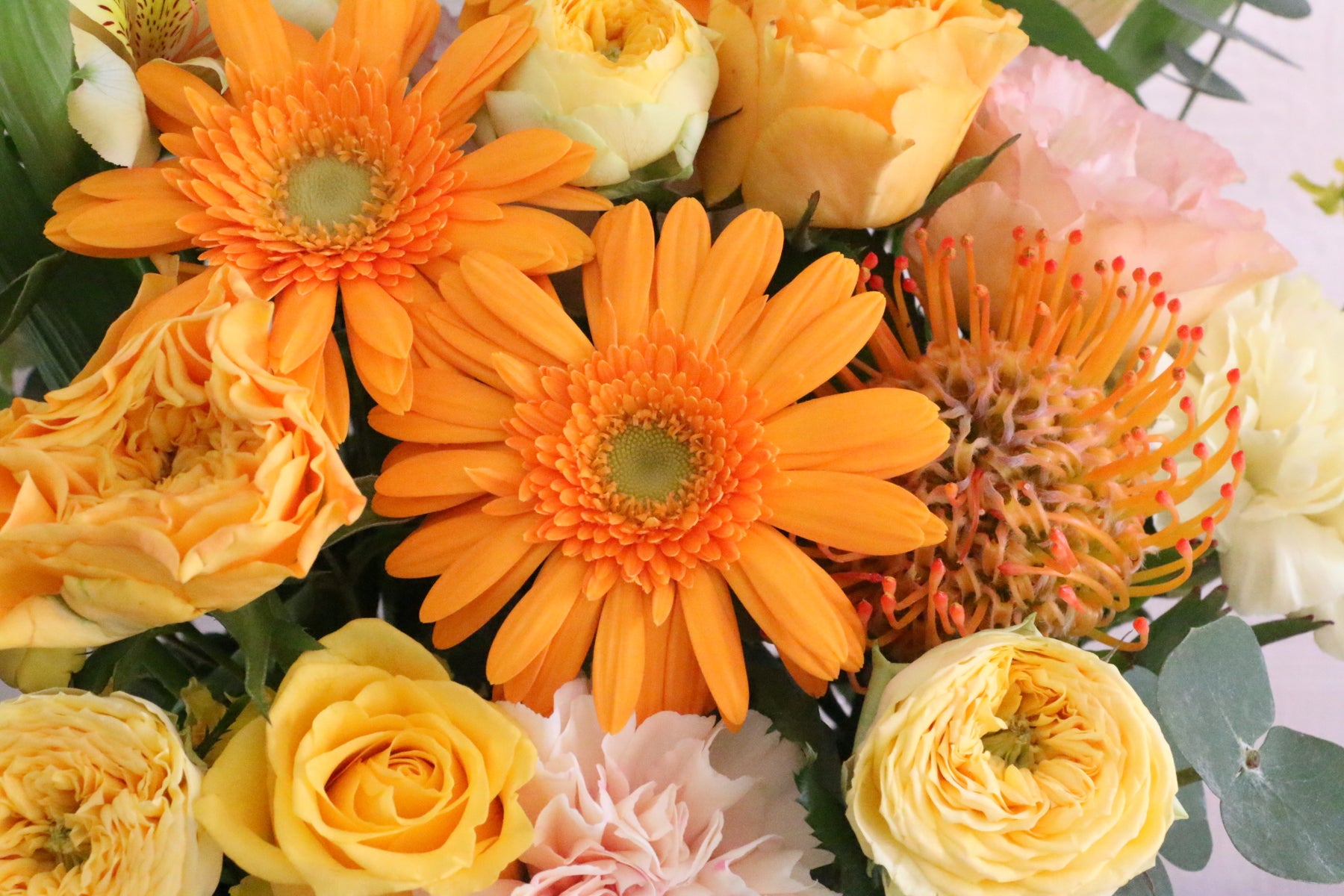差し色に黄色・オレンジ色以外の色味(例:緑や白など)のお花を入れながら、黄色・オレンジ色で仕上げます。