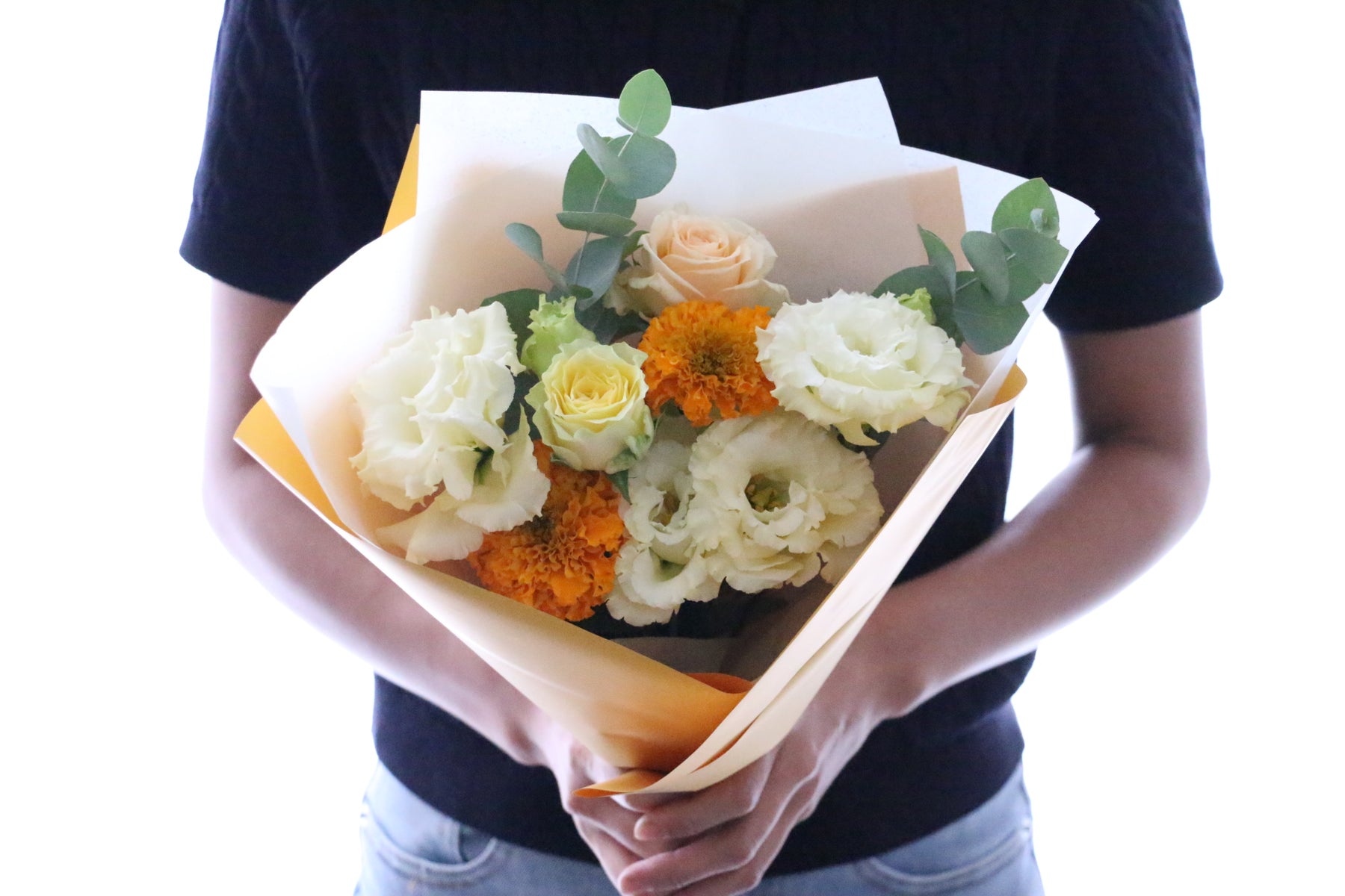 差し色に黄色・オレンジ色以外の色味(例:緑や白など)のお花を入れながら、黄色・オレンジ色でまとめます。