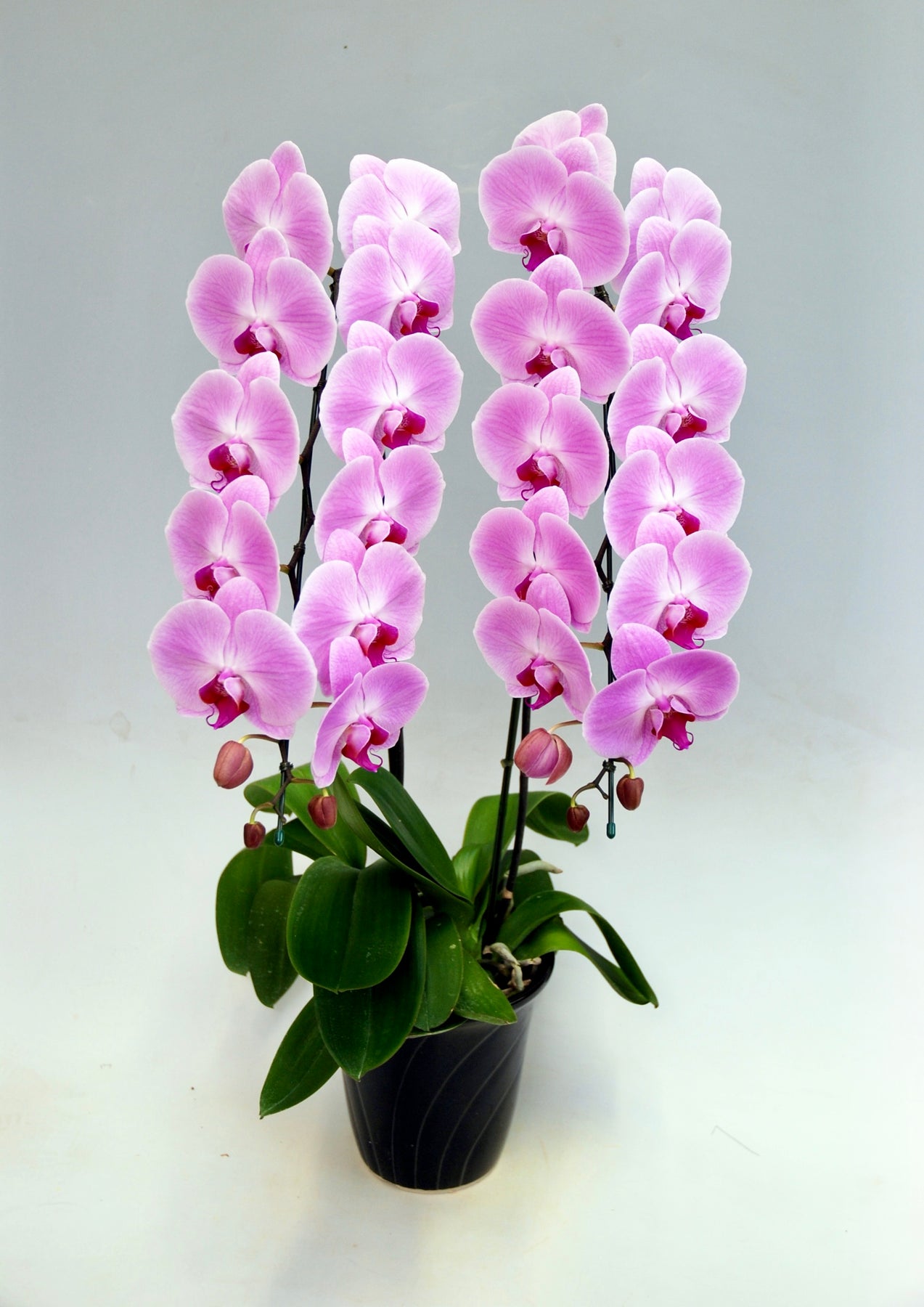 2本立ちで25~30輪前後(蕾含む)のピンク花タイプの大輪胡蝶蘭です。