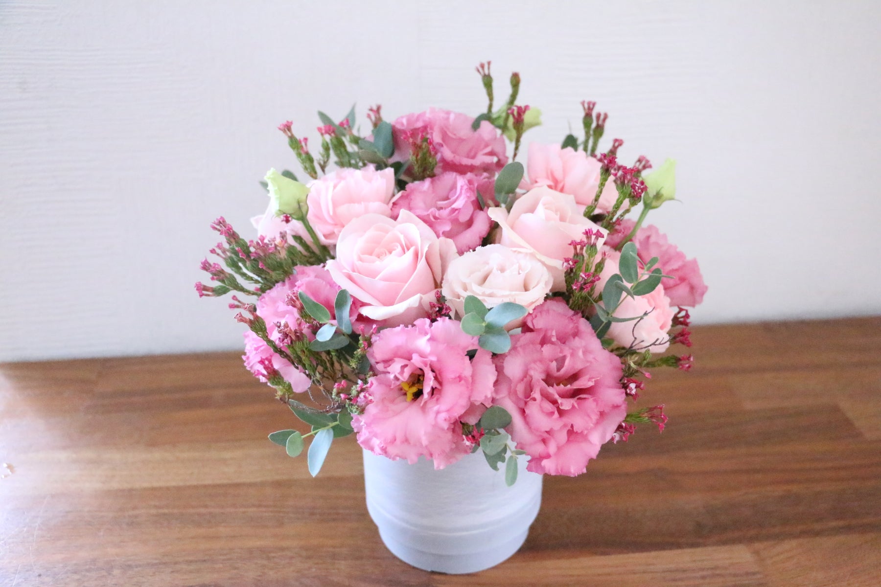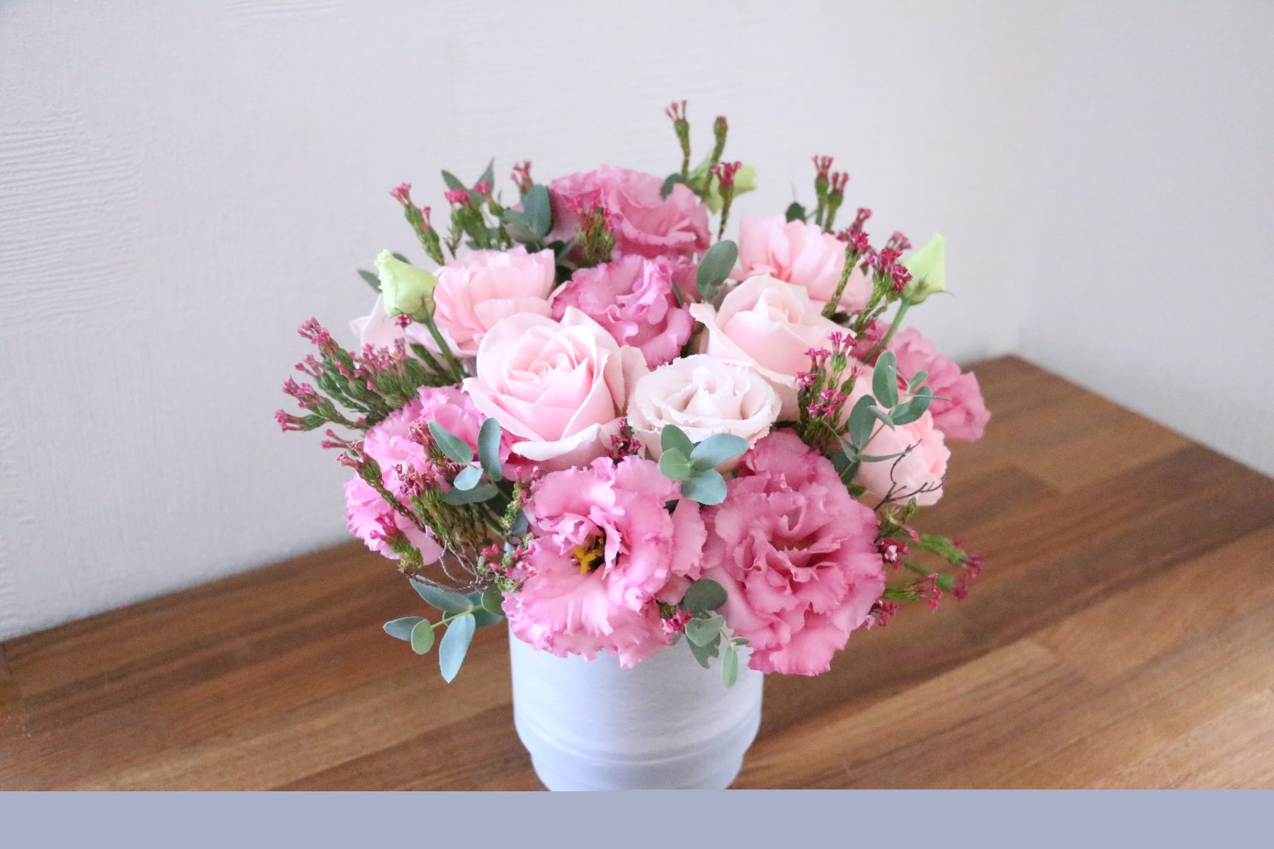 ピンク色のお花をベースに、かわいい雰囲気で仕上げたアレンジメントです。