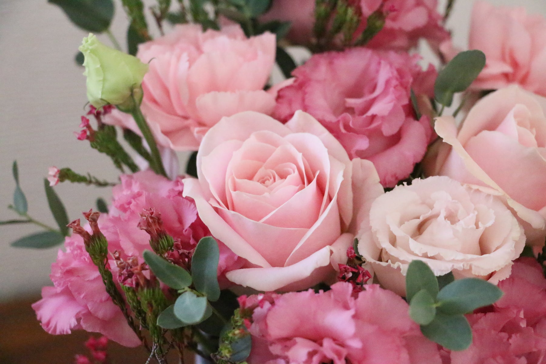 差し色にピンク以外の色味(例:赤や白)のお花などを入れながら、ピンク色をベースに仕上げます。