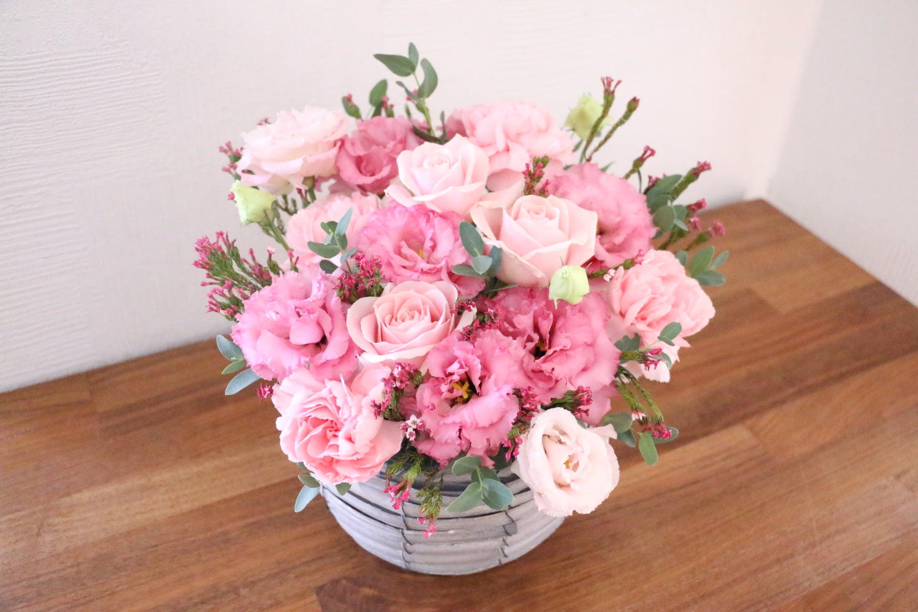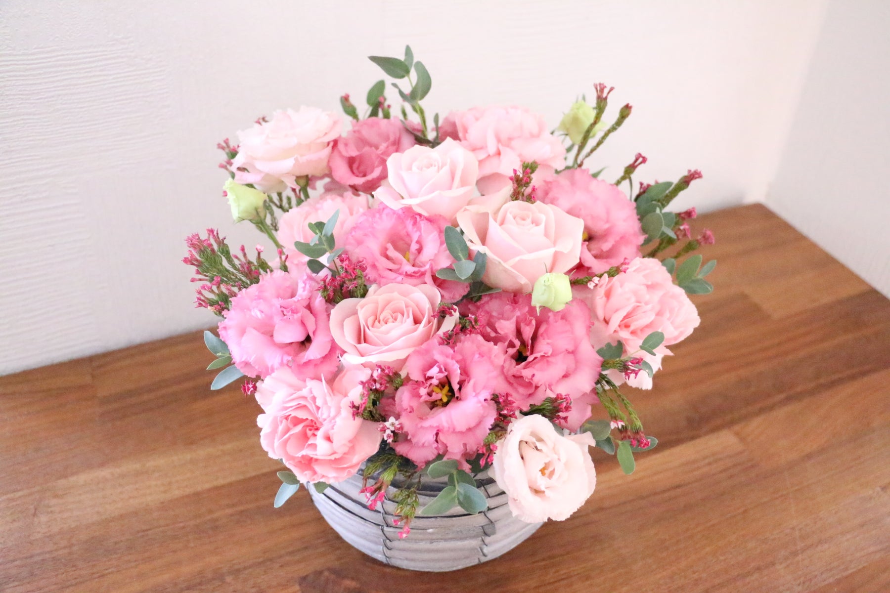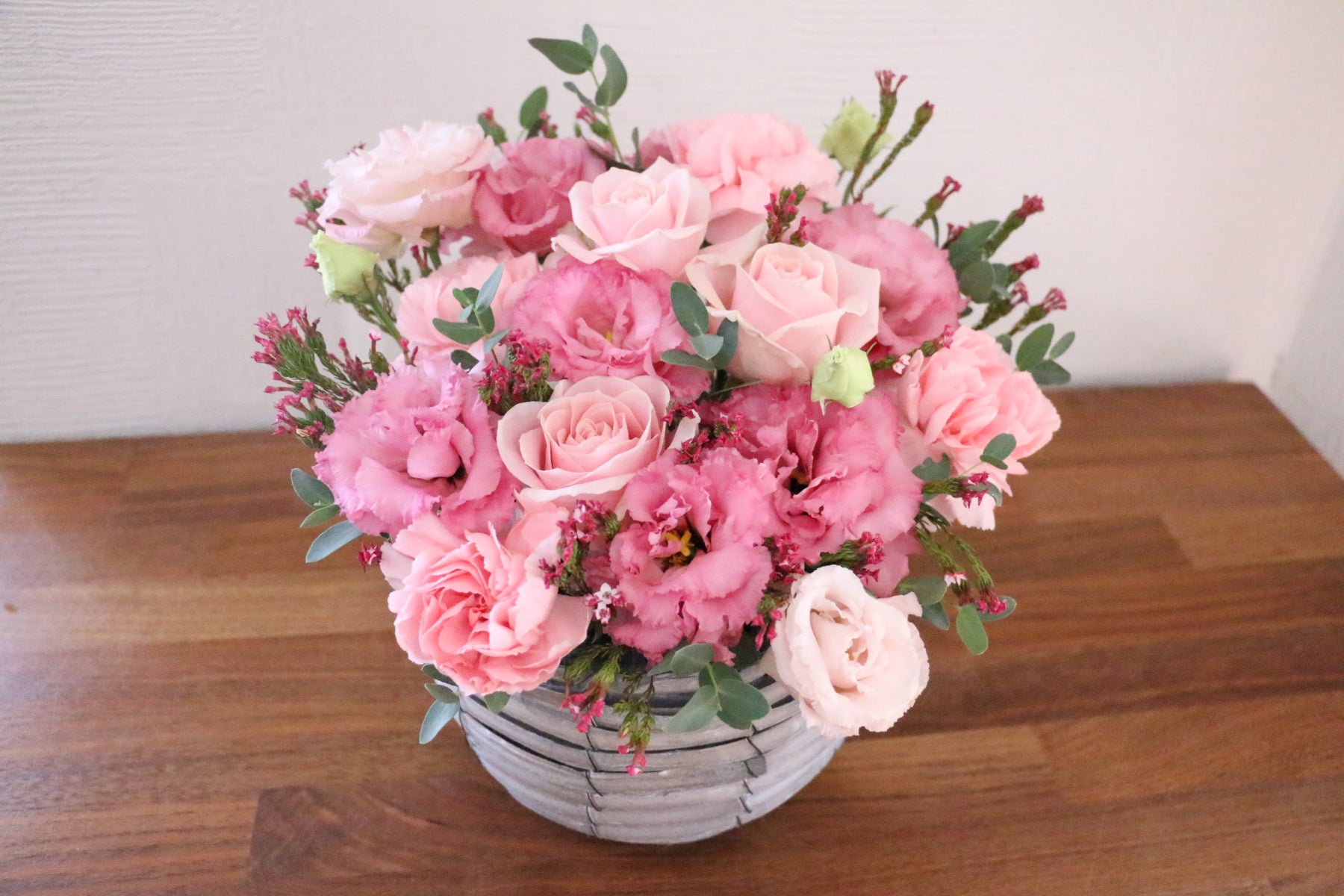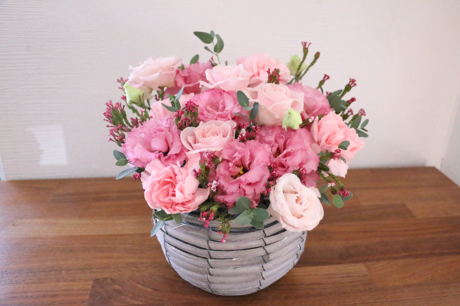 ピンク色のお花をベースに、かわいい雰囲気で仕上げたアレンジメントです。
