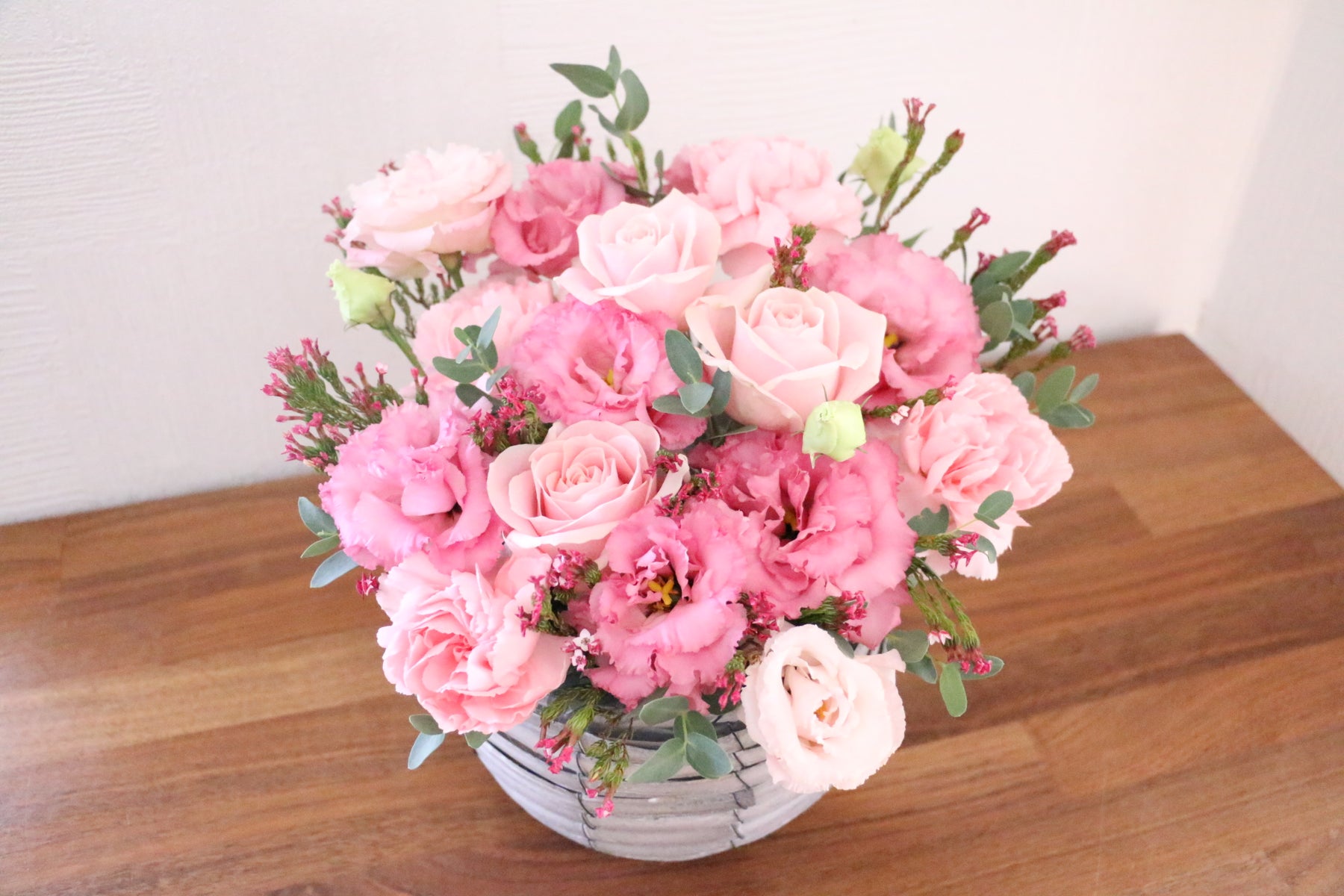 差し色にピンク以外の色味(例:赤や白)のお花などを入れながら、ピンク色をベースに仕上げます。