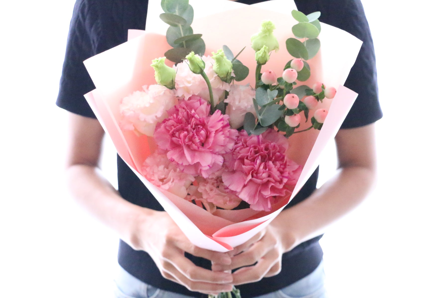 ピンク色のお花をベースにかわいい雰囲気で仕上げた花束です。