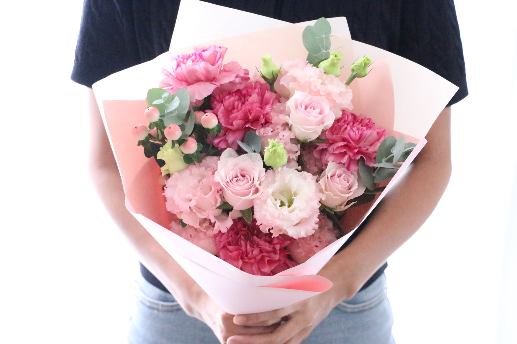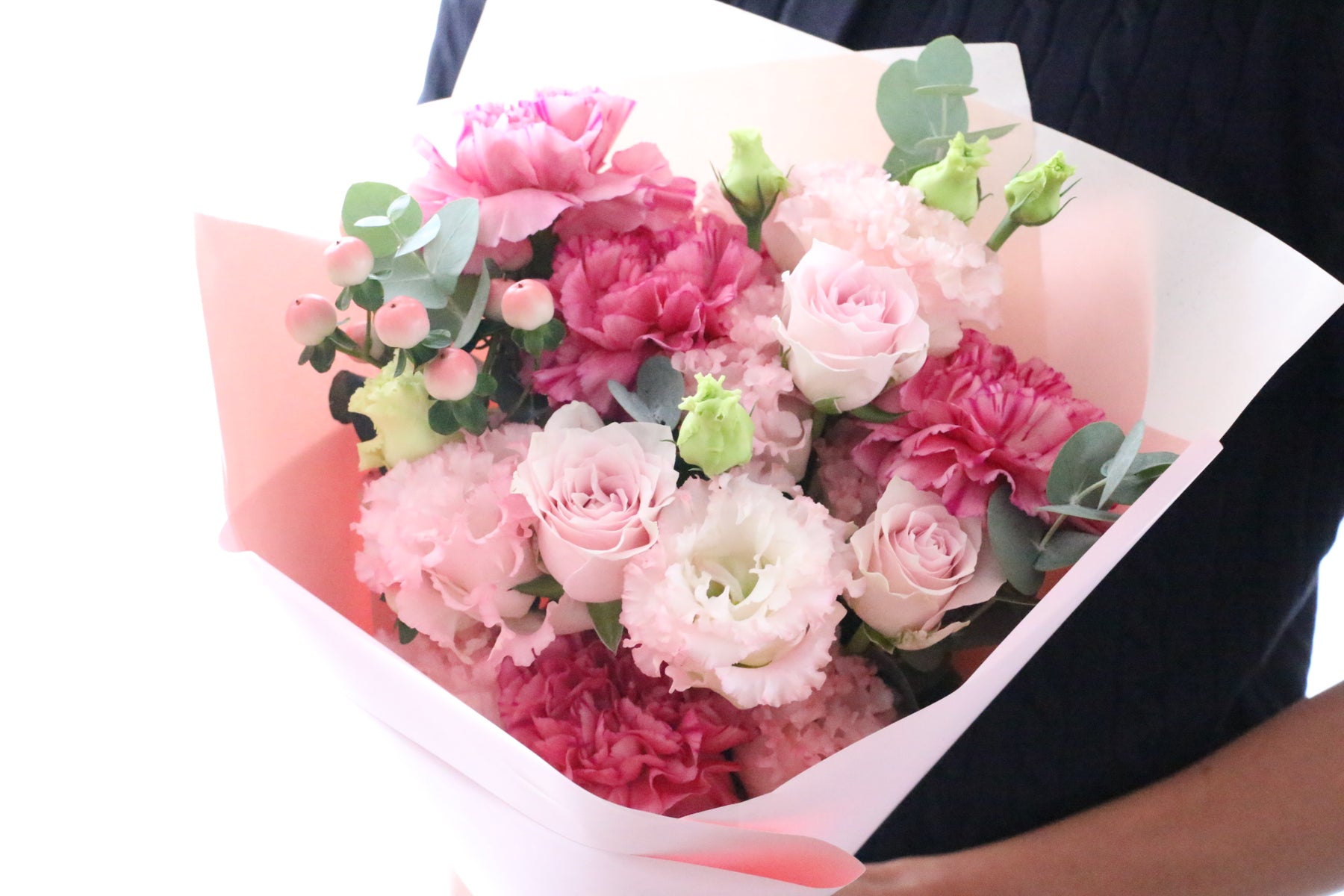 ピンク色のお花をベースにかわいい雰囲気で仕上げた花束です。