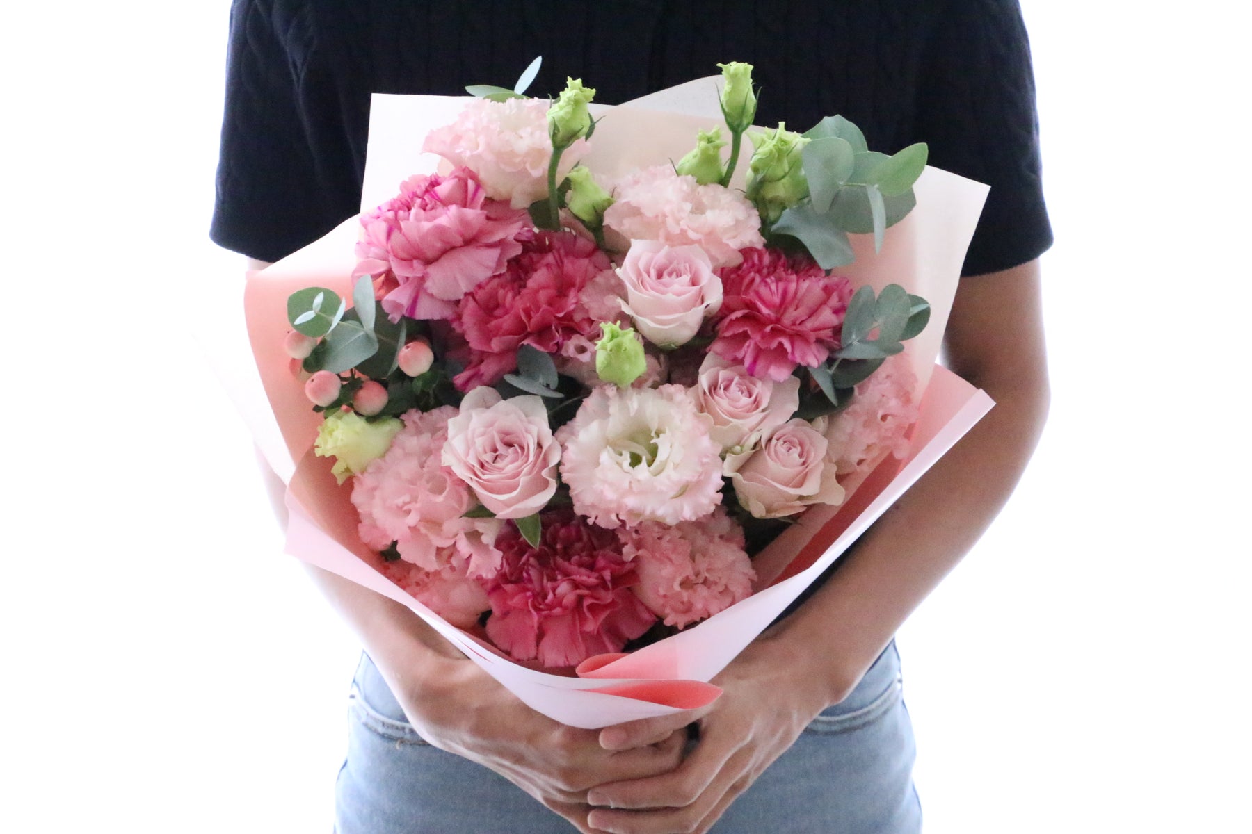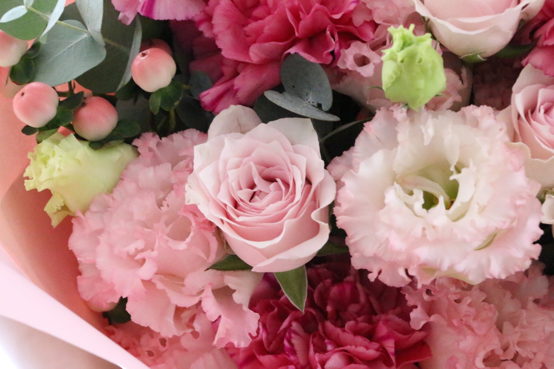 ピンク色のお花をベースにかわいい雰囲気で仕上げた花束です。