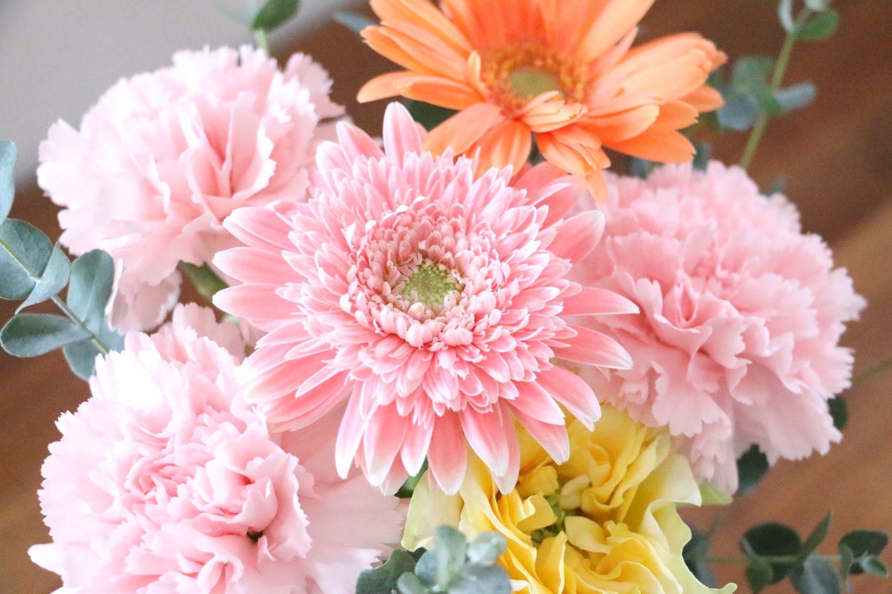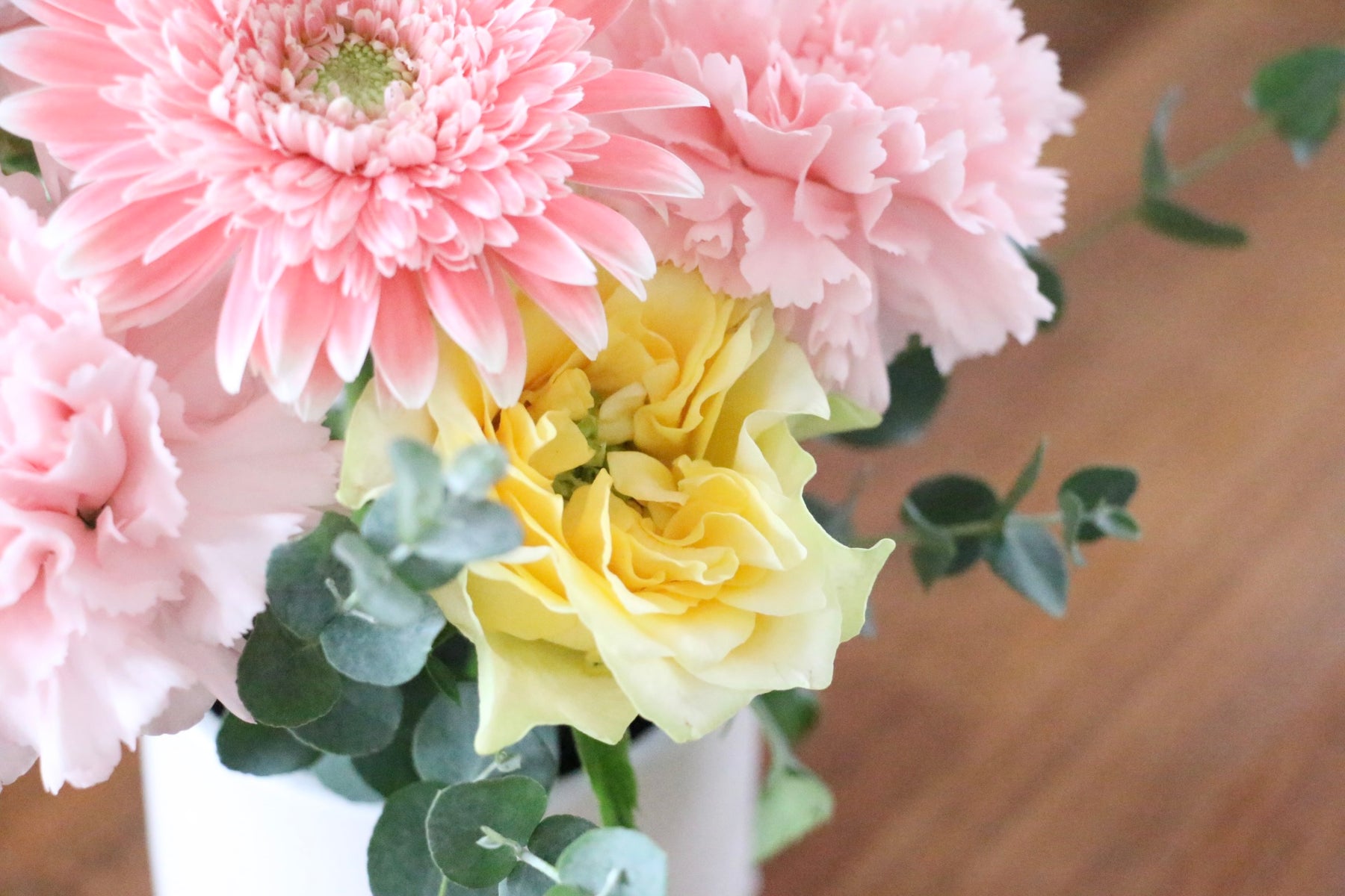 差し色にピンク色や黄色以外の色味(例:オレンジや白)のお花などを入れながら、ピンク色・黄色をベースに仕上げます。