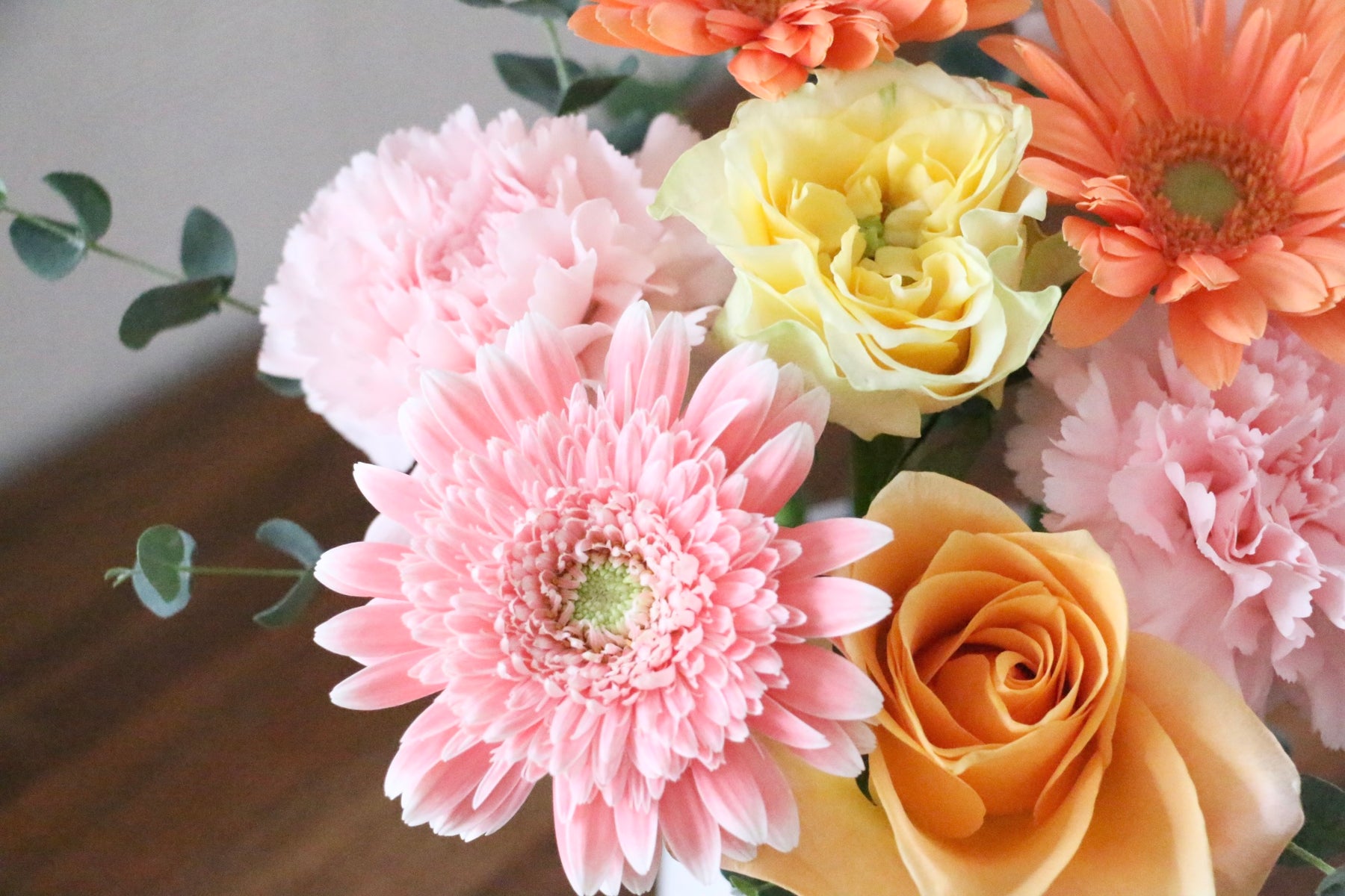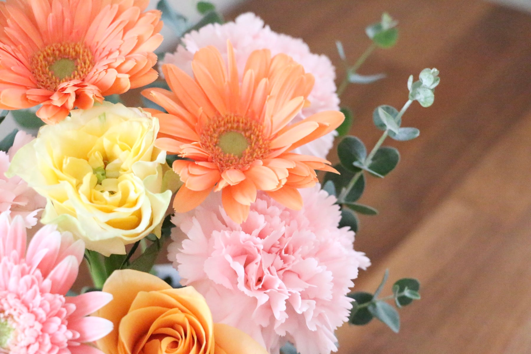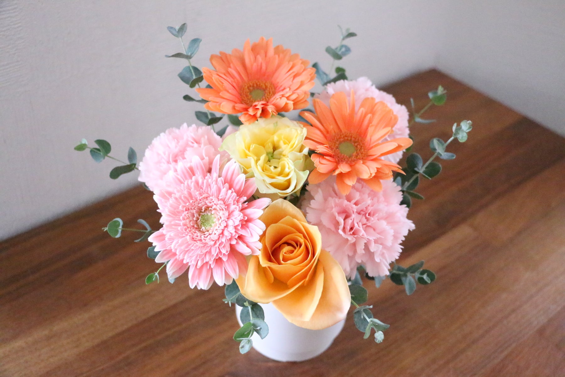 差し色にピンク色や黄色以外の色味(例:オレンジや白)のお花などを入れながら、ピンク色・黄色をベースに仕上げます。