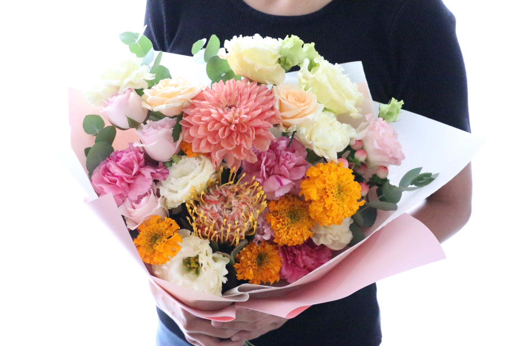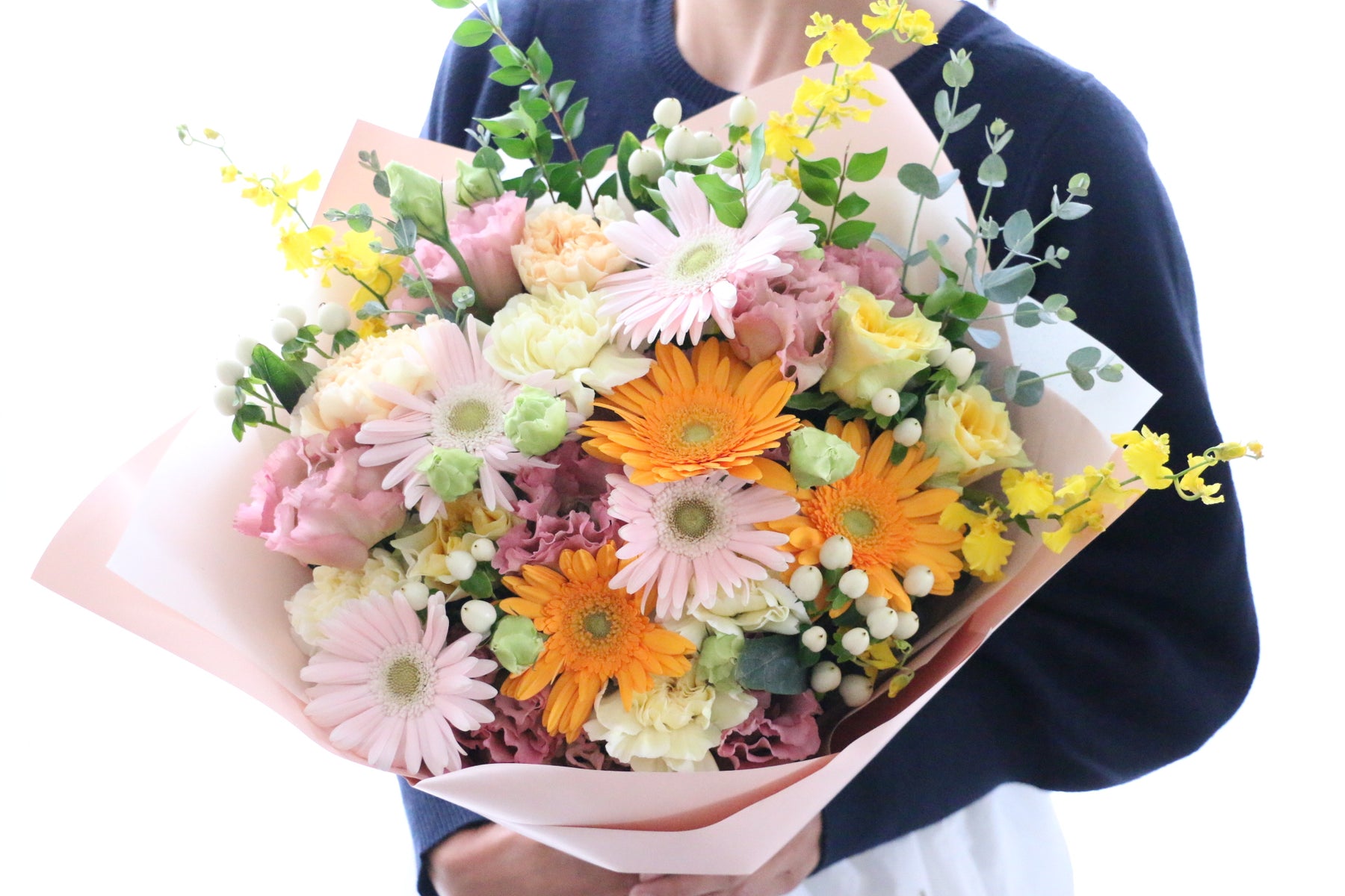 なお、こちらの花束は花材のご指定はございません。 発送直前に入荷した新鮮なお花でオリジナルの組み合わせでお作り致します。 そのため、商品写真はイメージで、写真通りの花束が届くものではございません。