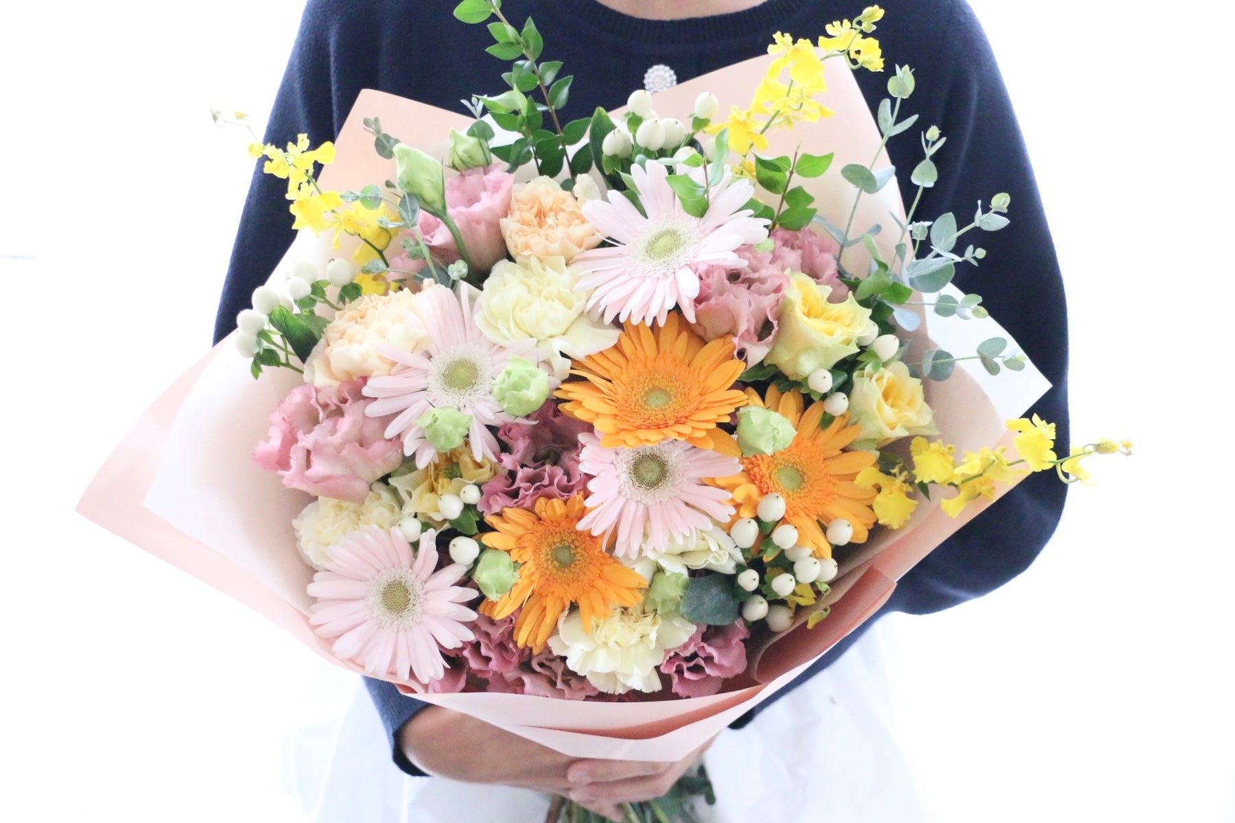 ピンク色・黄色のお花をベースに、明るく可愛い雰囲気で仕上げた花束です。