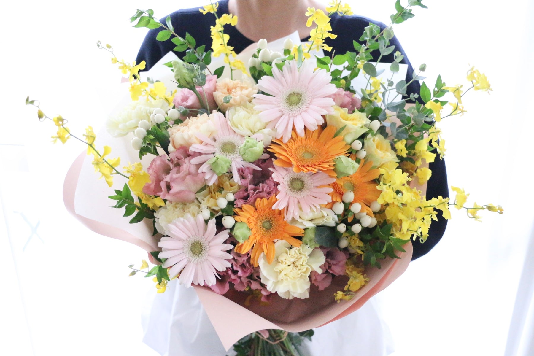 差し色にピンク色や黄色以外の色味(例:オレンジや白)のお花などを入れながら、ピンク色・黄色をベースに仕上げます。