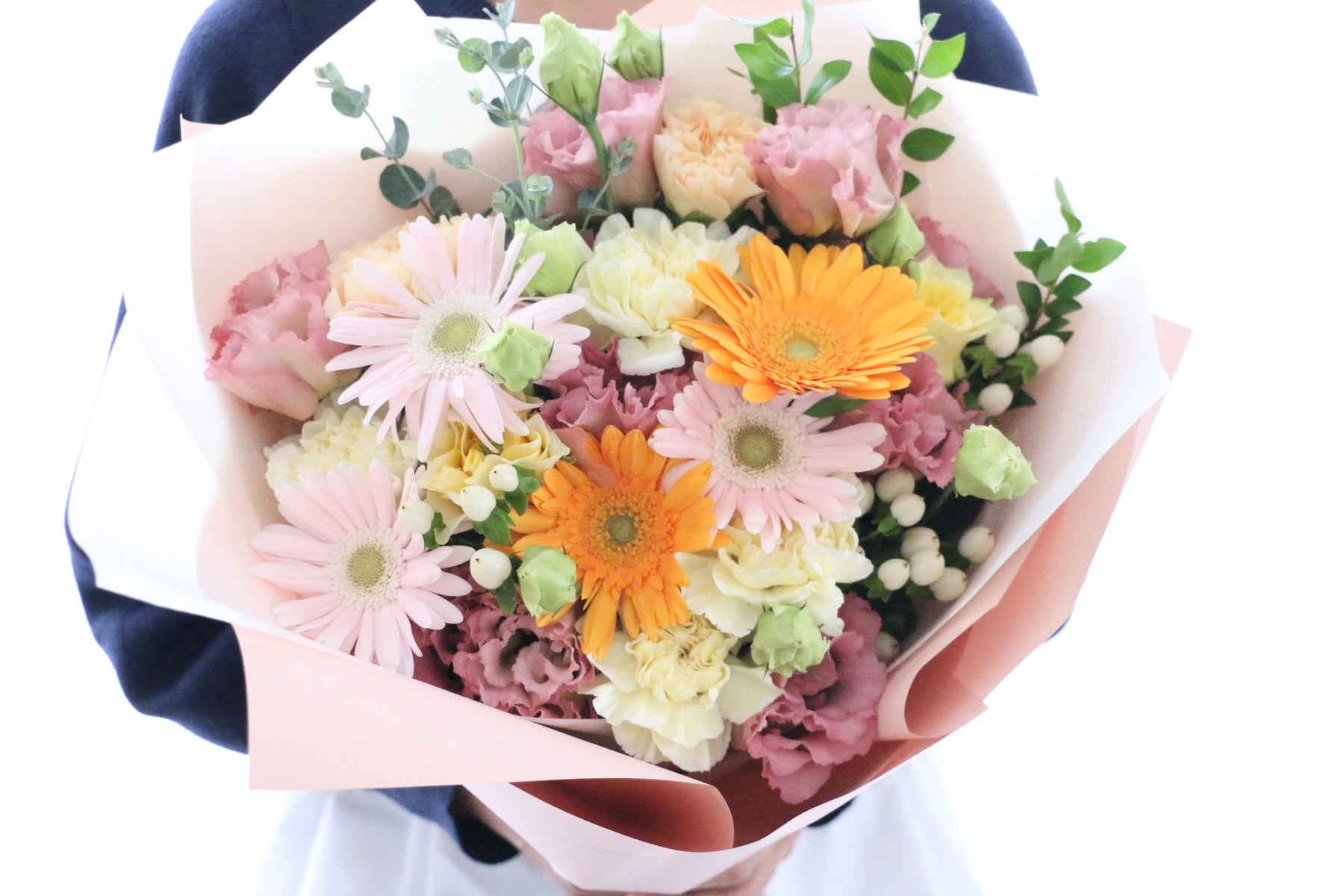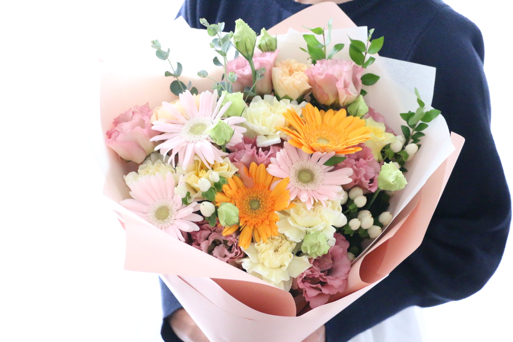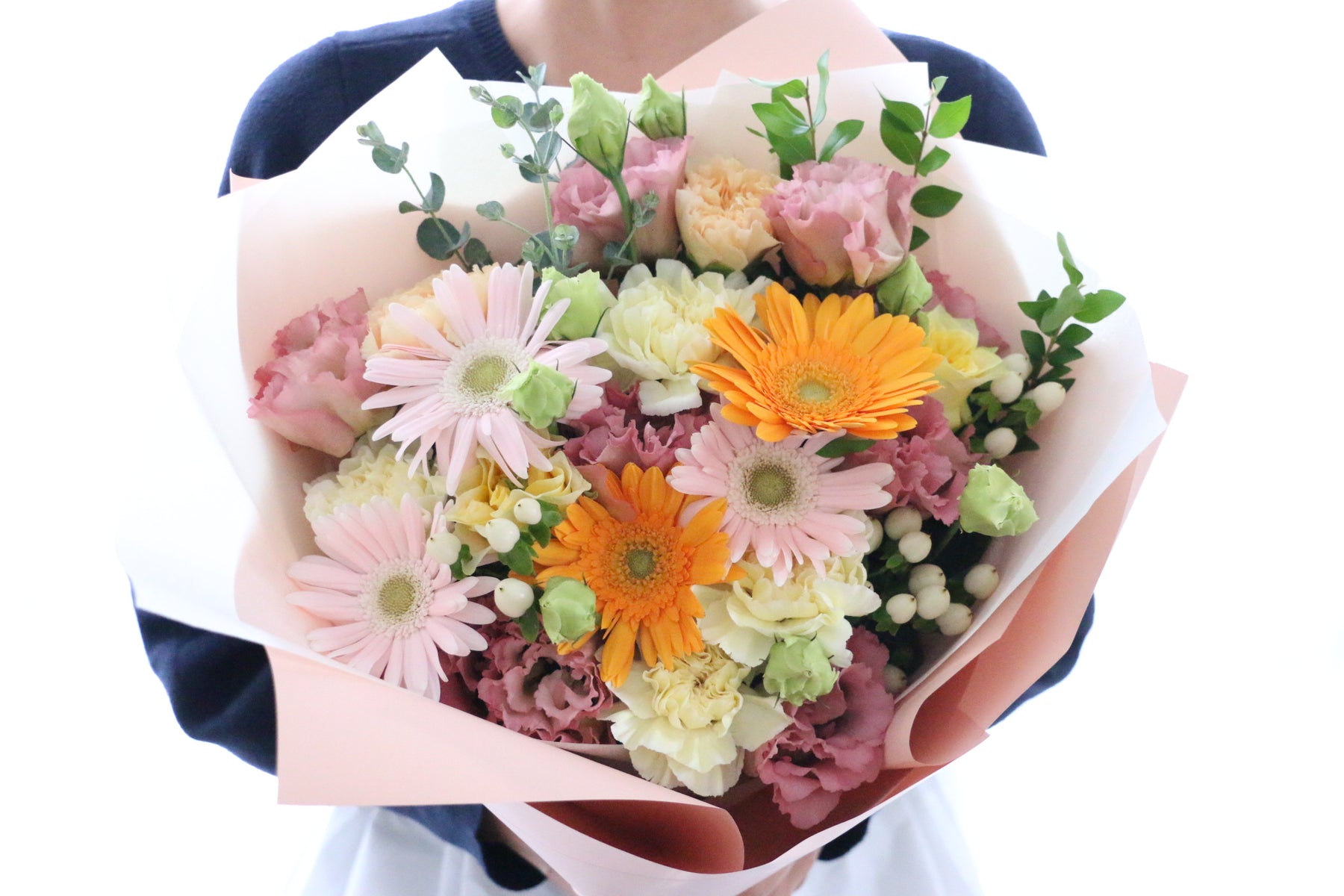 なお、こちらの花束は花材のご指定はございません。 発送直前に入荷した新鮮なお花でオリジナルの組み合わせでお作り致します。 そのため、商品写真はイメージで、写真通りの花束が届くものではございません。