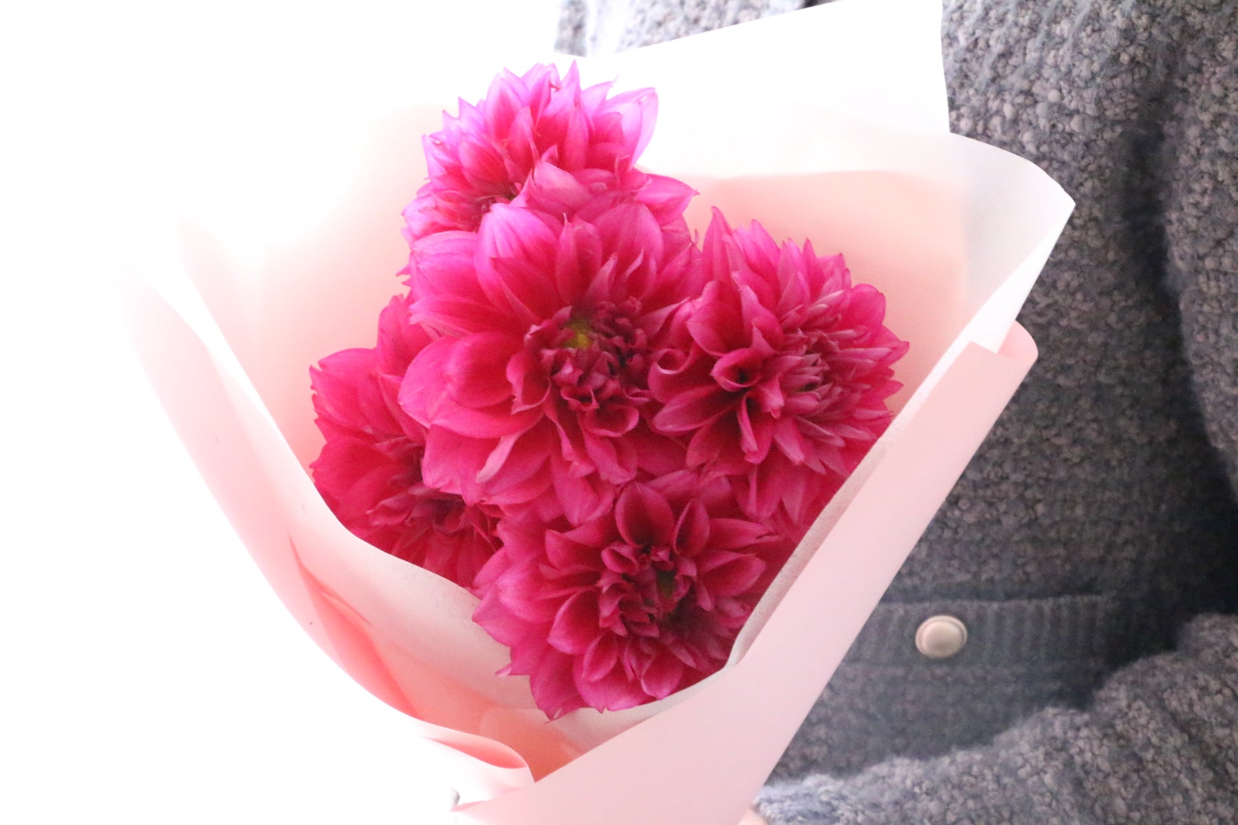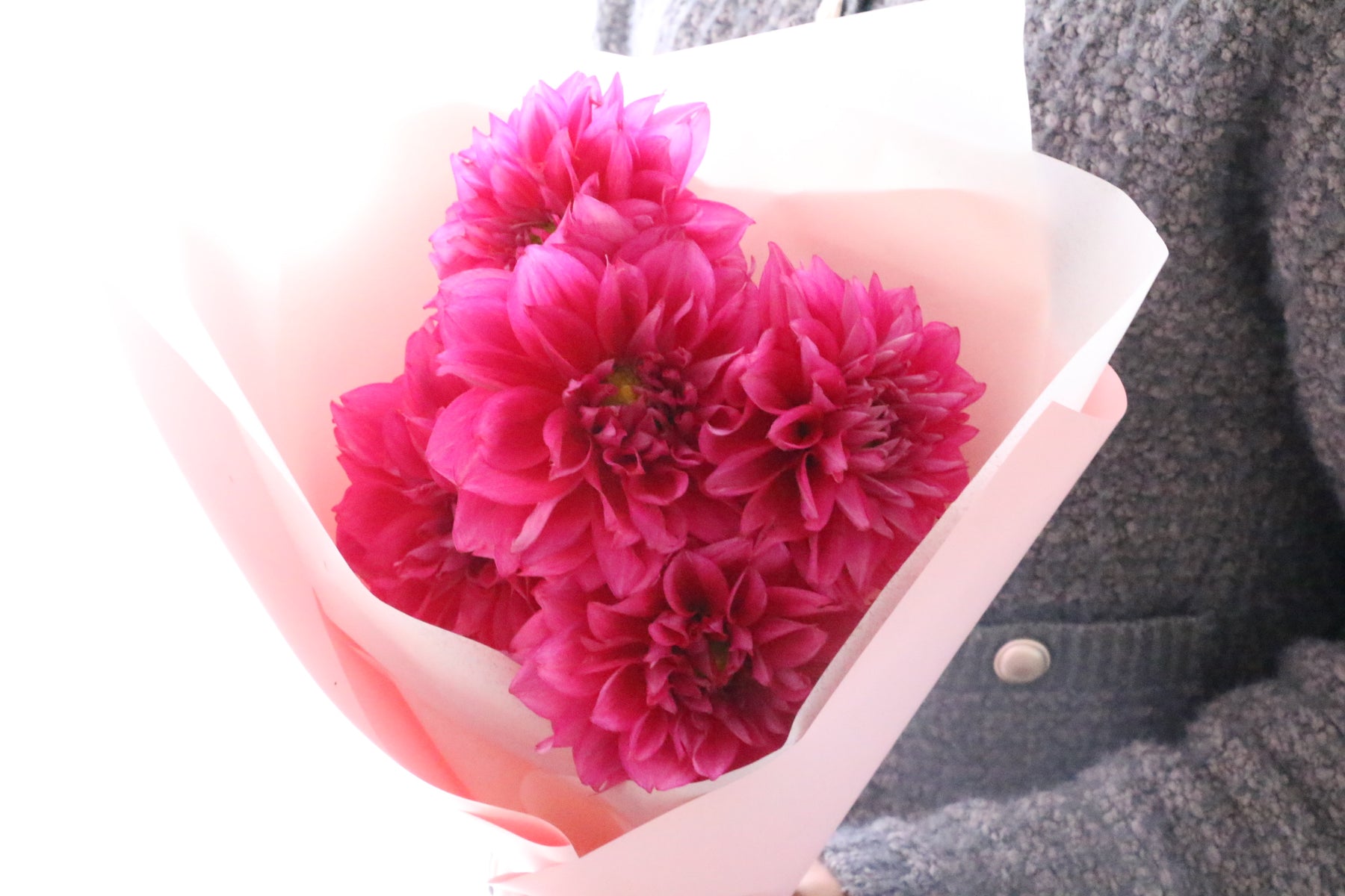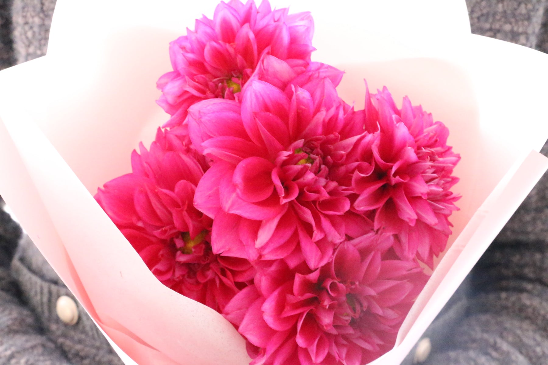 華やかで上品なダリアを5本まとめた、シンプルながら存在感のある花束です。