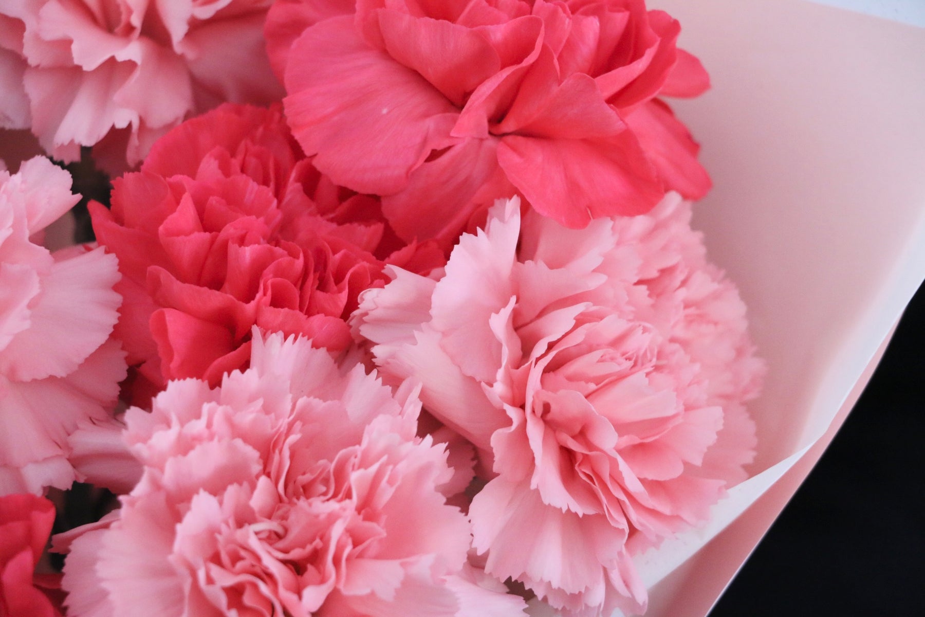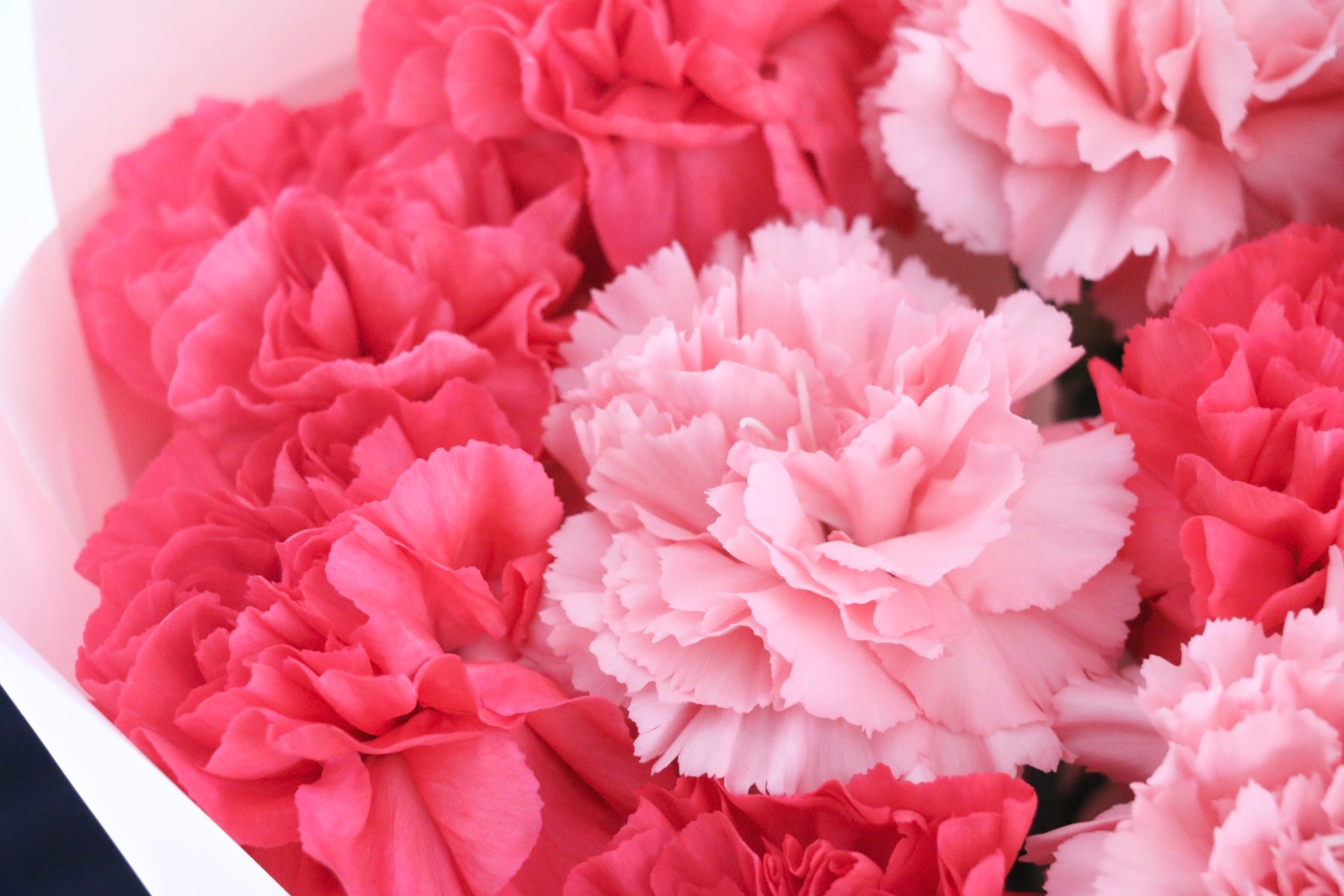 やさしいピンクと鮮やかな濃いピンクまで2色のピンク系カーネーションを束ねた華やかな花束です。