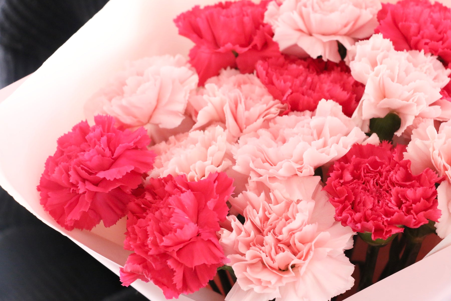 やさしいピンクと鮮やかな濃いピンクまで2色のピンク系カーネーションを束ねた華やかな花束です。