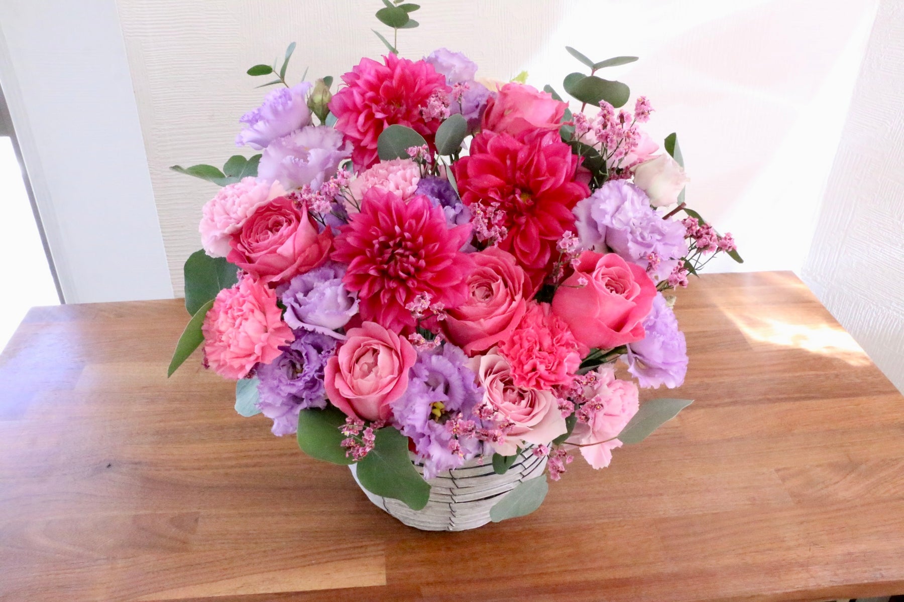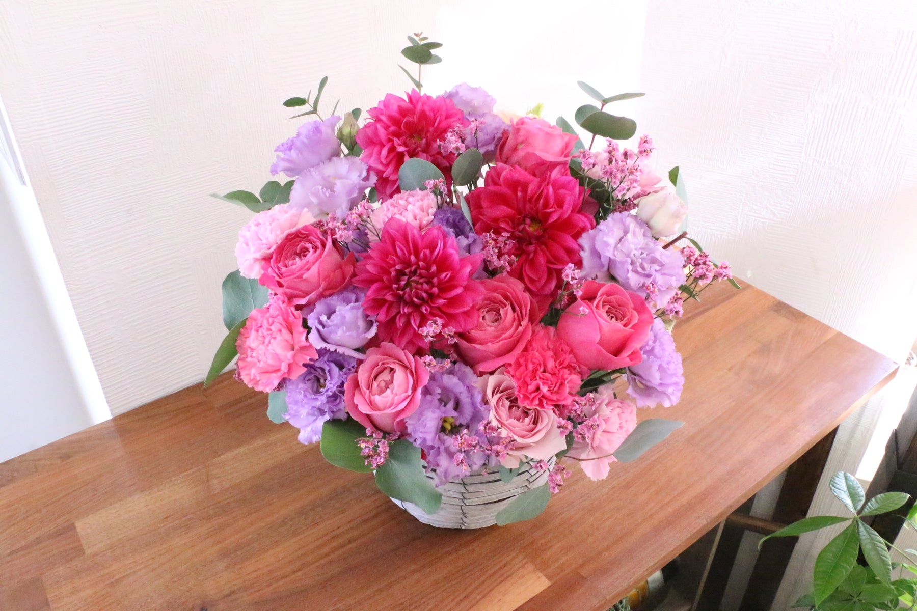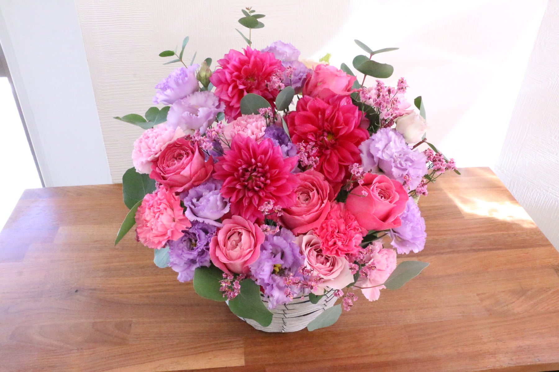 紫色・ピンク色のお花をベースに上品で優しい雰囲気で仕上げたアレンジメントです。