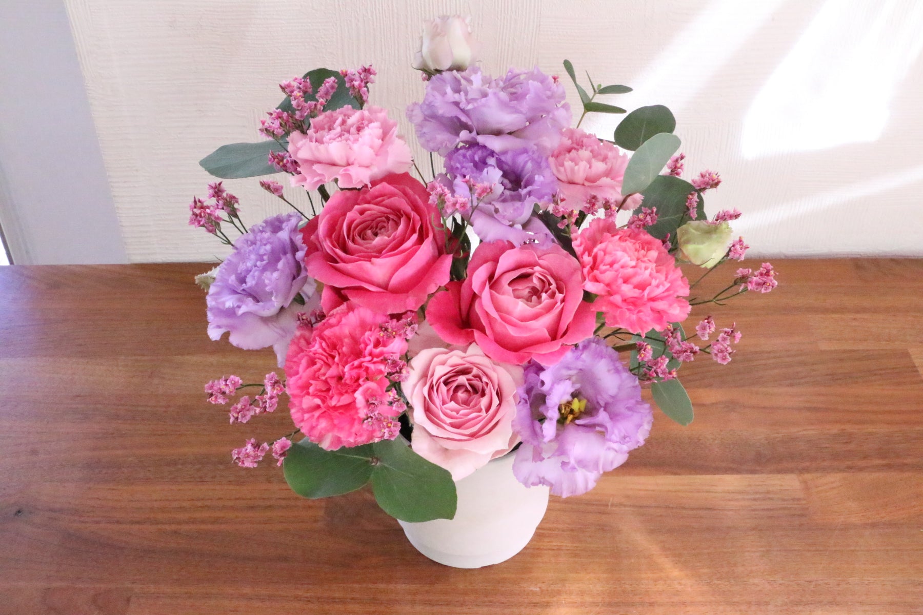 アレンジメントは花束と比較してお手入れの負担が少ないため、ご高齢の方へのギフトやお見舞い用途としても人気があります。詳しいお手入れ方法ガイドを同梱しておりますので、日常的にお花を飾らない方にとっても安心して楽しんでいただけます。