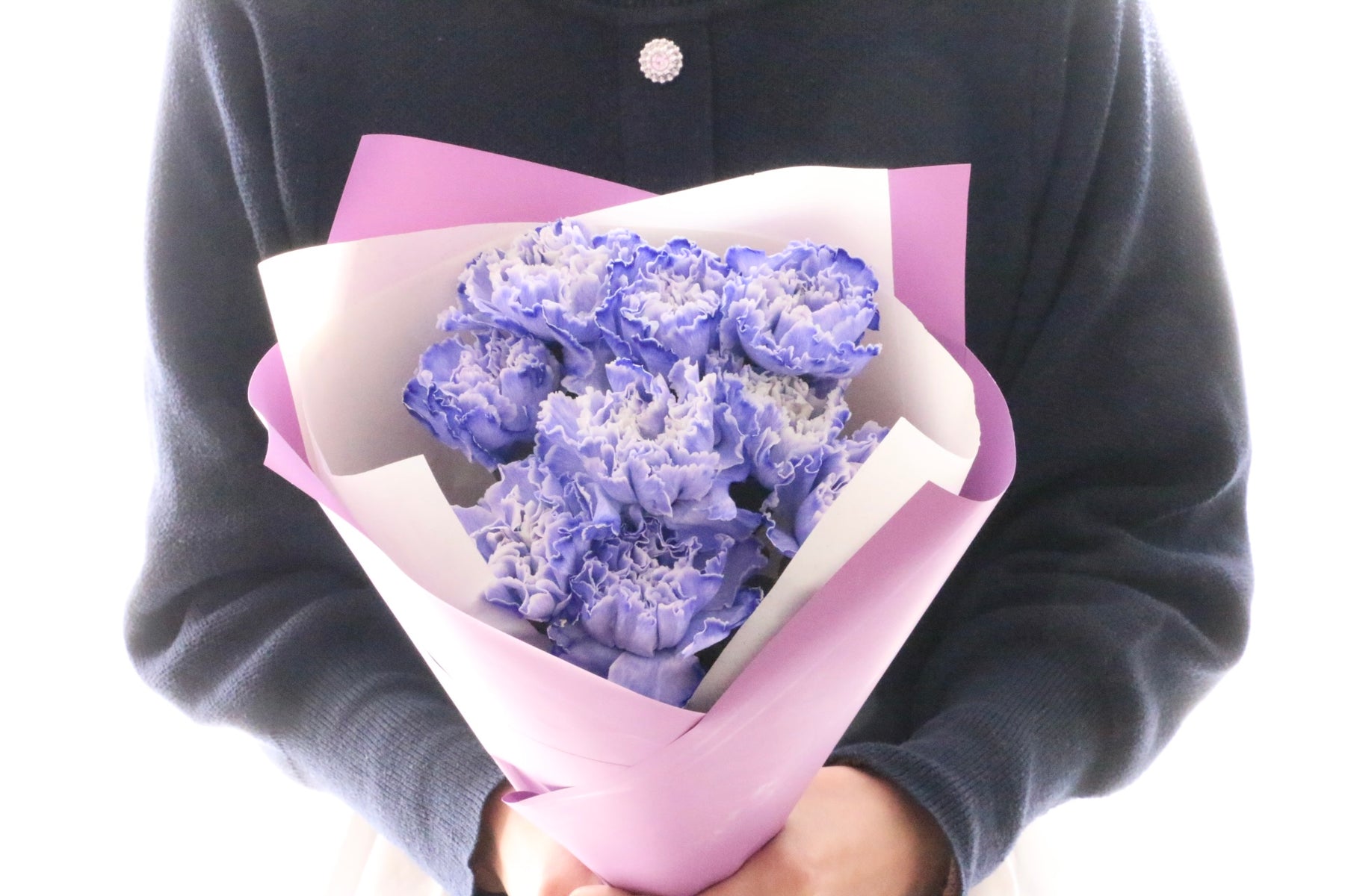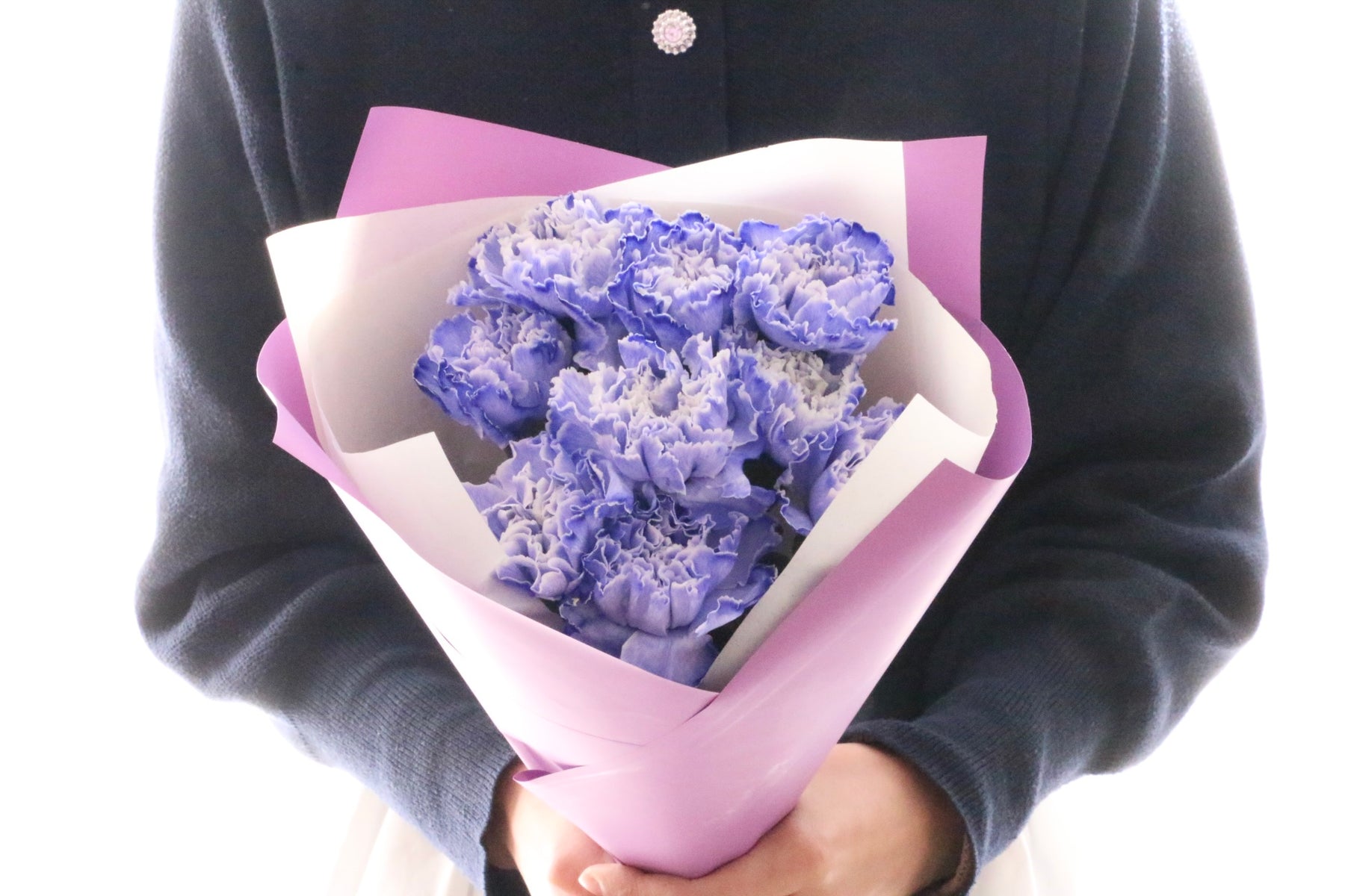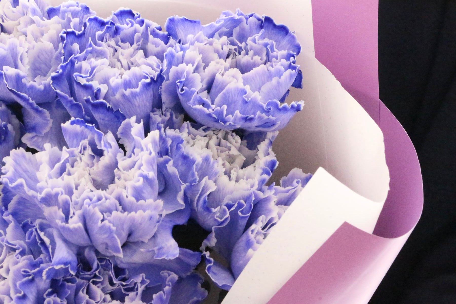 こちらの紫色は、白いカーネーションを染め上げた特別な一束です。深みのある美しい発色が、シックで大人っぽい印象を演出します。