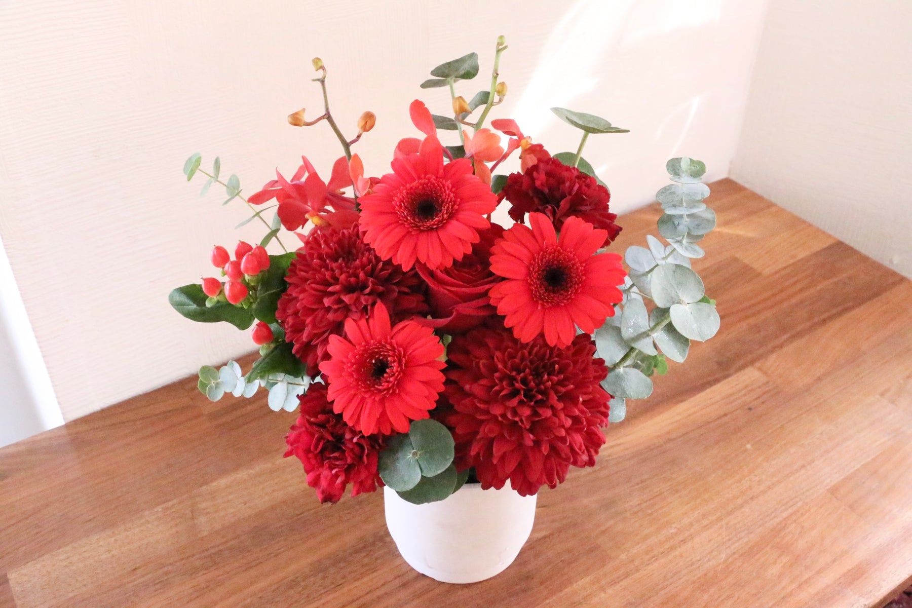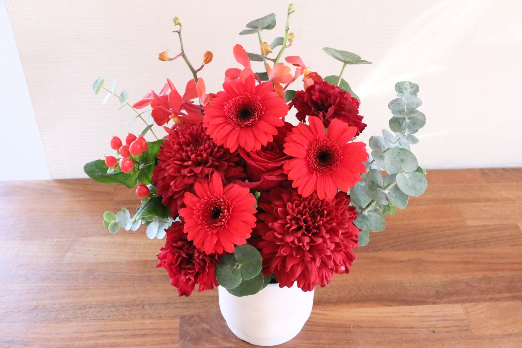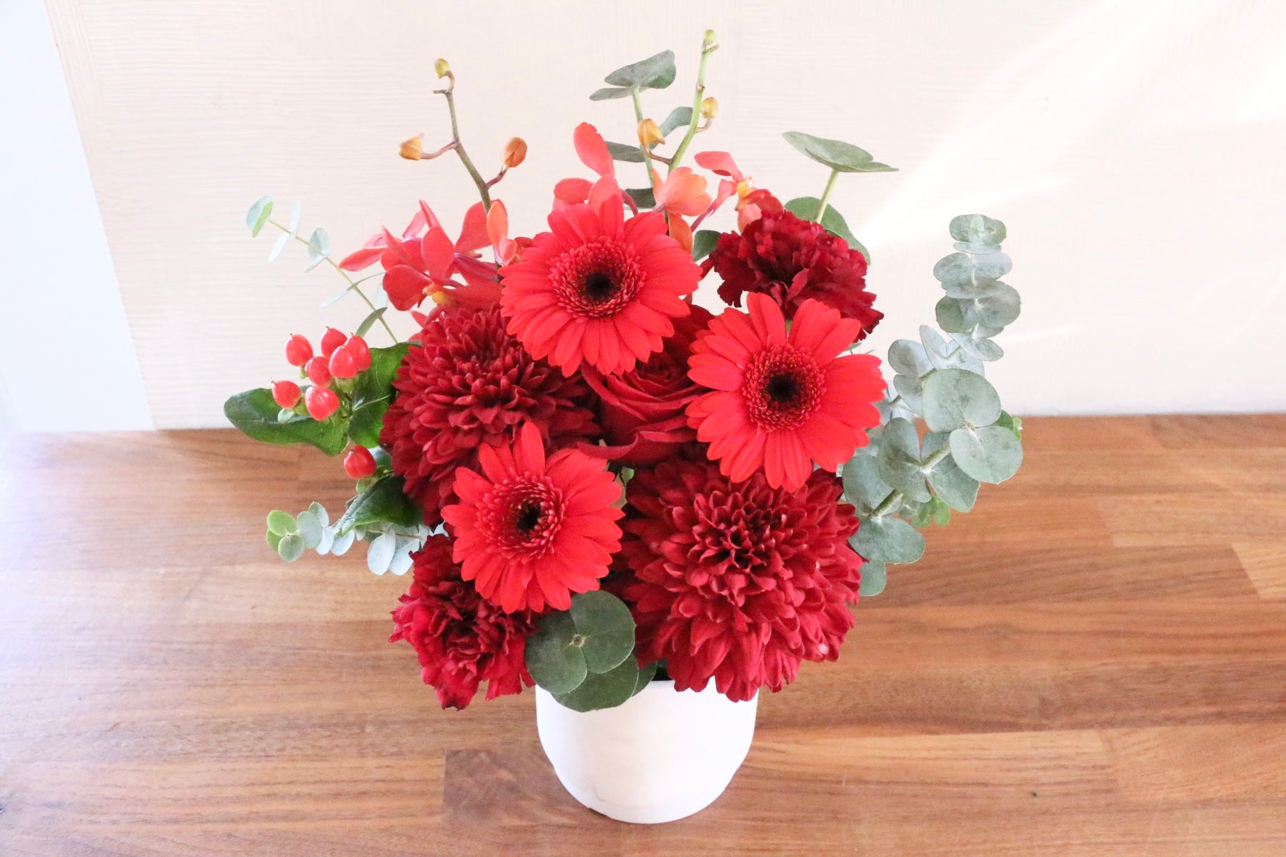 赤色のお花をベースに大人っぽく華やかな雰囲気で仕上げたアレンジメントです。