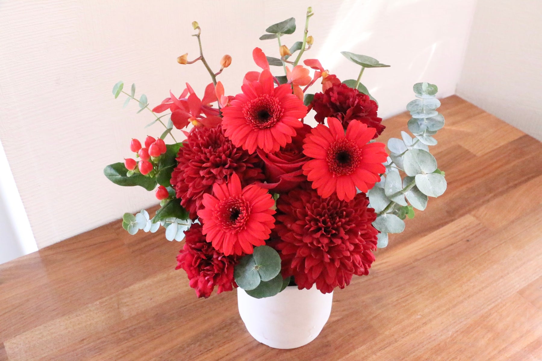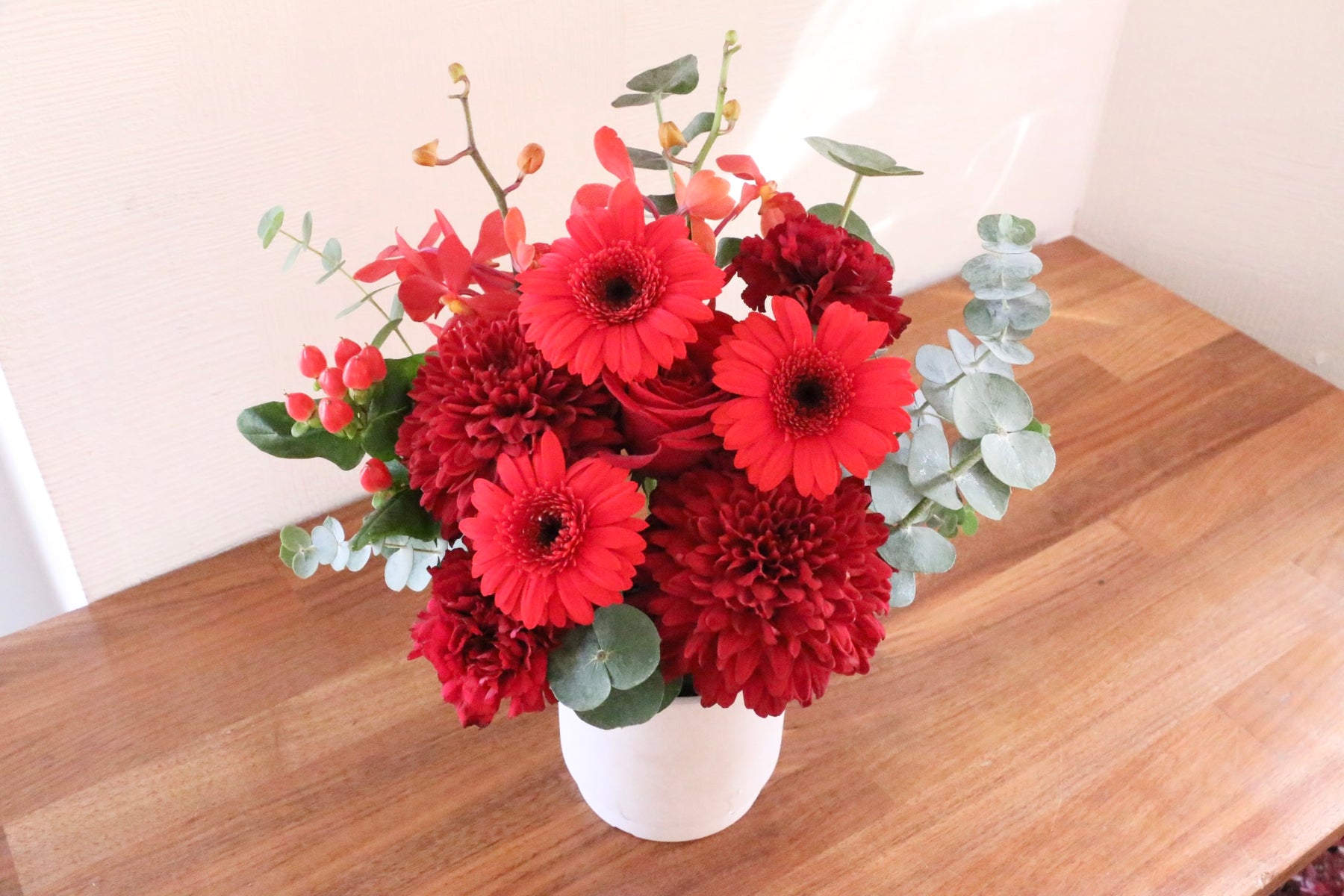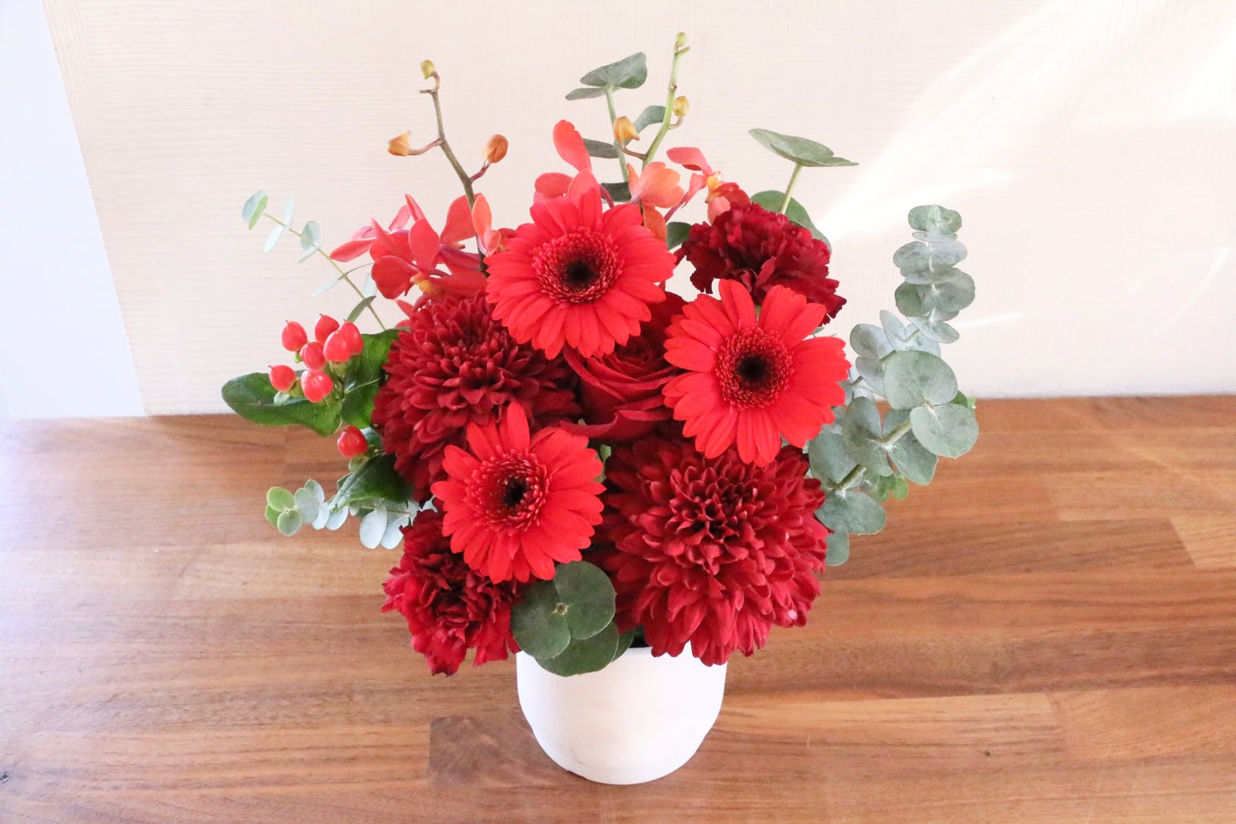赤色のお花をベースに大人っぽく華やかな雰囲気で仕上げたアレンジメントです。