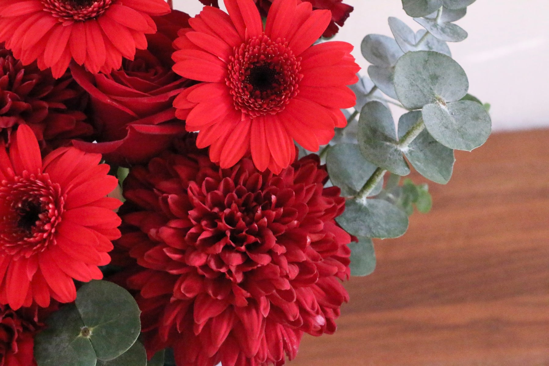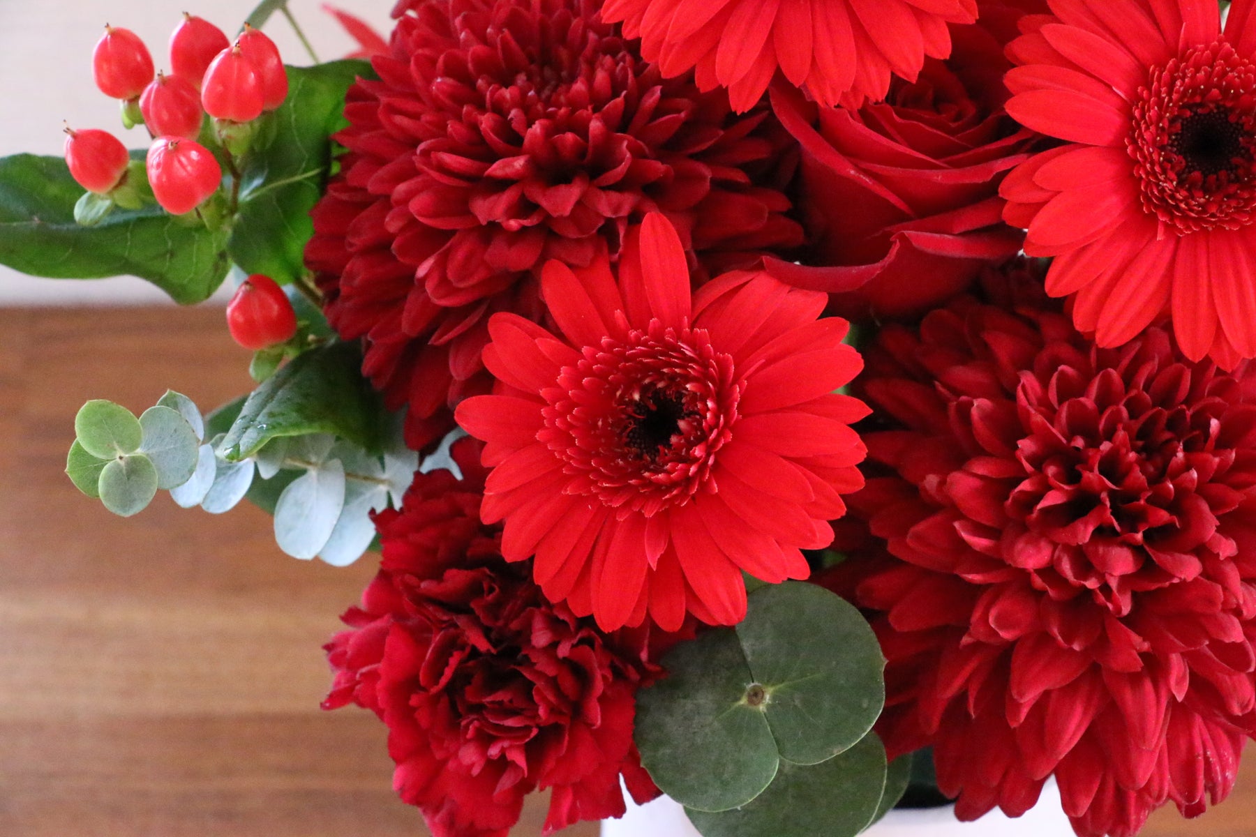 差し色に赤色以外の色味(例:ピンクや白など)のお花を入れながら、赤色でまとめます。