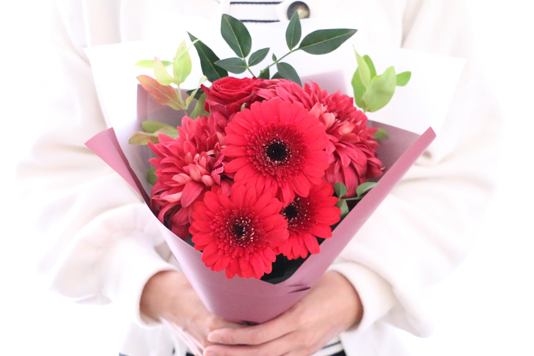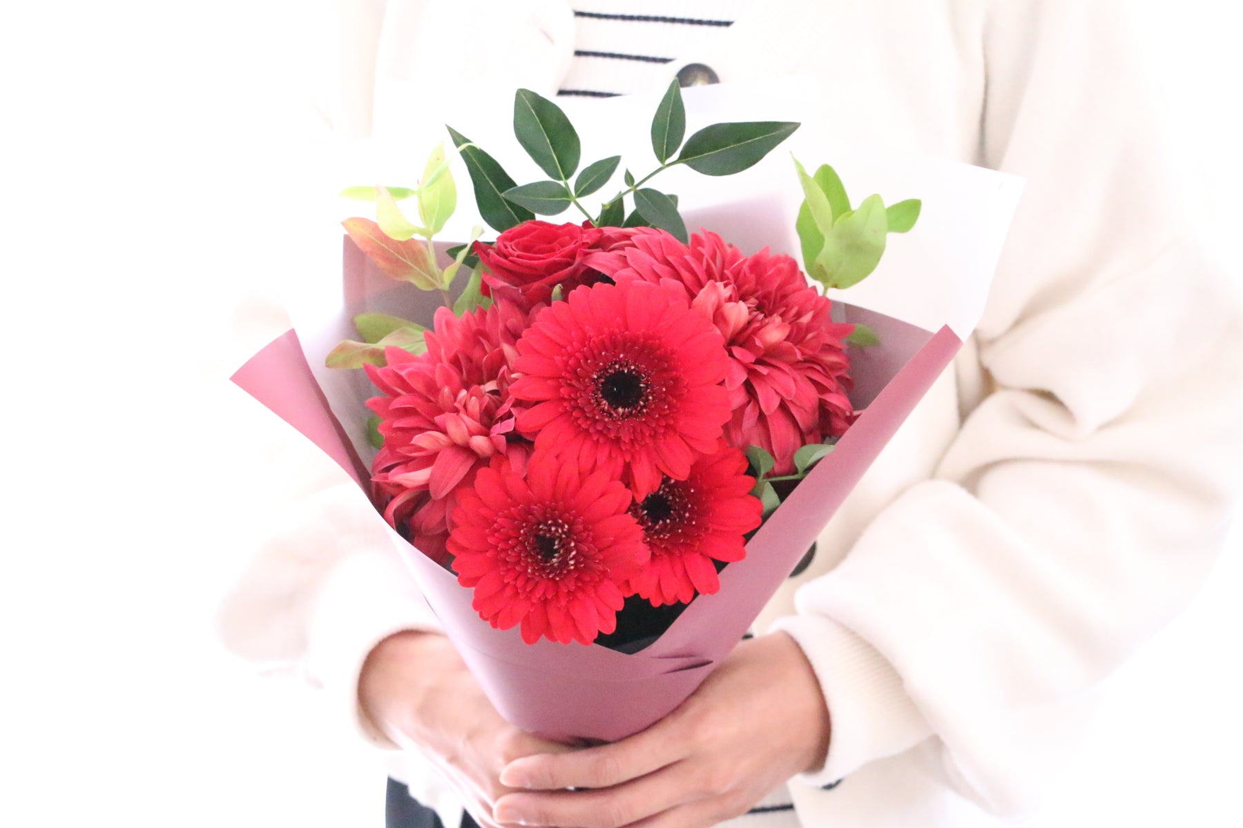 差し色に赤色以外の色味(例:ピンクや白など)のお花を入れながら、赤色でまとめます。