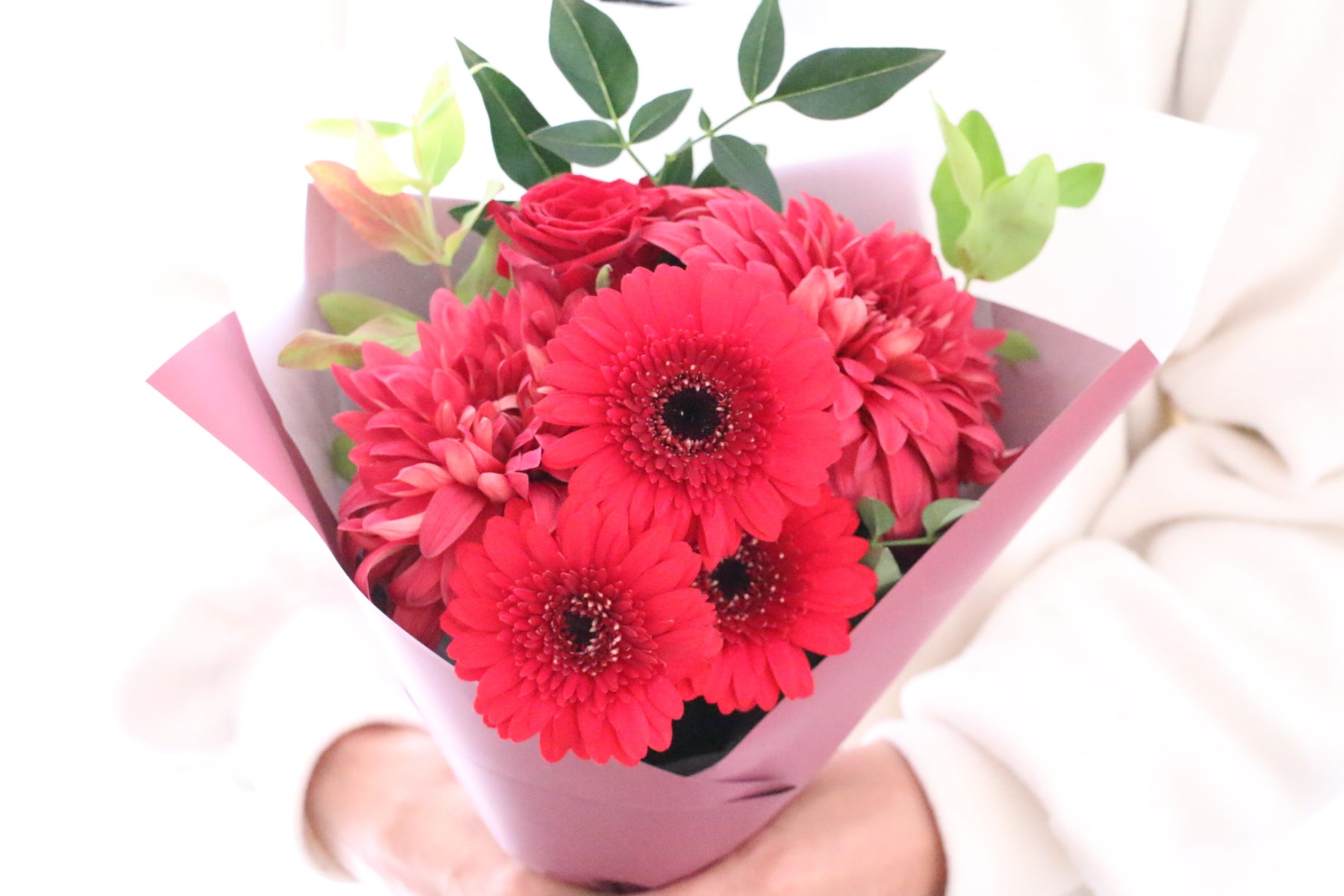 赤色のお花をベースに大人っぽく華やかな雰囲気で仕上げた花束です。