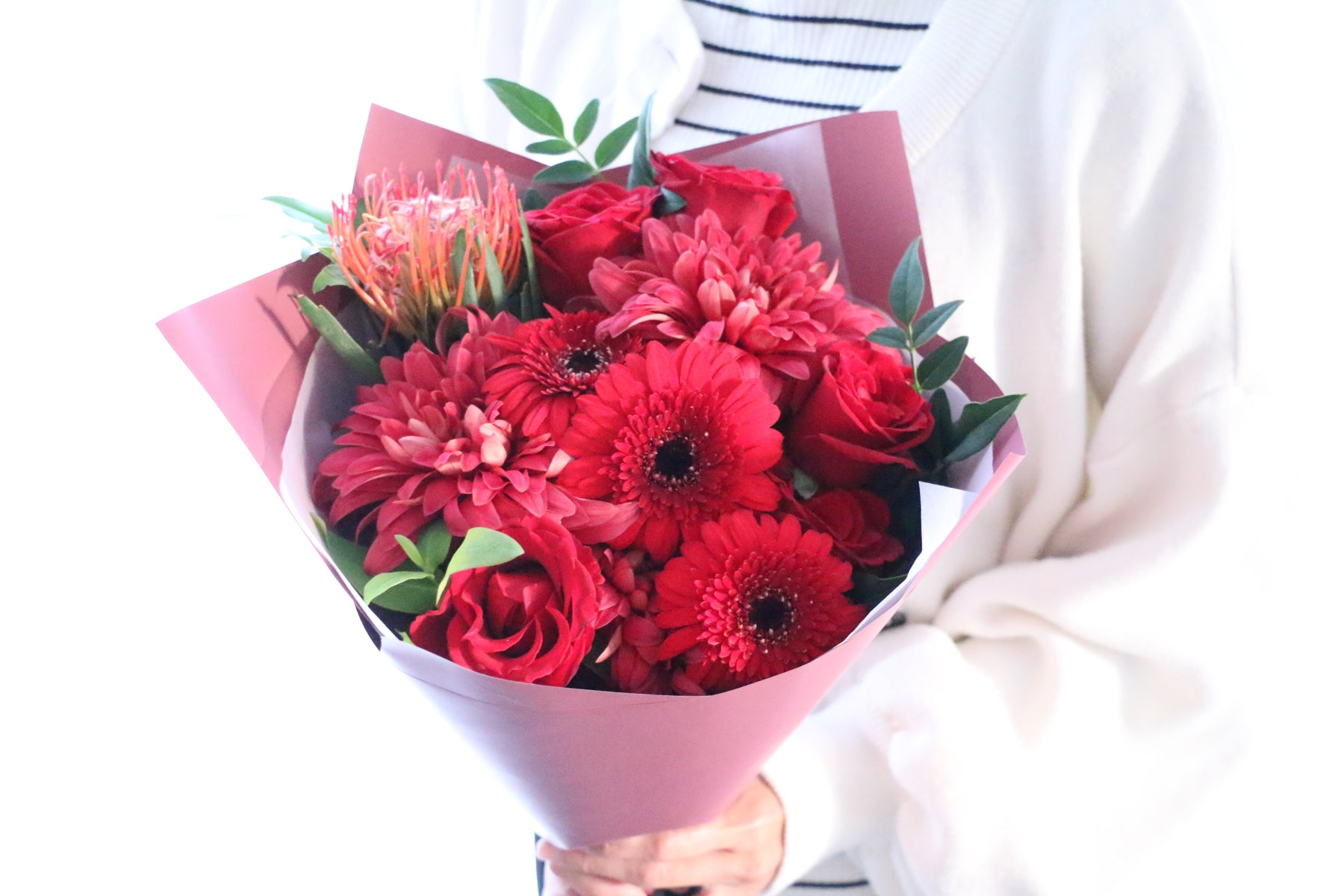赤色のお花をベースに大人っぽく華やかな雰囲気で仕上げた花束です。