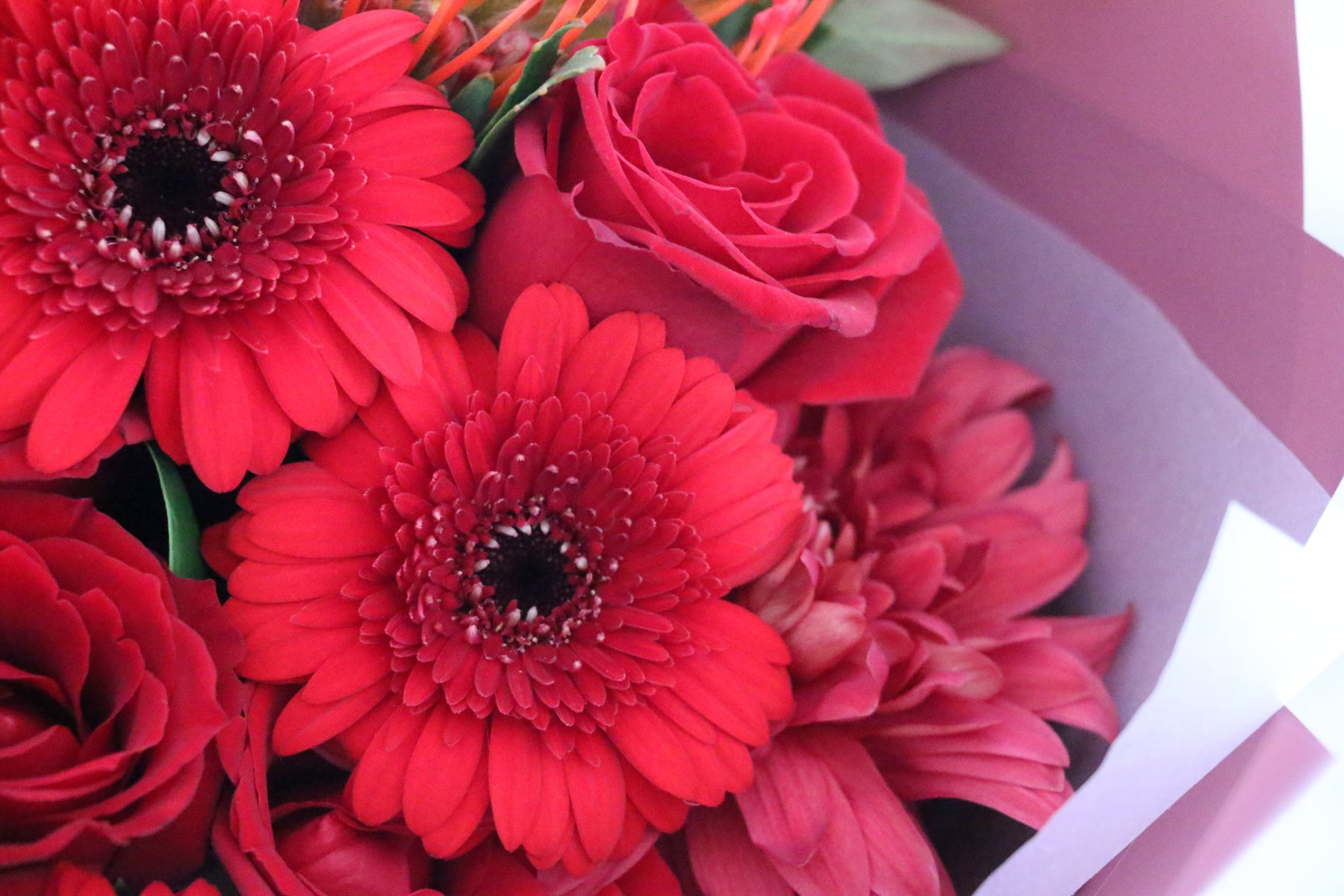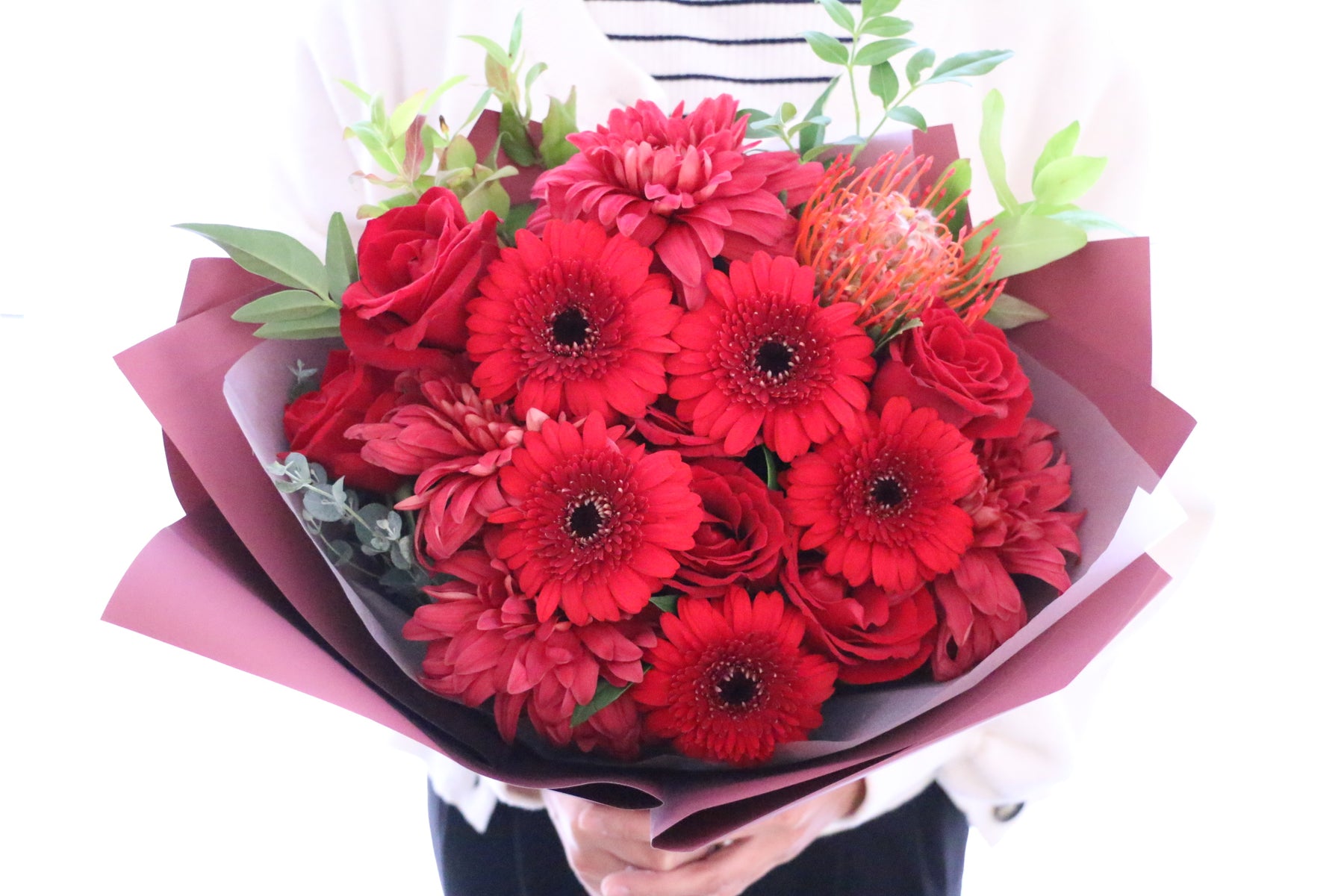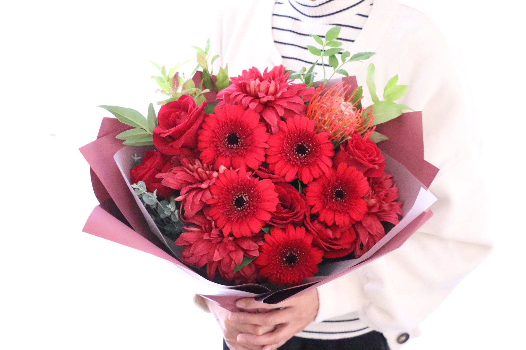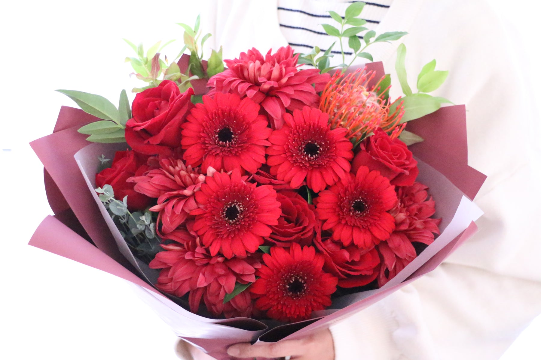 赤色のお花をベースに大人っぽく華やかな雰囲気で仕上げた花束です。