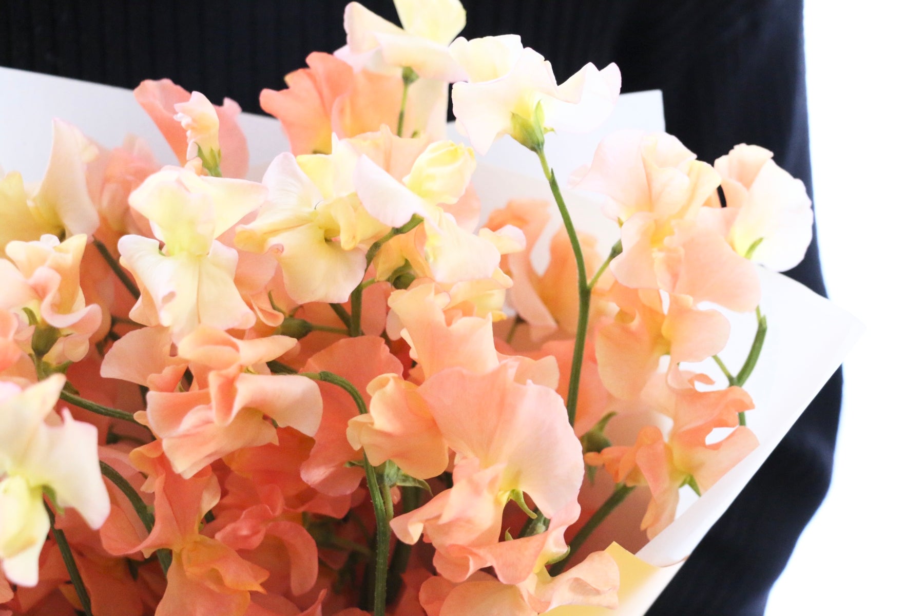 スイートピーの品種は発送のタイミングで市場に入荷した新鮮なものをお入れします。そのため、写真のスイートピーとは異なる品種・色味・サイズのものが届くことがございますので、予めご了承ください。