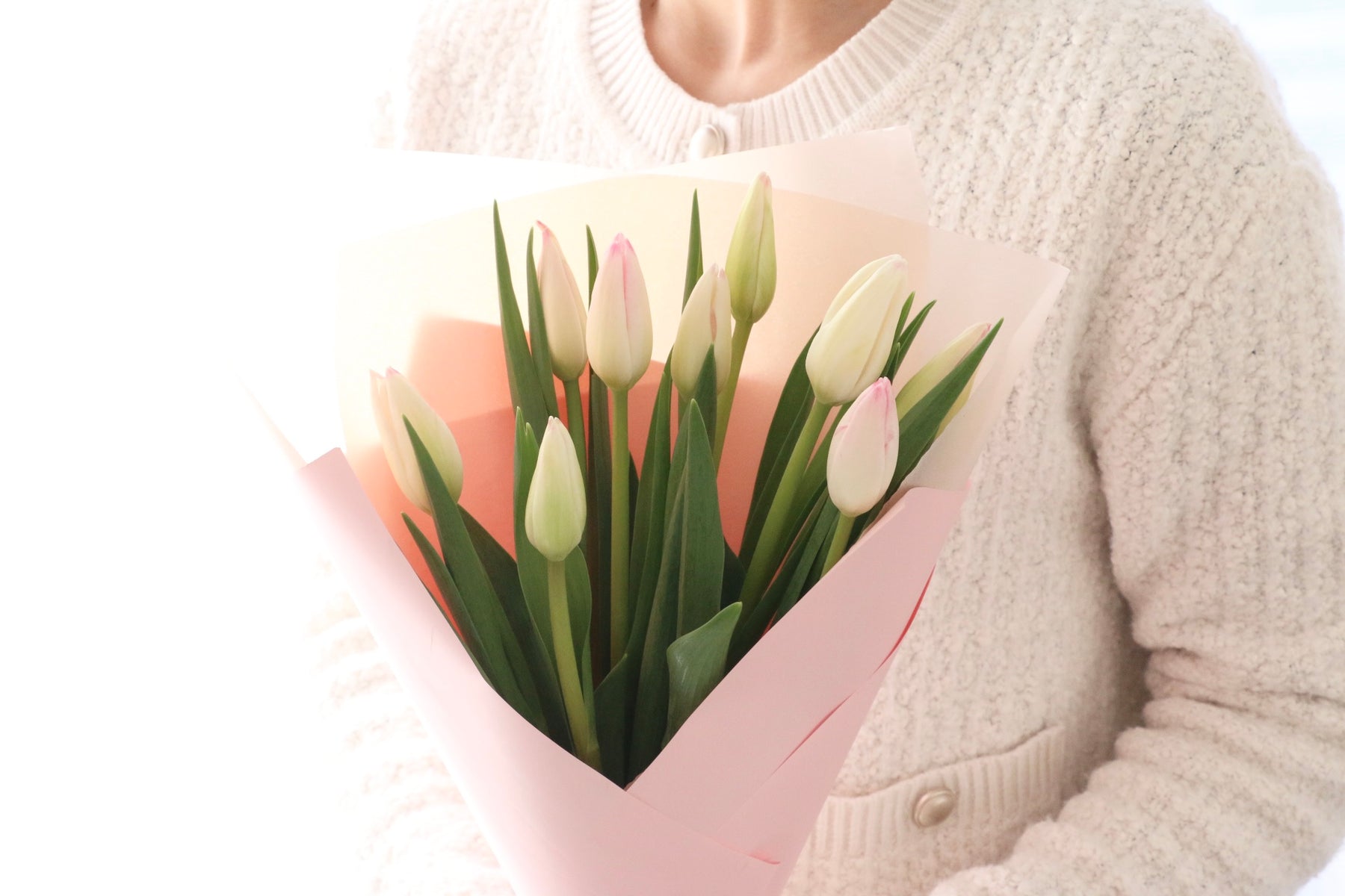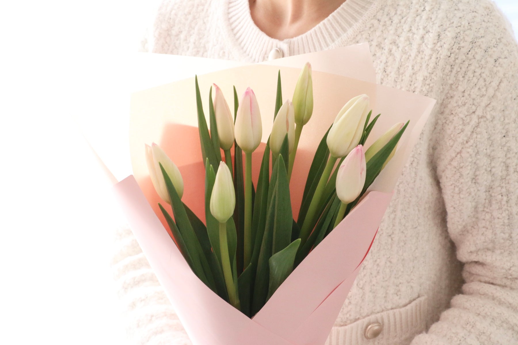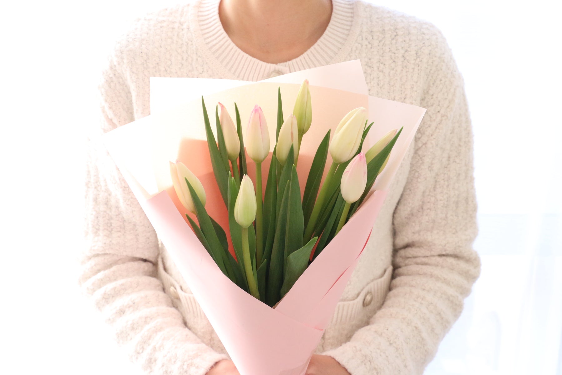9本の淡いピンク色のチューリップを束ねたシンプルで可愛らしい花束です。チューリップは春を代表するお花の一つで、コロンとした可愛い見た目が人気のお花です。