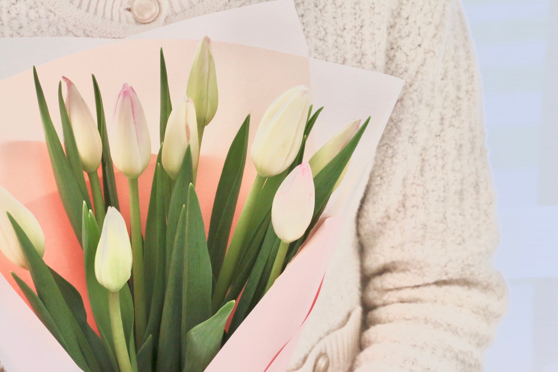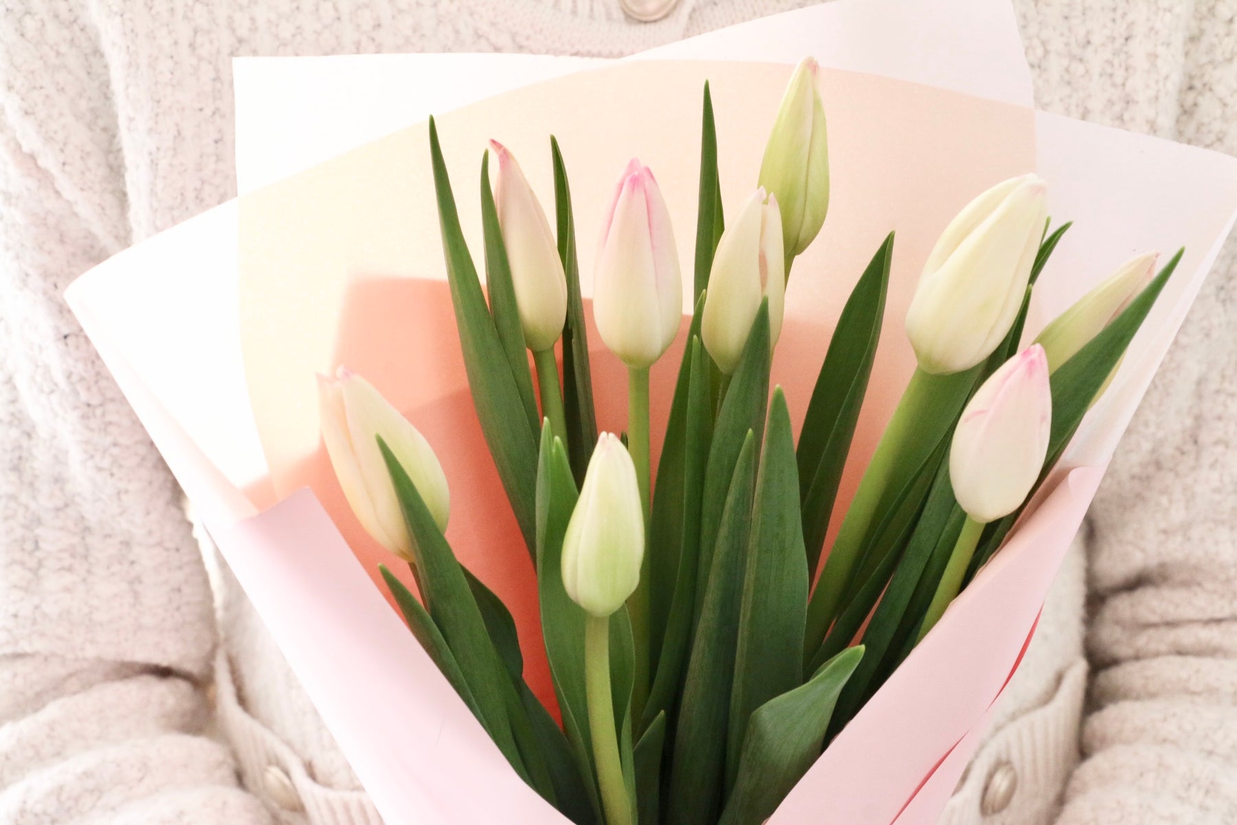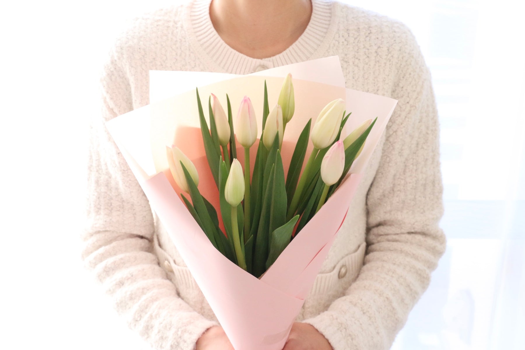 9本の淡いピンク色のチューリップを束ねたシンプルで可愛らしい花束です。チューリップは春を代表するお花の一つで、コロンとした可愛い見た目が人気のお花です。