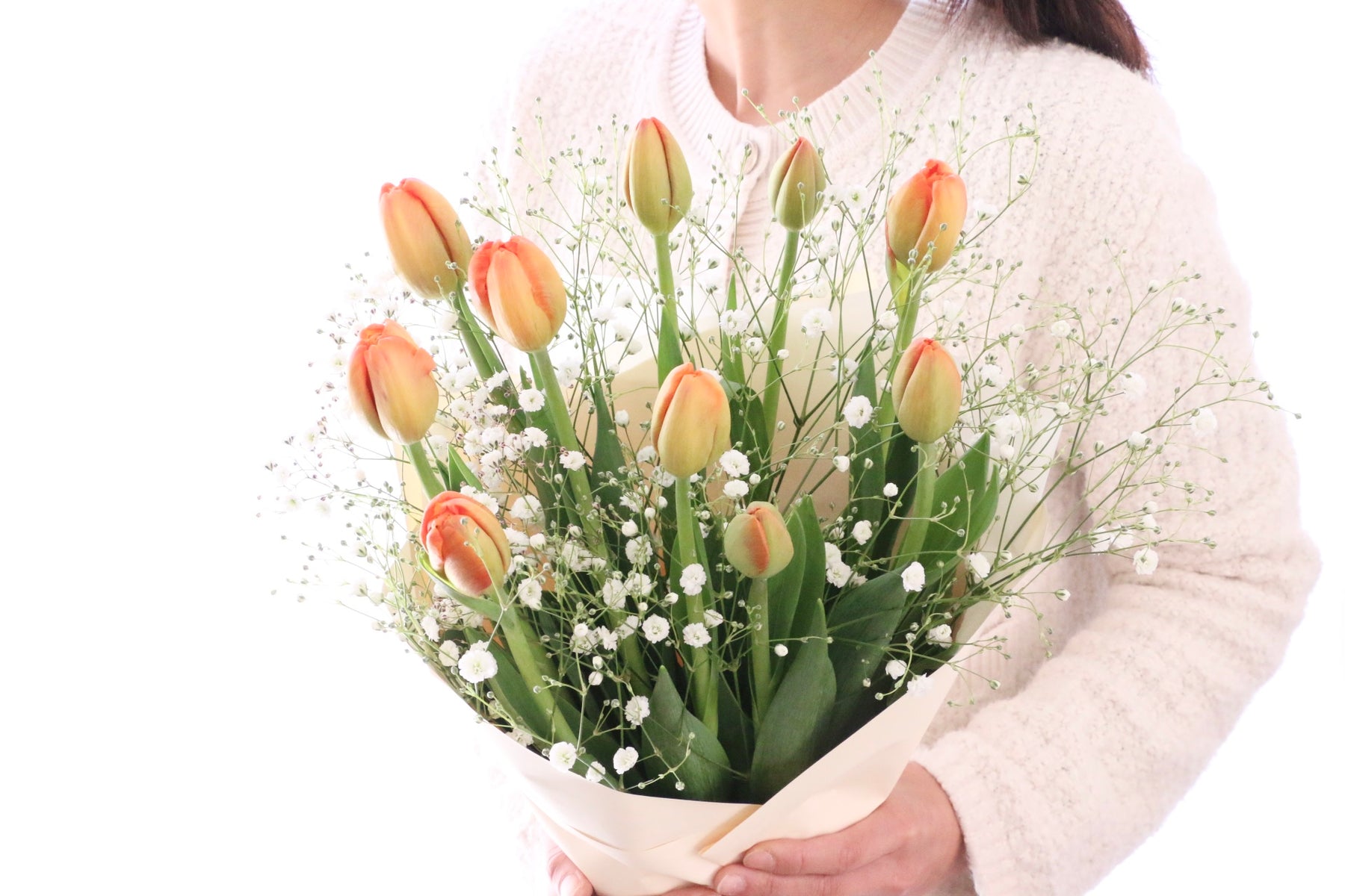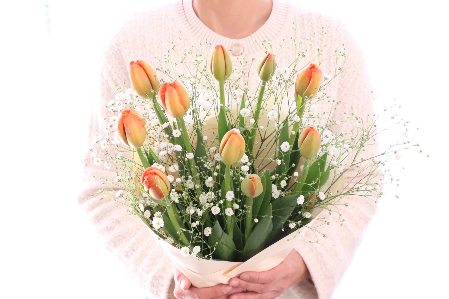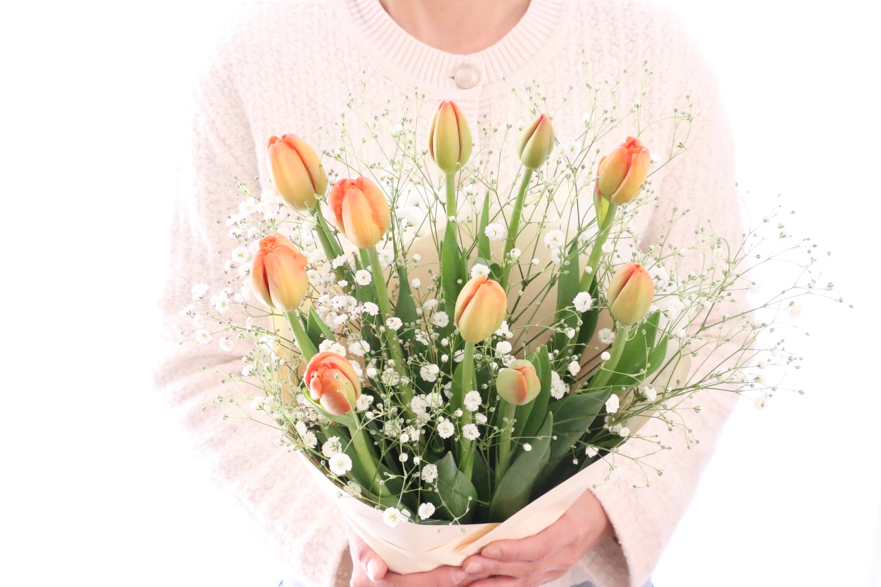 10本のオレンジ色のチューリップとカスミソウを束ねたシンプルで可愛らしい花束です。チューリップは春を代表するお花の一つで、コロンとした可愛い見た目が人気のお花です。