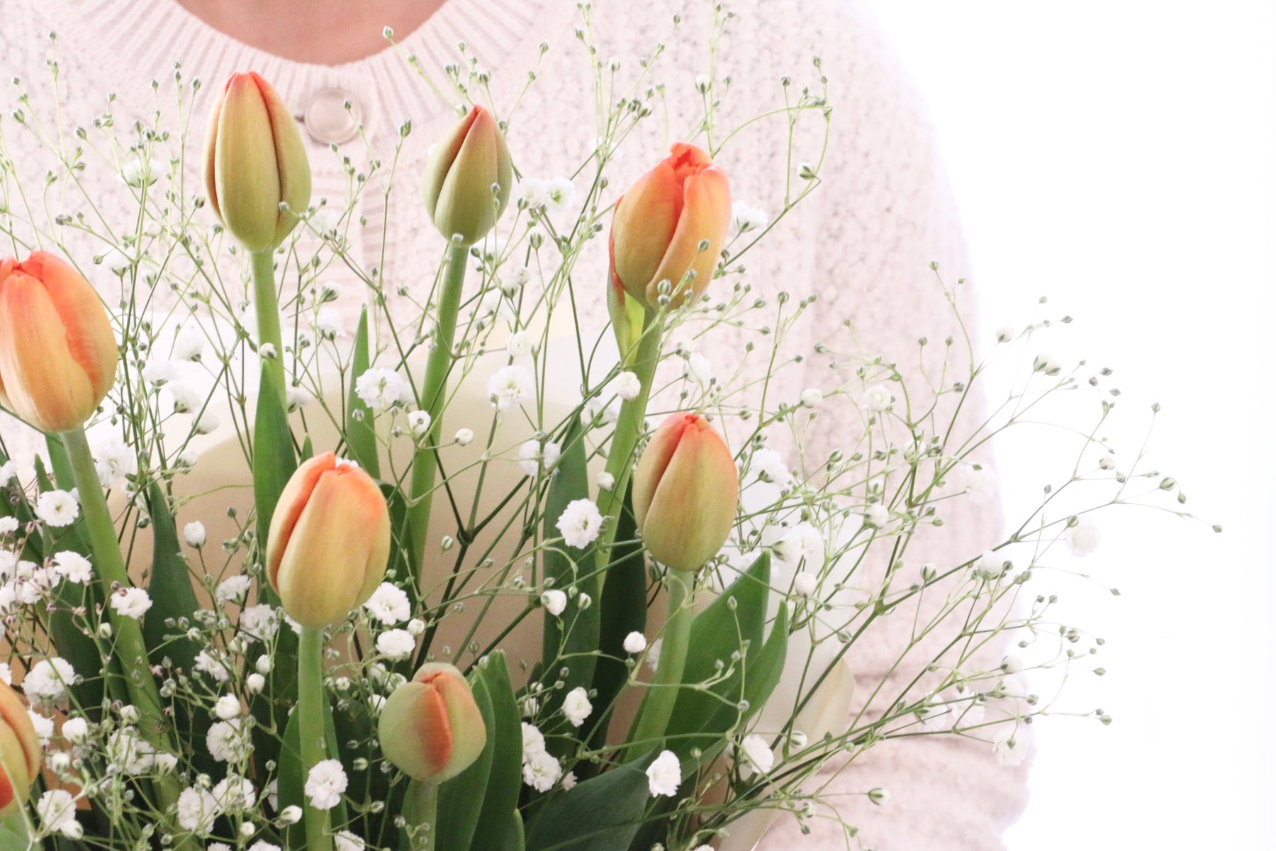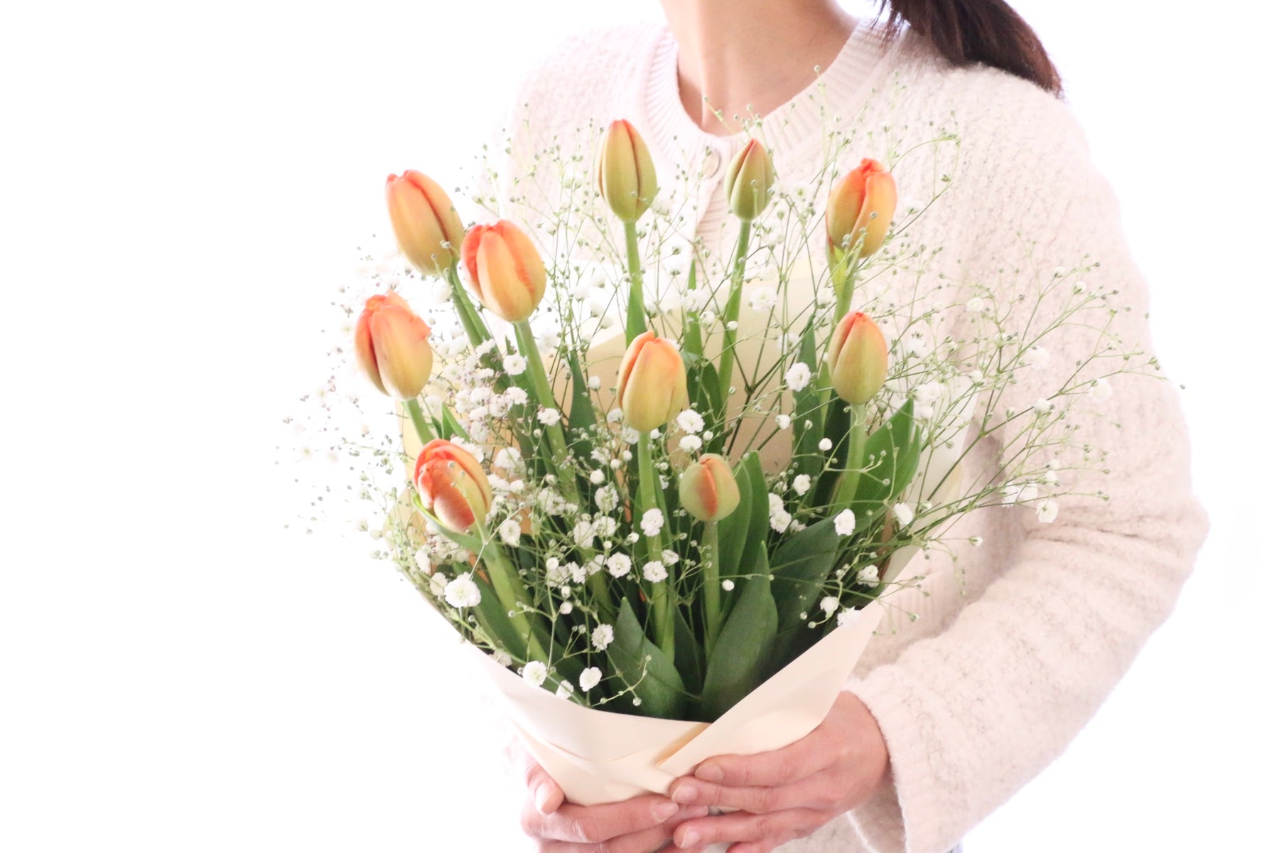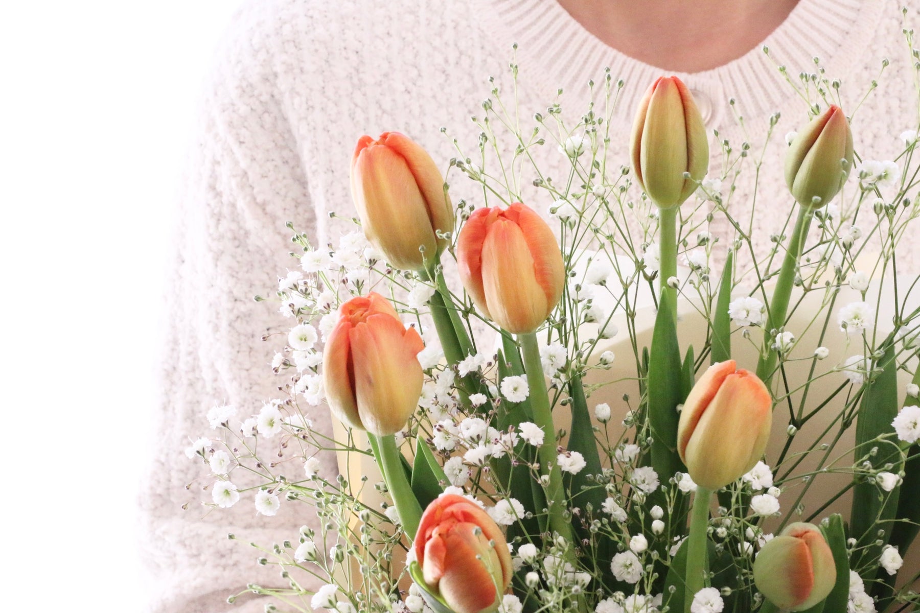 10本のオレンジ色のチューリップとカスミソウを束ねたシンプルで可愛らしい花束です。チューリップは春を代表するお花の一つで、コロンとした可愛い見た目が人気のお花です。