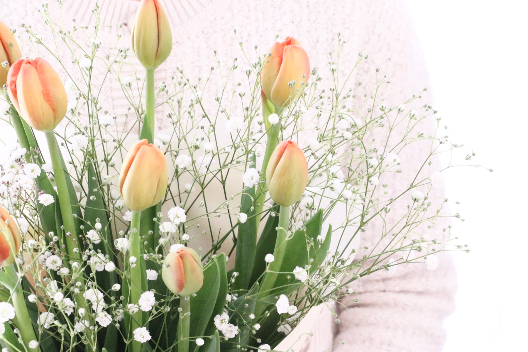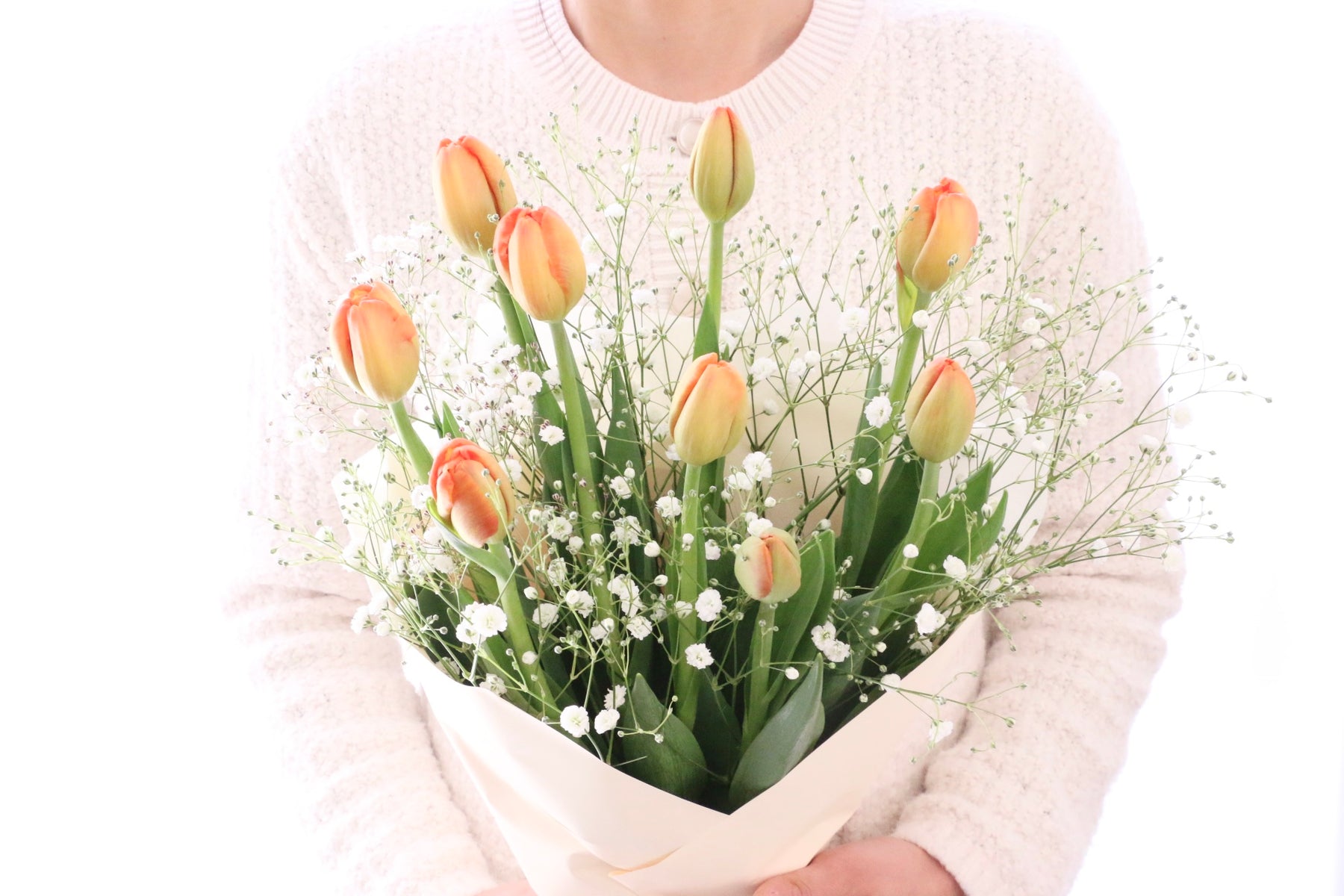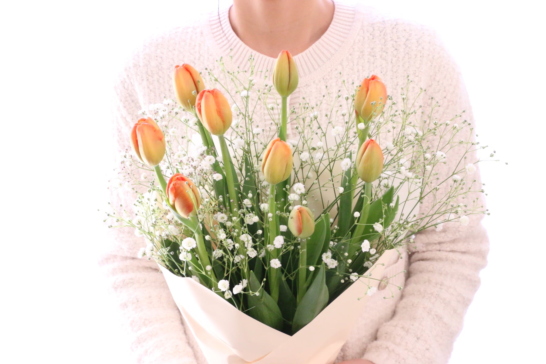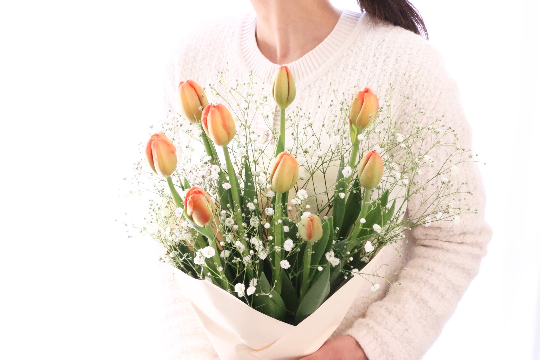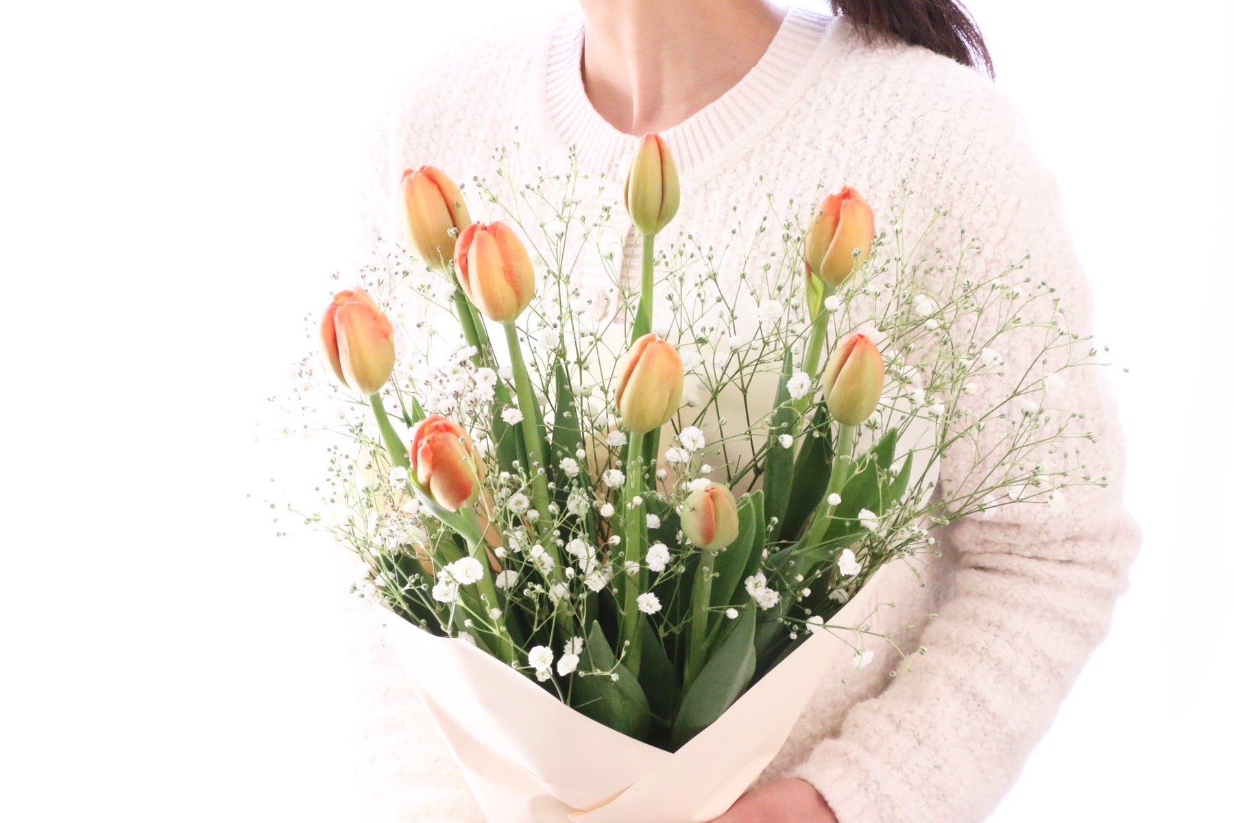 9本のオレンジ色のチューリップとカスミソウを束ねたシンプルで可愛らしい花束です。チューリップは春を代表するお花の一つで、コロンとした可愛い見た目が人気のお花です。