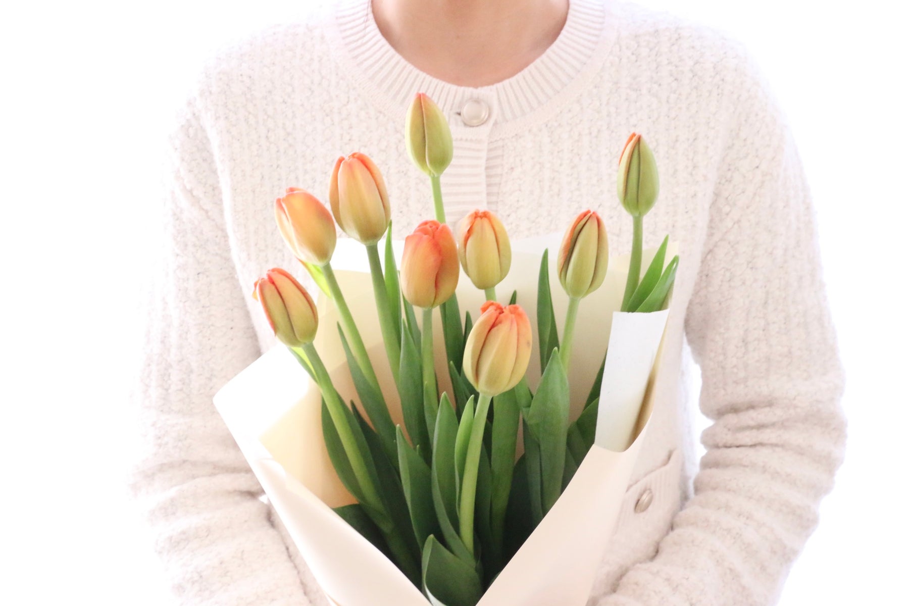 9本のオレンジ色のチューリップを束ねたシンプルで可愛らしい花束です。チューリップは春を代表するお花の一つで、コロンとした可愛い見た目が人気のお花です。