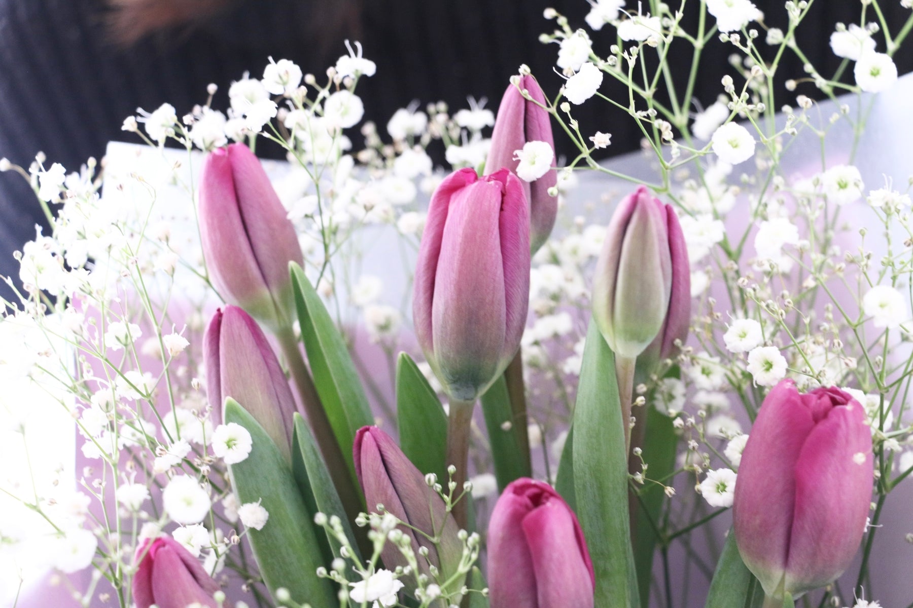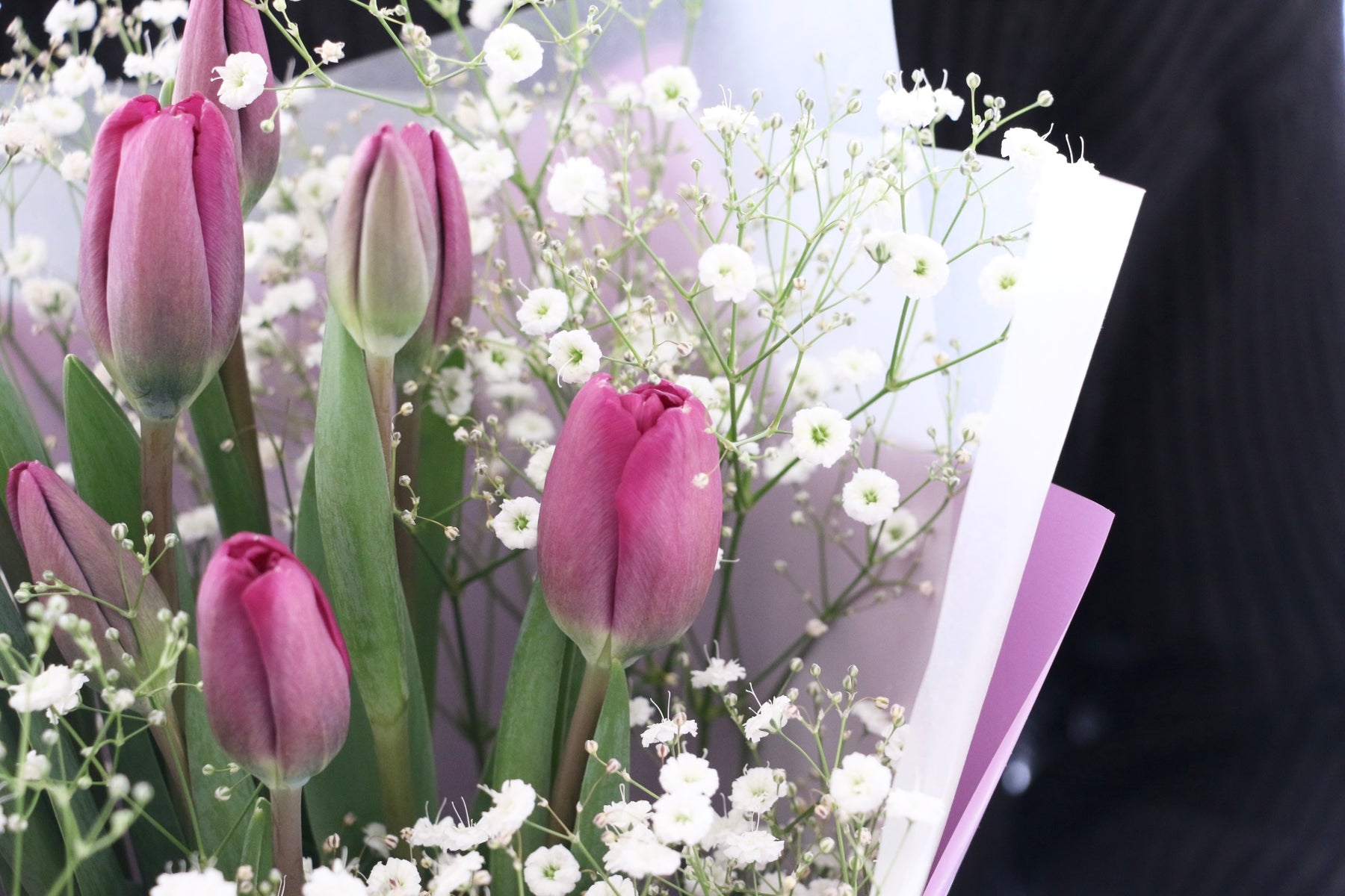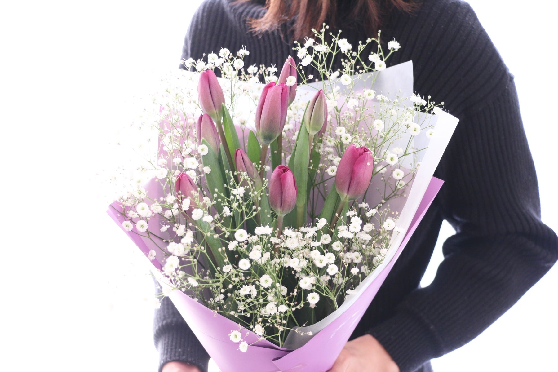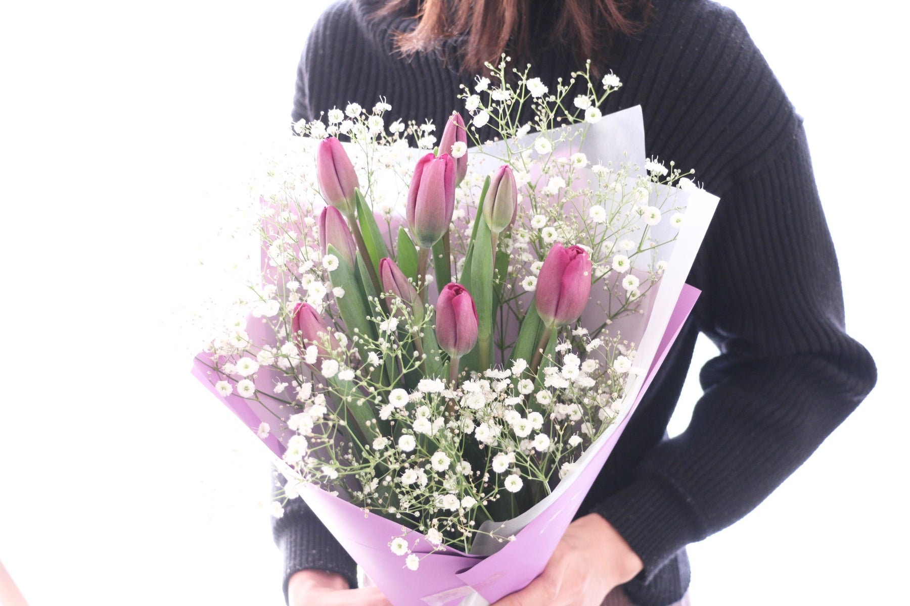10本の紫色のチューリップとカスミソウを束ねたシンプルで可愛らしい花束です。チューリップは春を代表するお花の一つで、コロンとした可愛い見た目が人気のお花です。