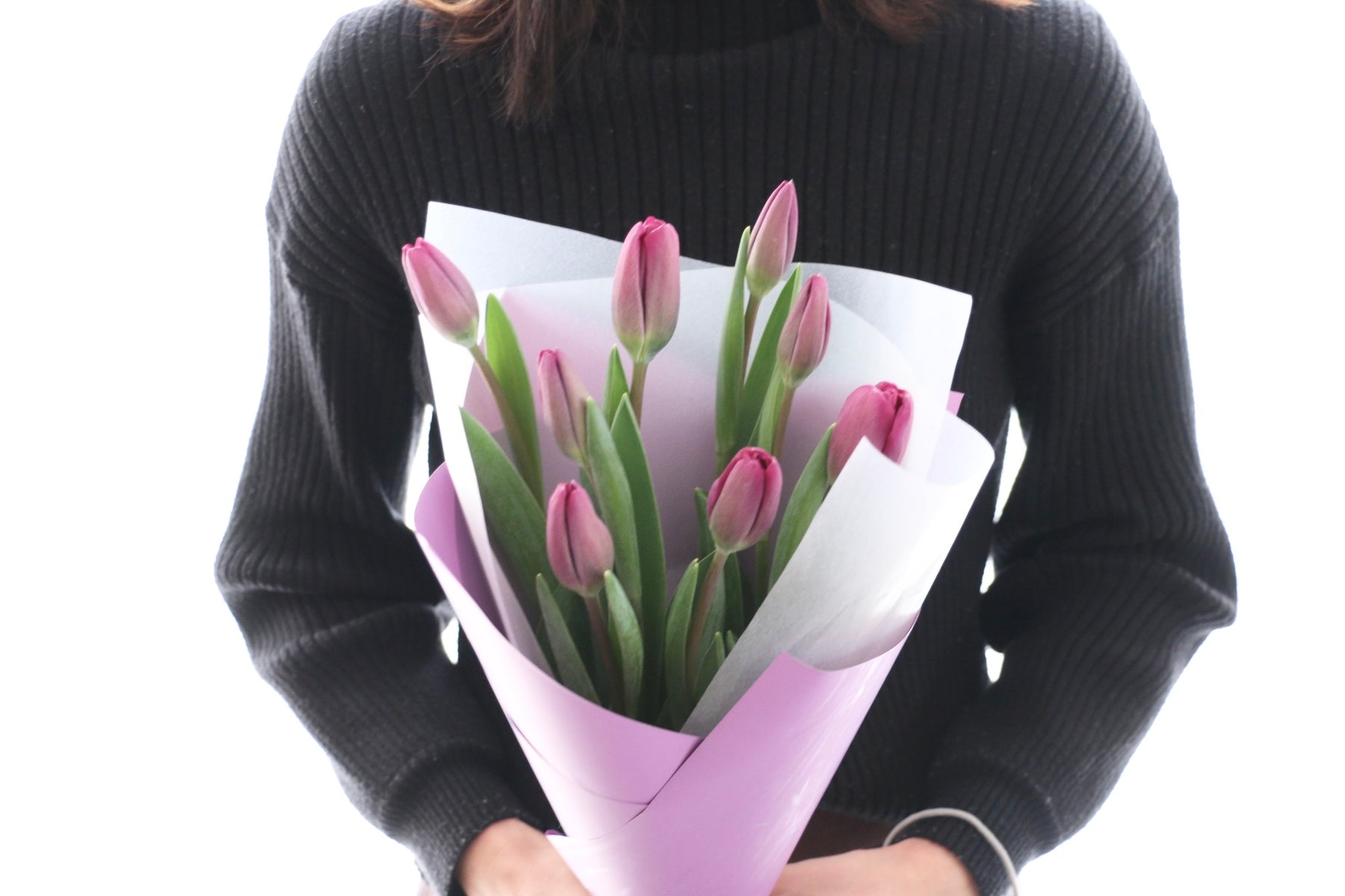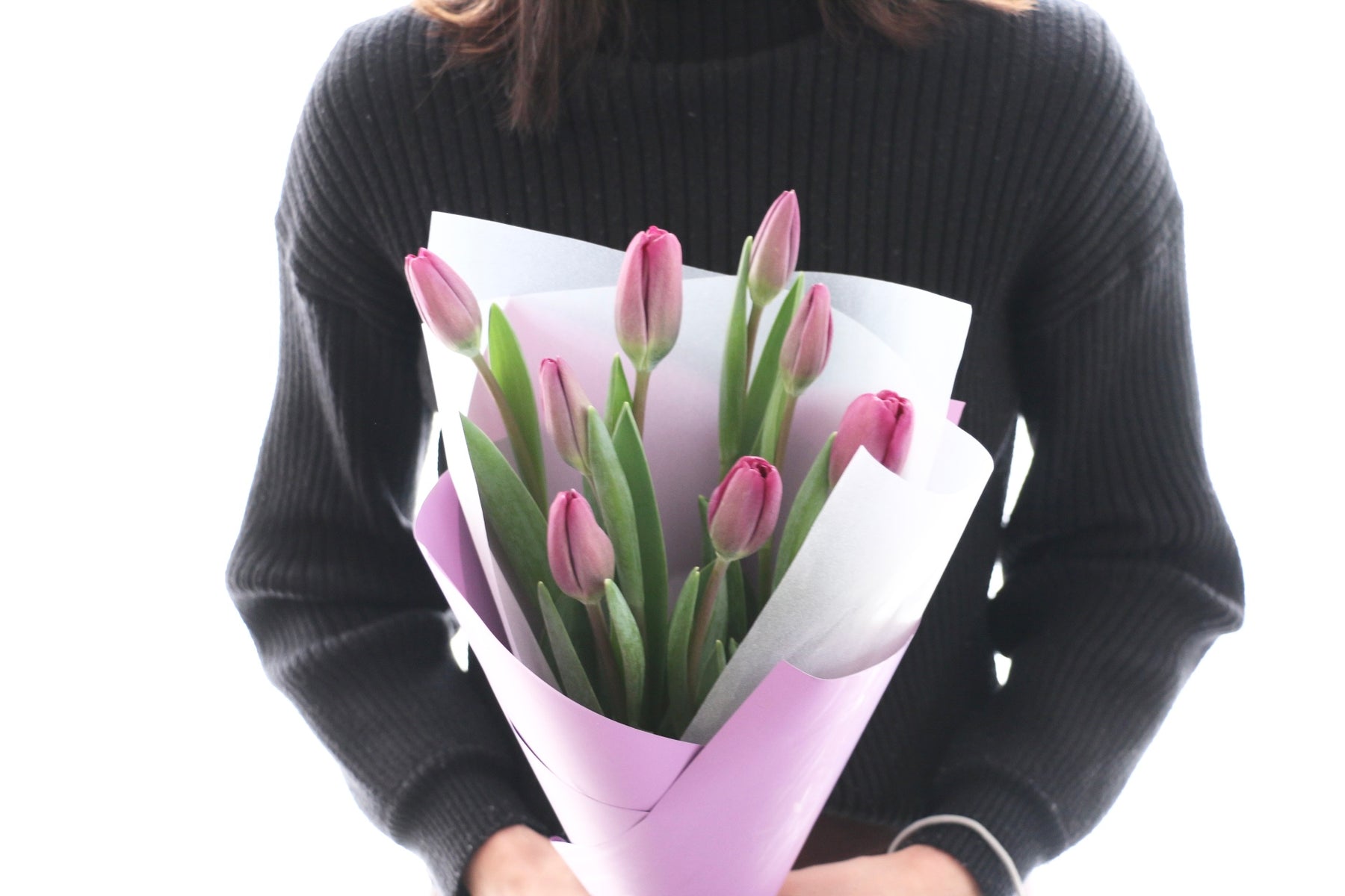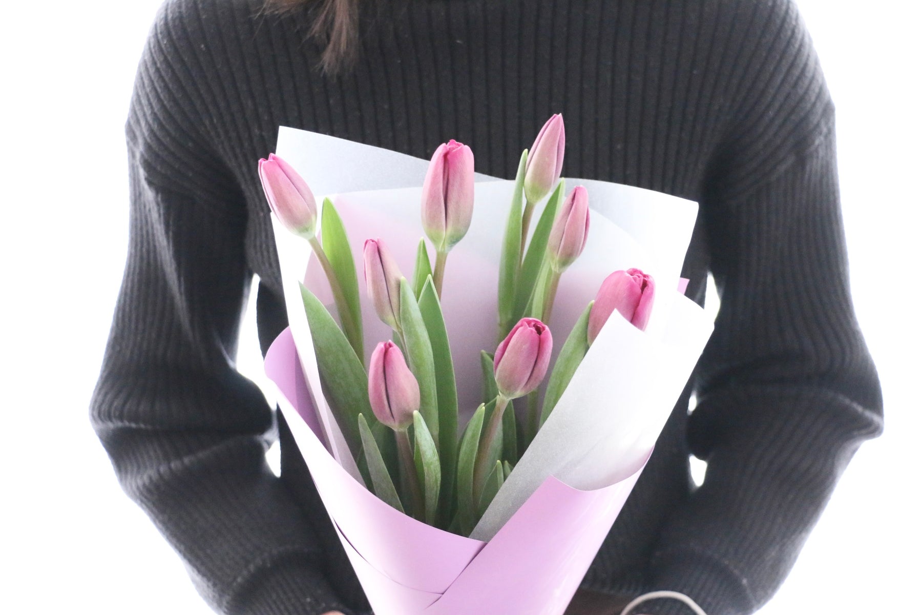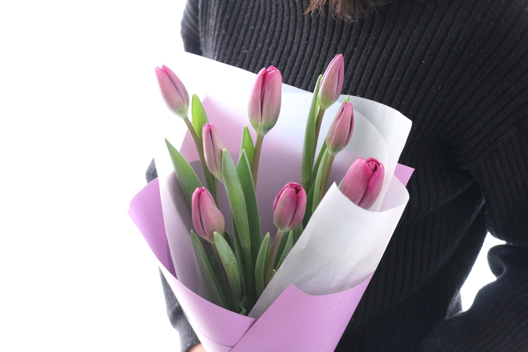 8本の紫色のチューリップを束ねたシンプルで可愛らしい花束です。チューリップは春を代表するお花の一つで、コロンとした可愛い見た目が人気のお花です。