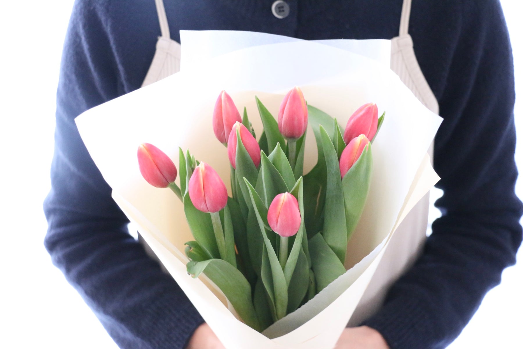 8本の赤色のチューリップを束ねたシンプルで可愛らしい花束です。チューリップは春を代表するお花の一つで、コロンとした可愛い見た目が人気のお花です。