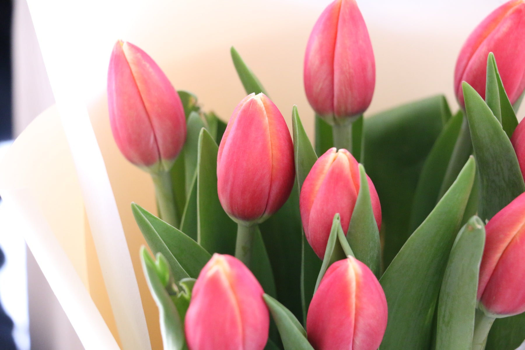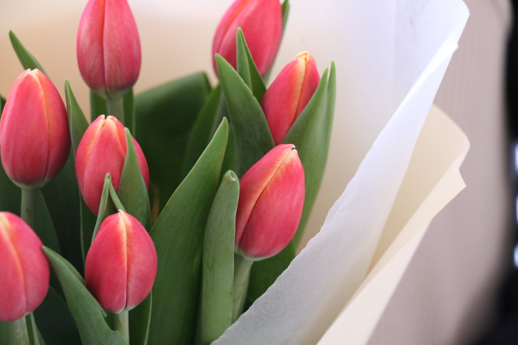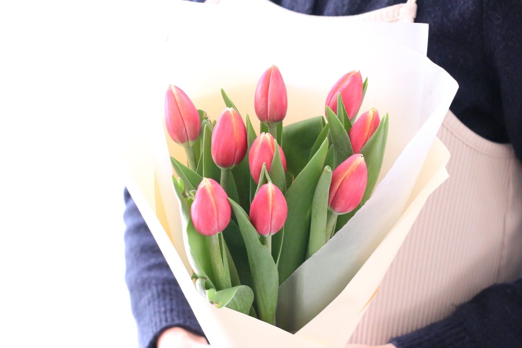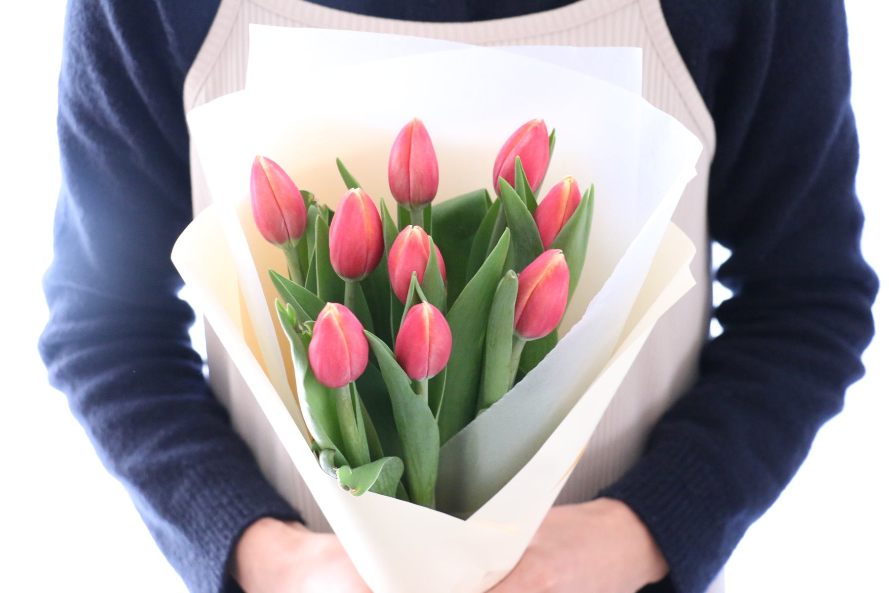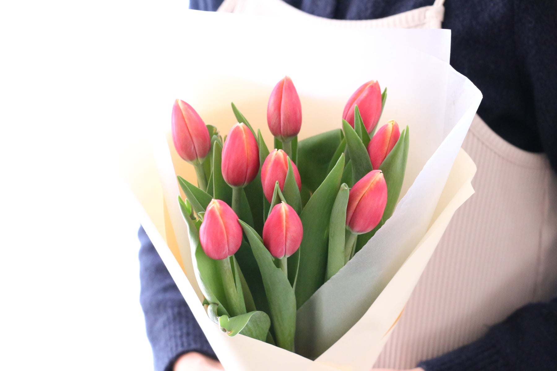 9本の赤色のチューリップを束ねたシンプルで可愛らしい花束です。チューリップは春を代表するお花の一つで、コロンとした可愛い見た目が人気のお花です。