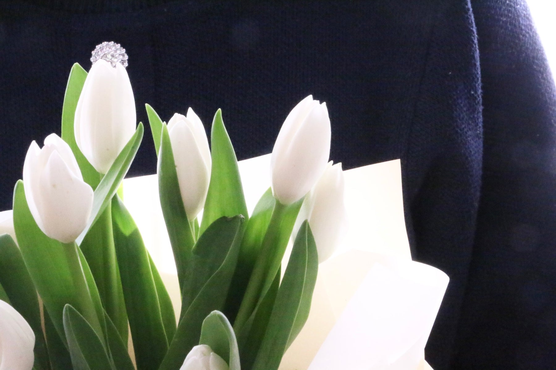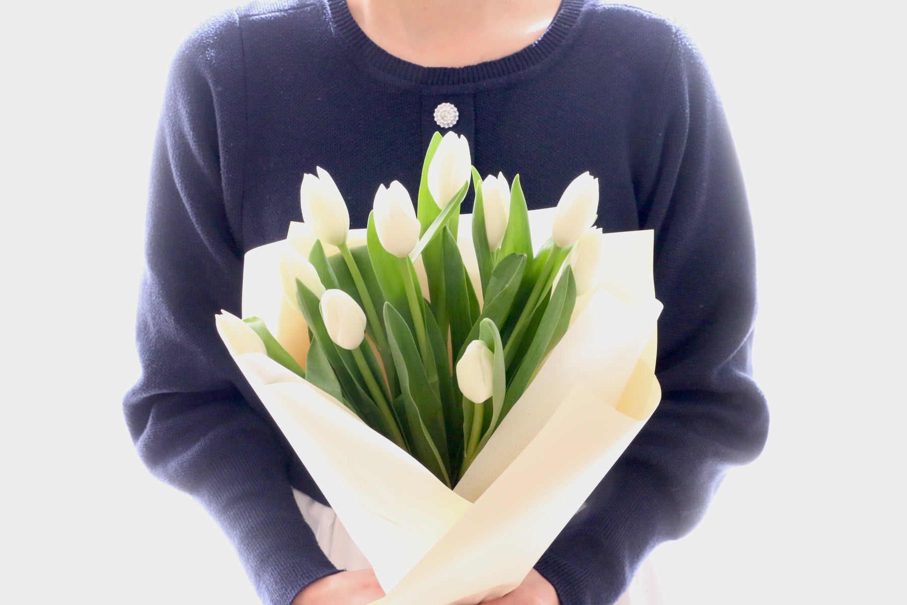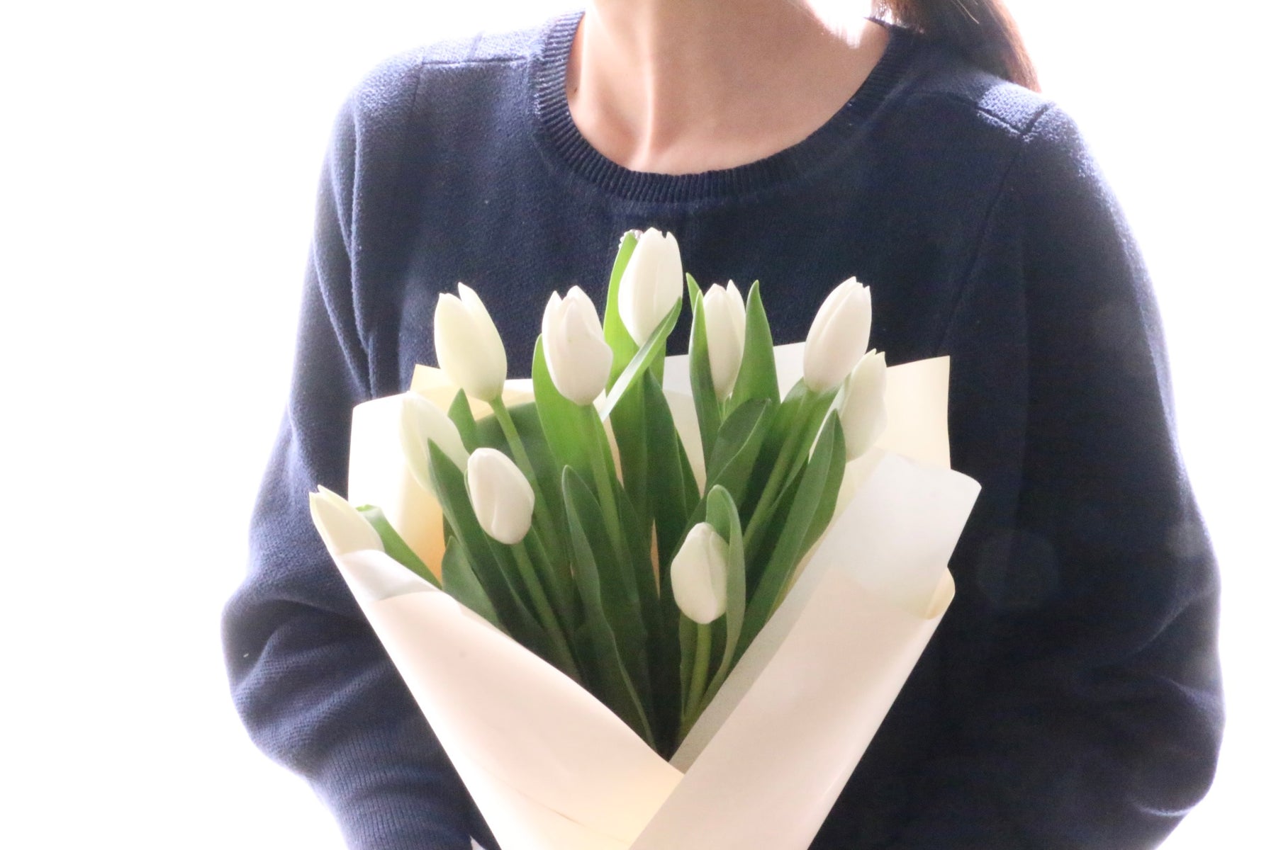10本の白色のチューリップを束ねたシンプルで可愛らしい花束です。チューリップは春を代表するお花の一つで、コロンとした可愛い見た目が人気のお花です。