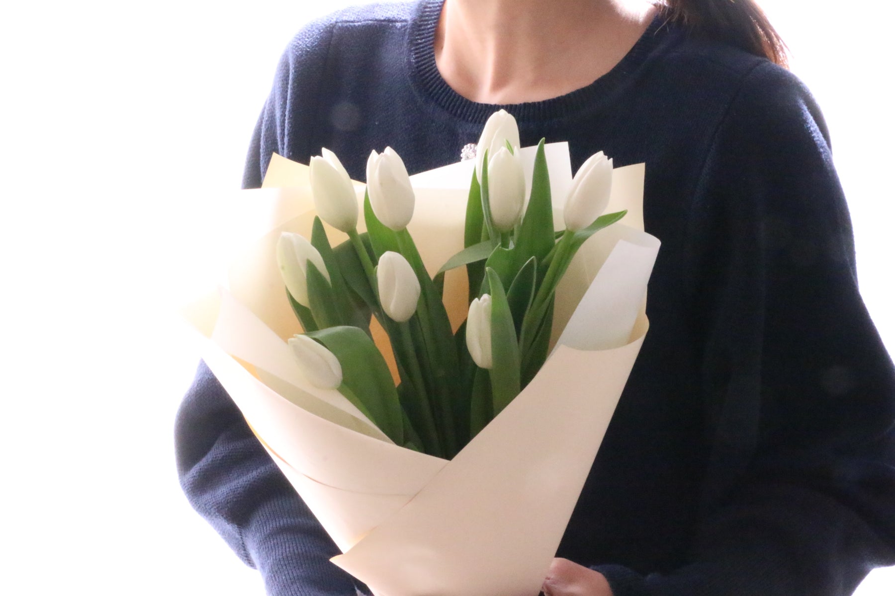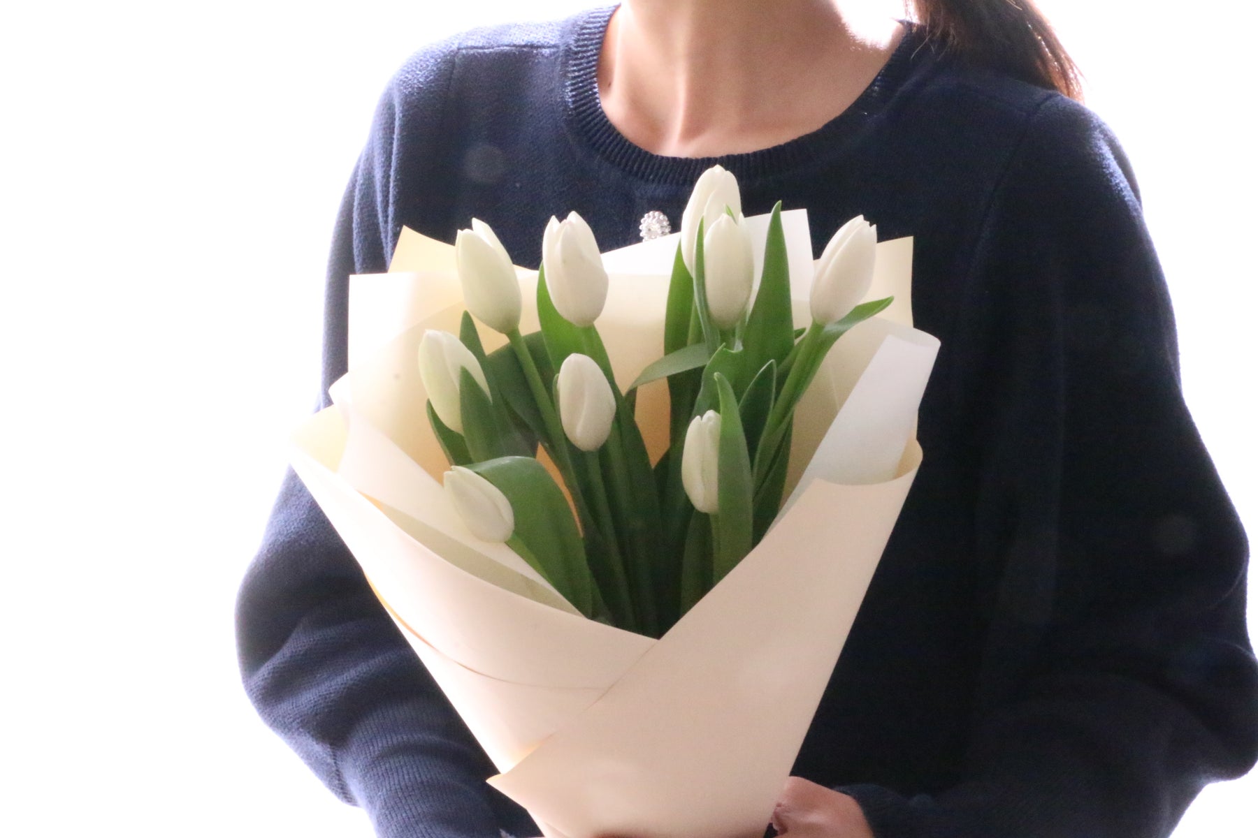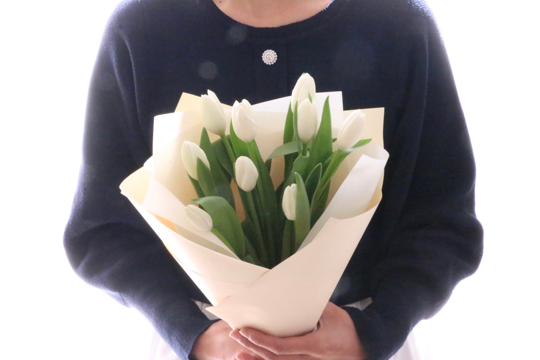 9本の白色のチューリップを束ねたシンプルで可愛らしい花束です。チューリップは春を代表するお花の一つで、コロンとした可愛い見た目が人気のお花です。