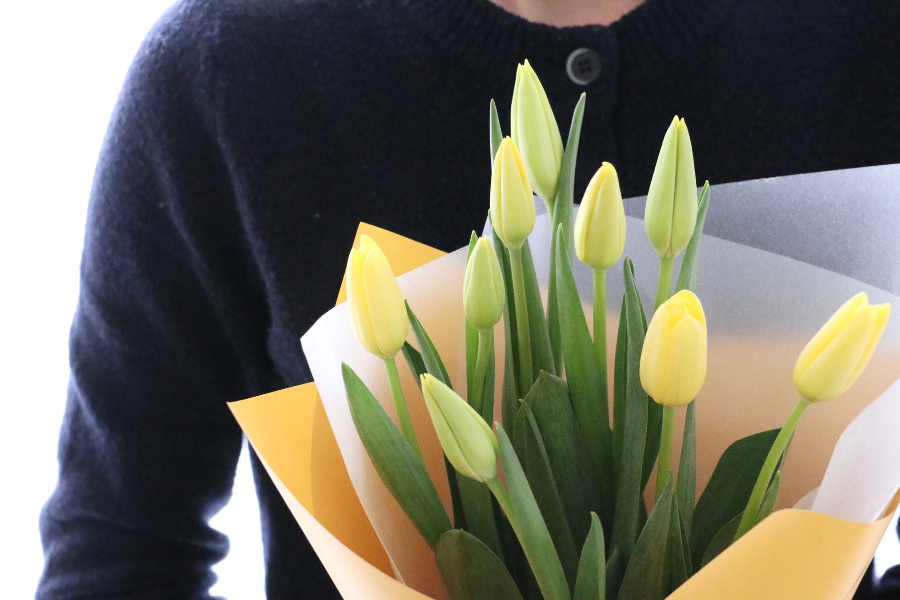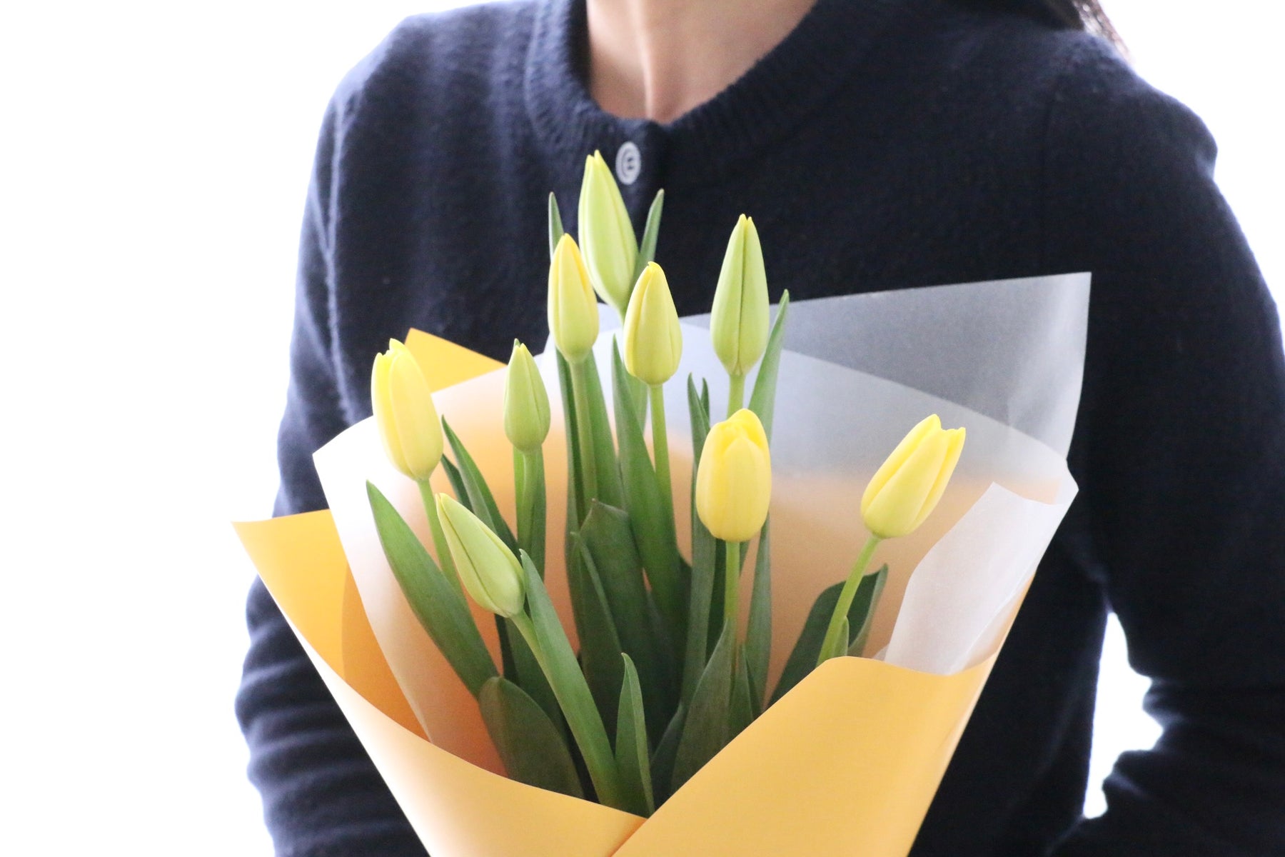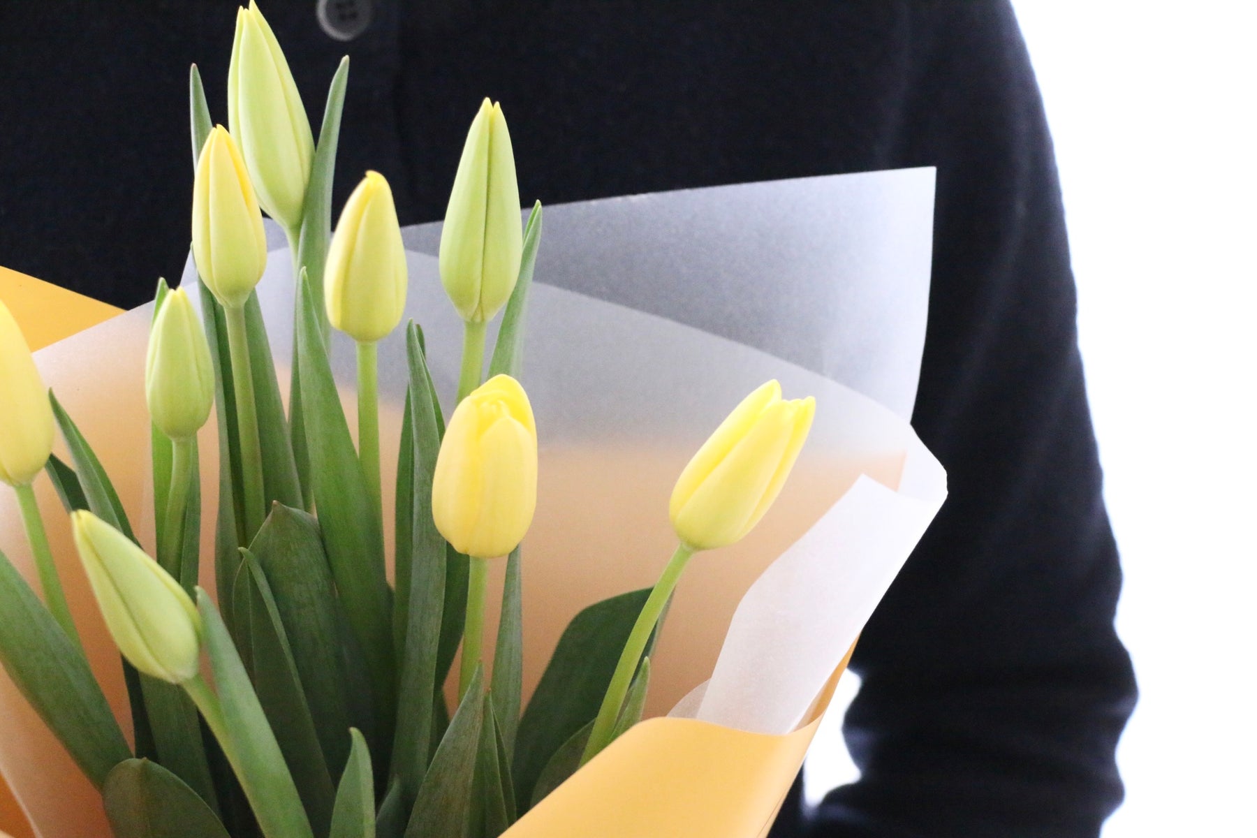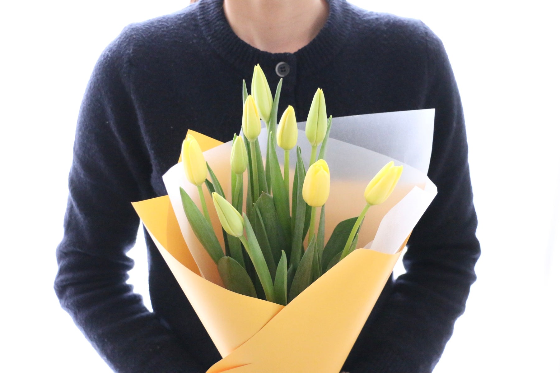 9本の黄色のチューリップを束ねたシンプルで可愛らしい花束です。チューリップは春を代表するお花の一つで、コロンとした可愛い見た目が人気のお花です。