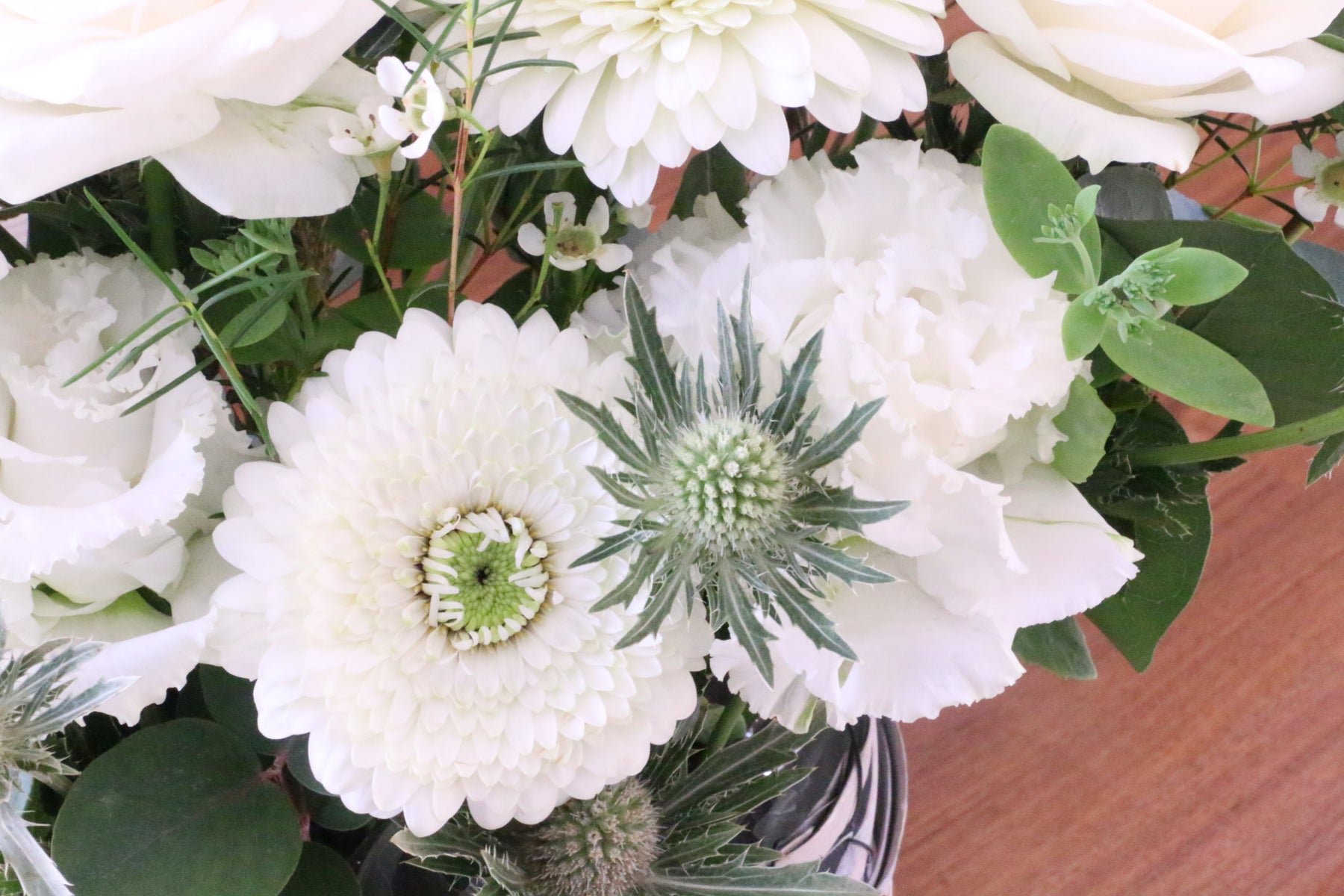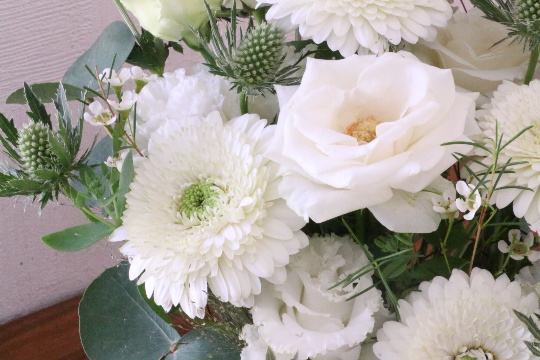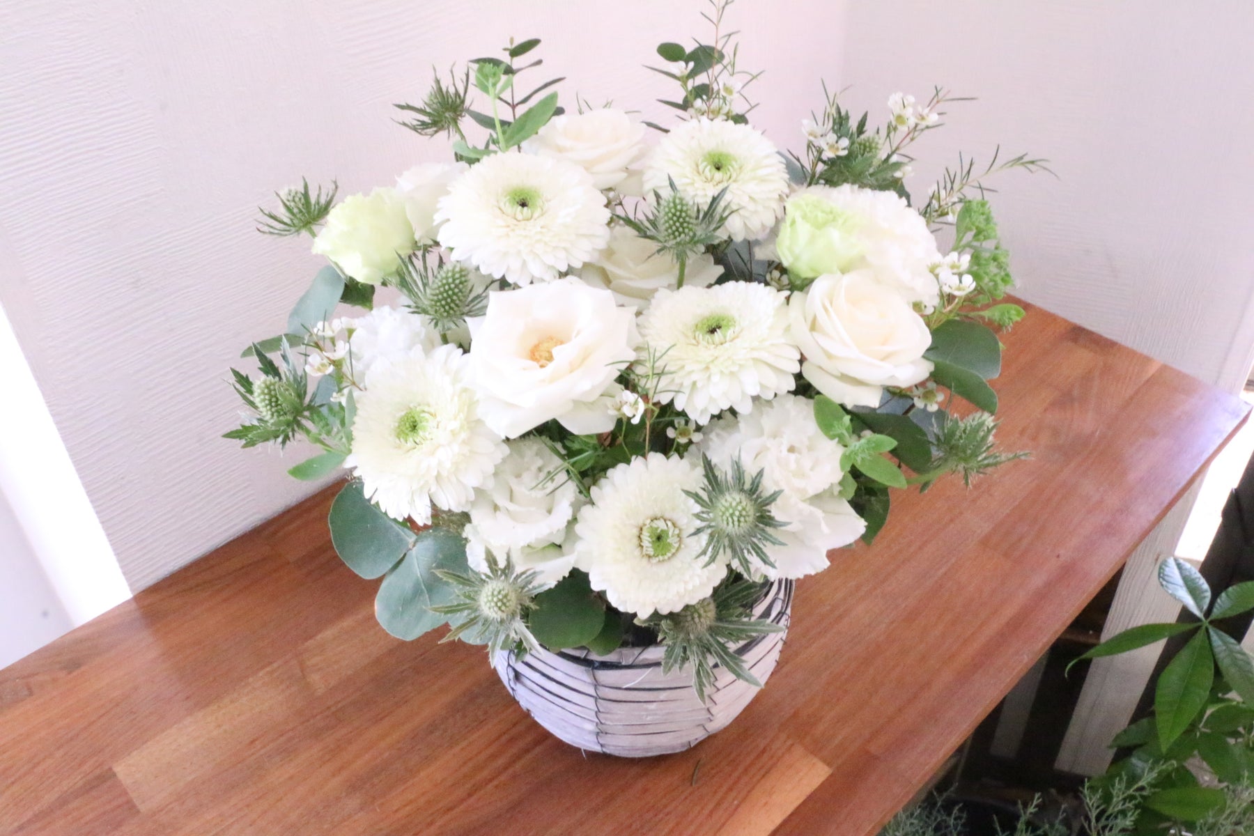 白色のお花をベースに洗練された爽やかな雰囲気で仕上げたアレンジメントです。