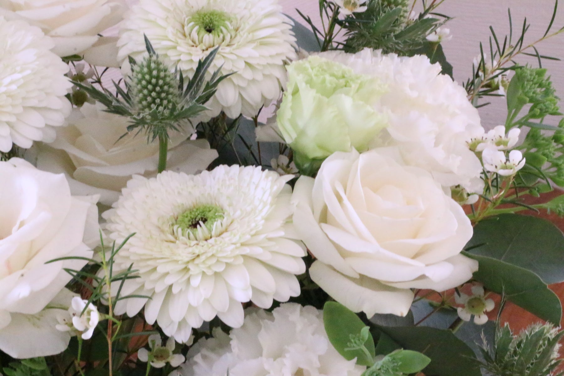 葉物や緑色のお花を入れながら、白色・緑色でまとめます。